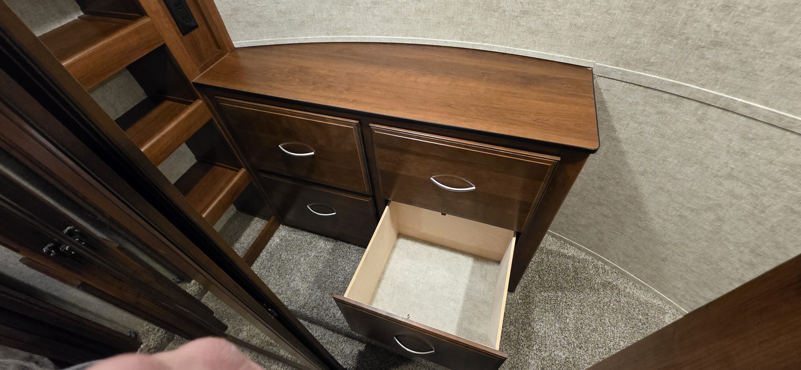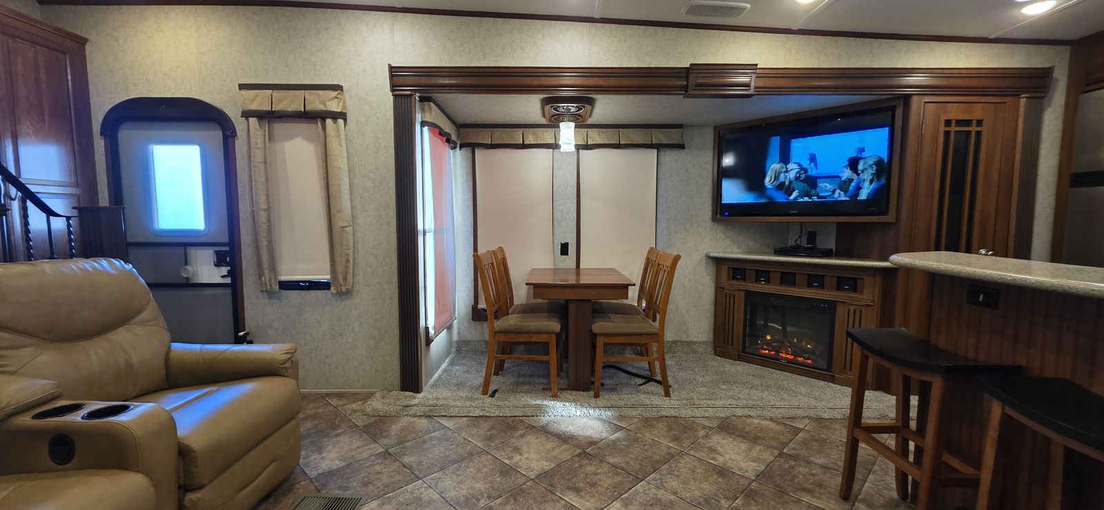 Rear kitchen layout (super open and functional) Larger fridge with tons of storage 42 ft luxury fifth wheel 3 slide-outs – huge living space New 14-ply tires (ready to tow anywhere) Hydraulic auto leveling Dual A/C units Four season package (enclosed & heated underbelly) Solid surface countertops Fireplace + entertainment center Washer/dryer hookups Private front bedroom + large bathroom