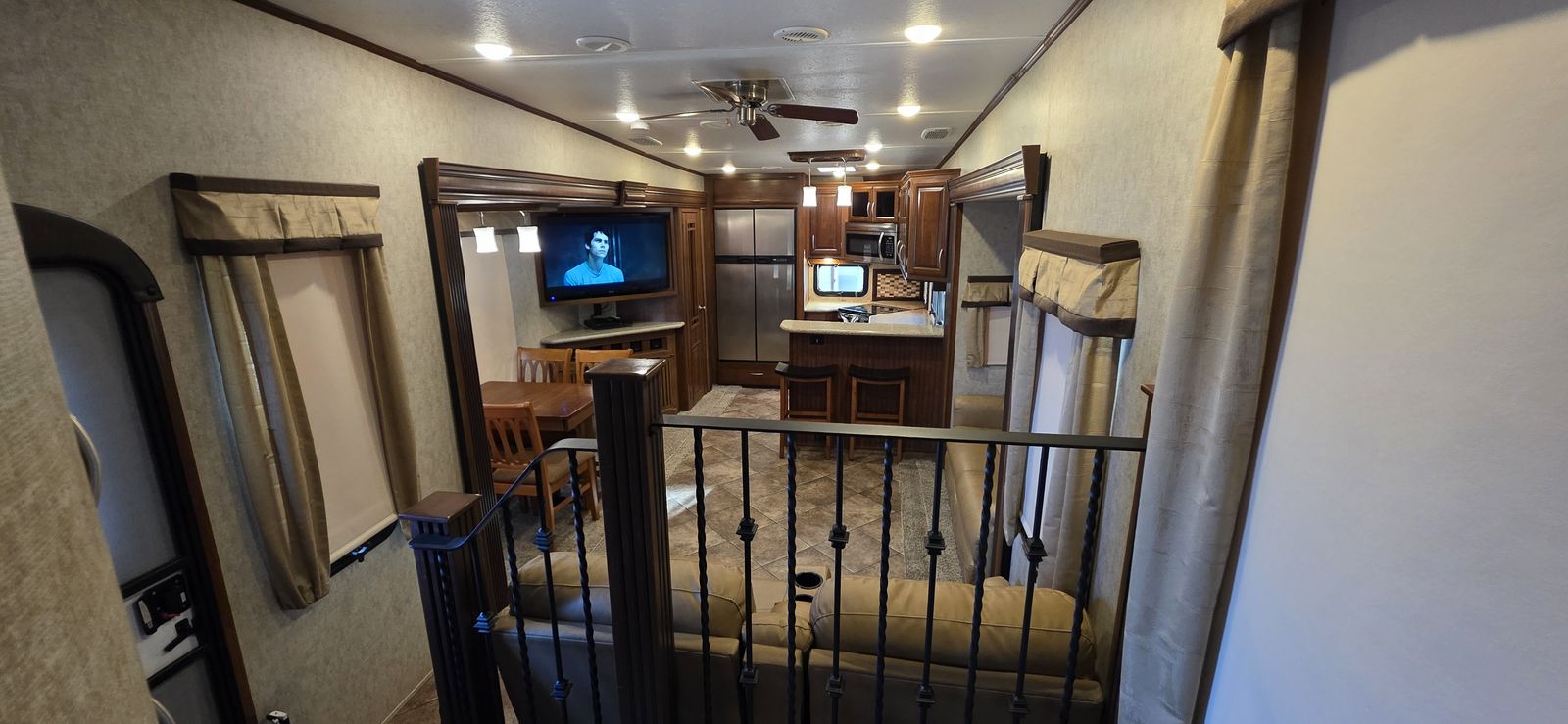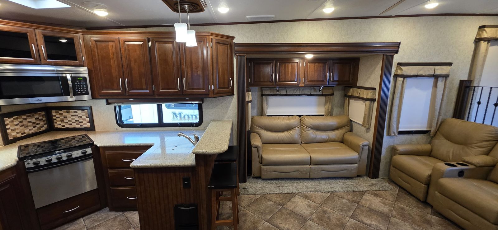 This is a high-end luxury fifth wheel with a very open floor plan and one of the best layouts you can get — rear kitchen with tons of counter space and storage.