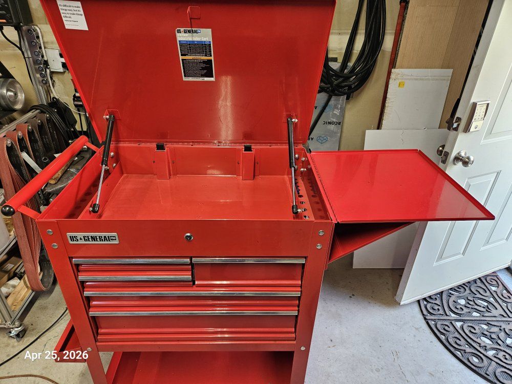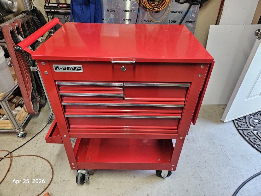 Venmolike condition, all the drawers open and close smoothly. it has 2 swivel locking casters. each drawer has a latch on it to keep it closed. it also has a small rack on one side and a foldable shelf on the other. missing the key.