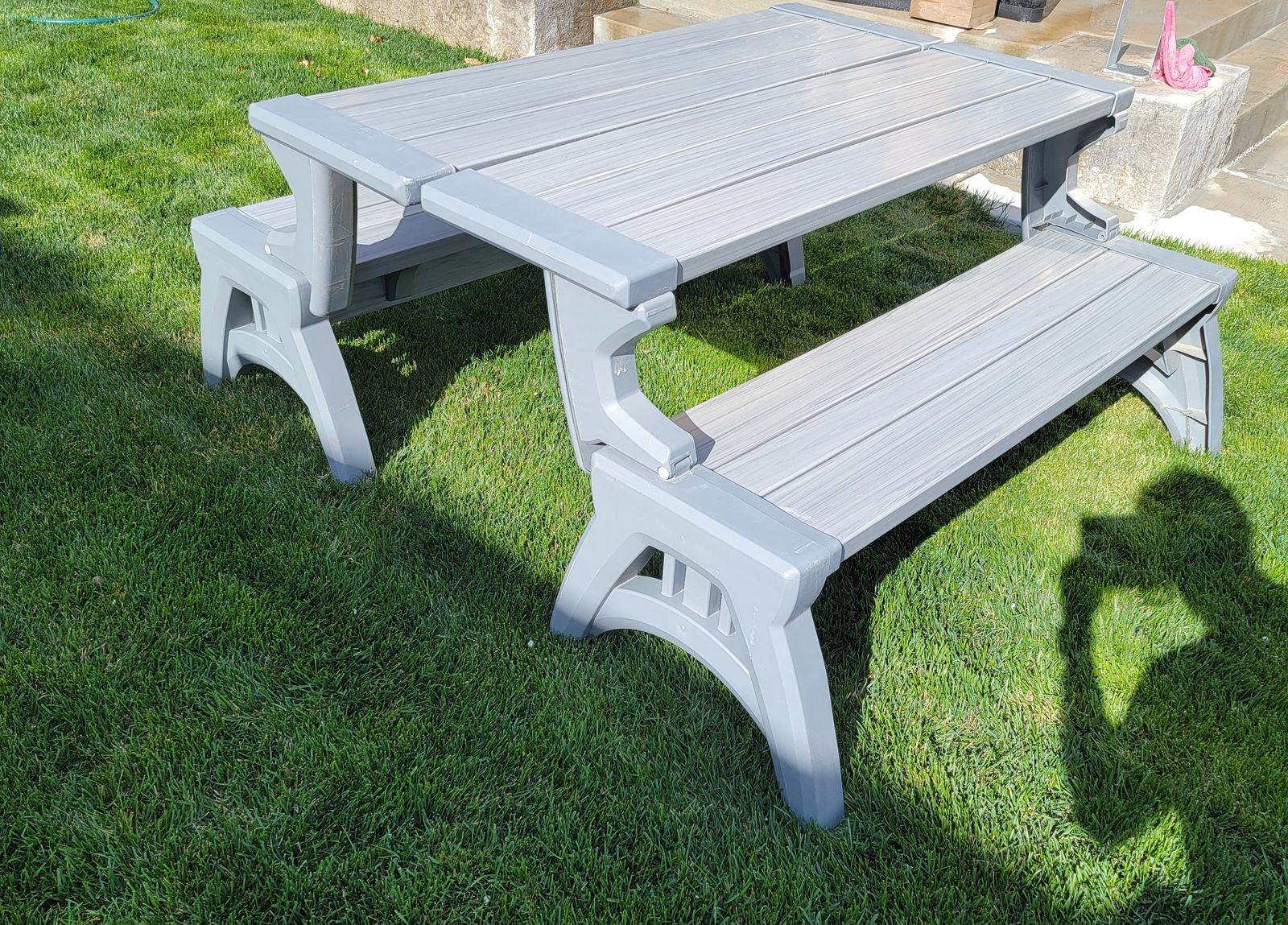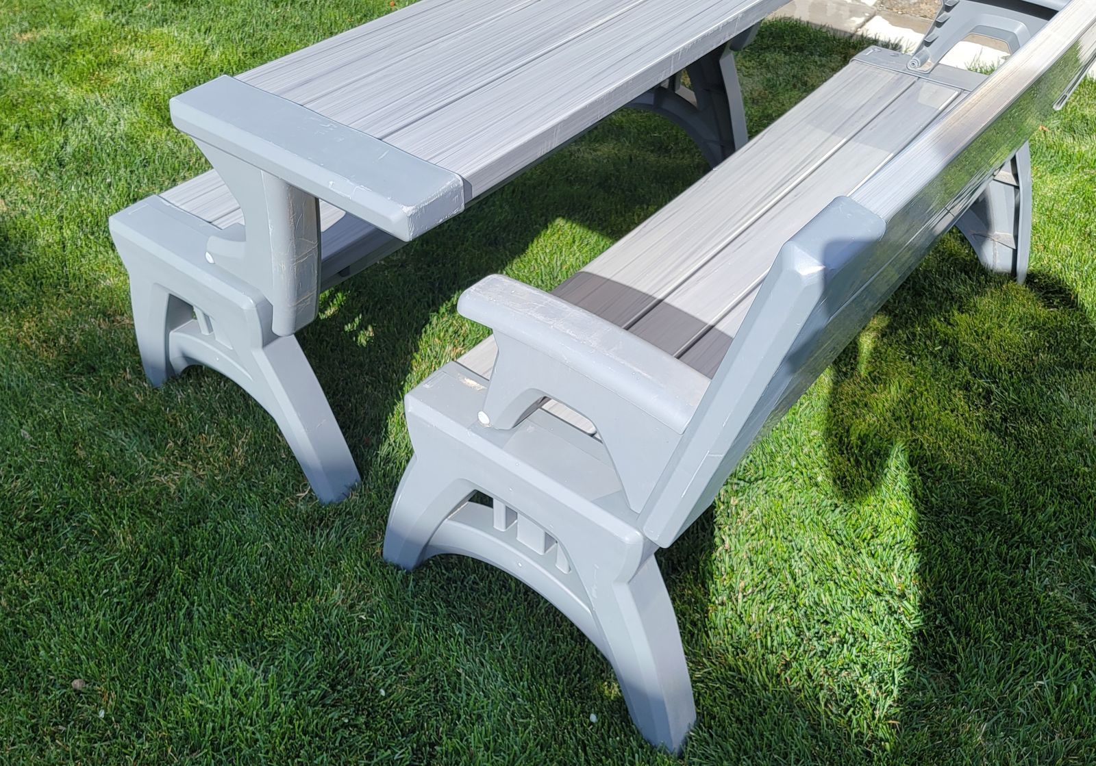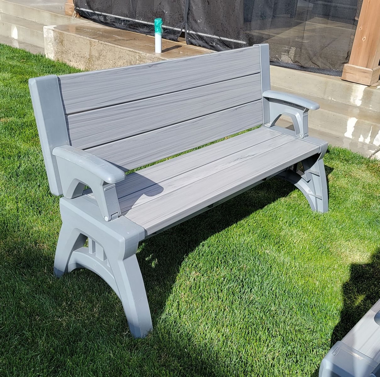 Weatherproof benches with backs that cleaverly fold to create a picnic table. Very cool design. Includes 2 bench pads.