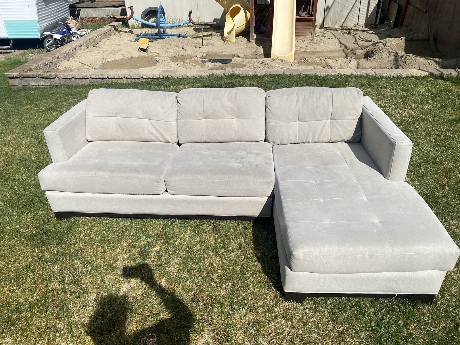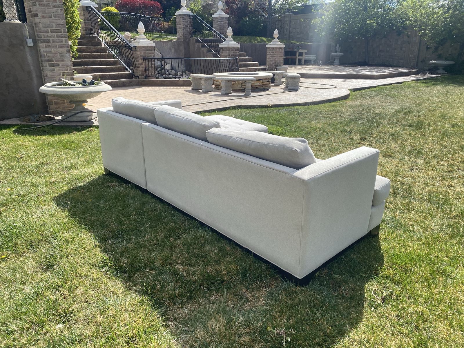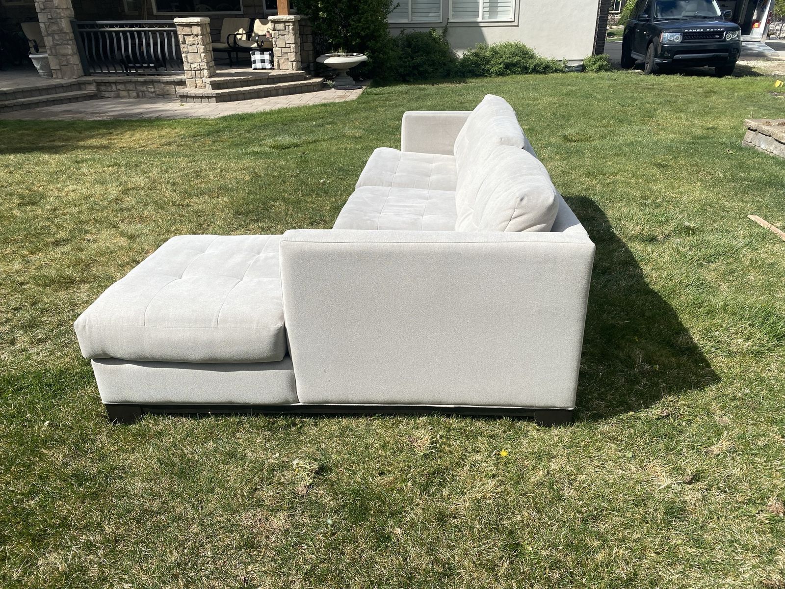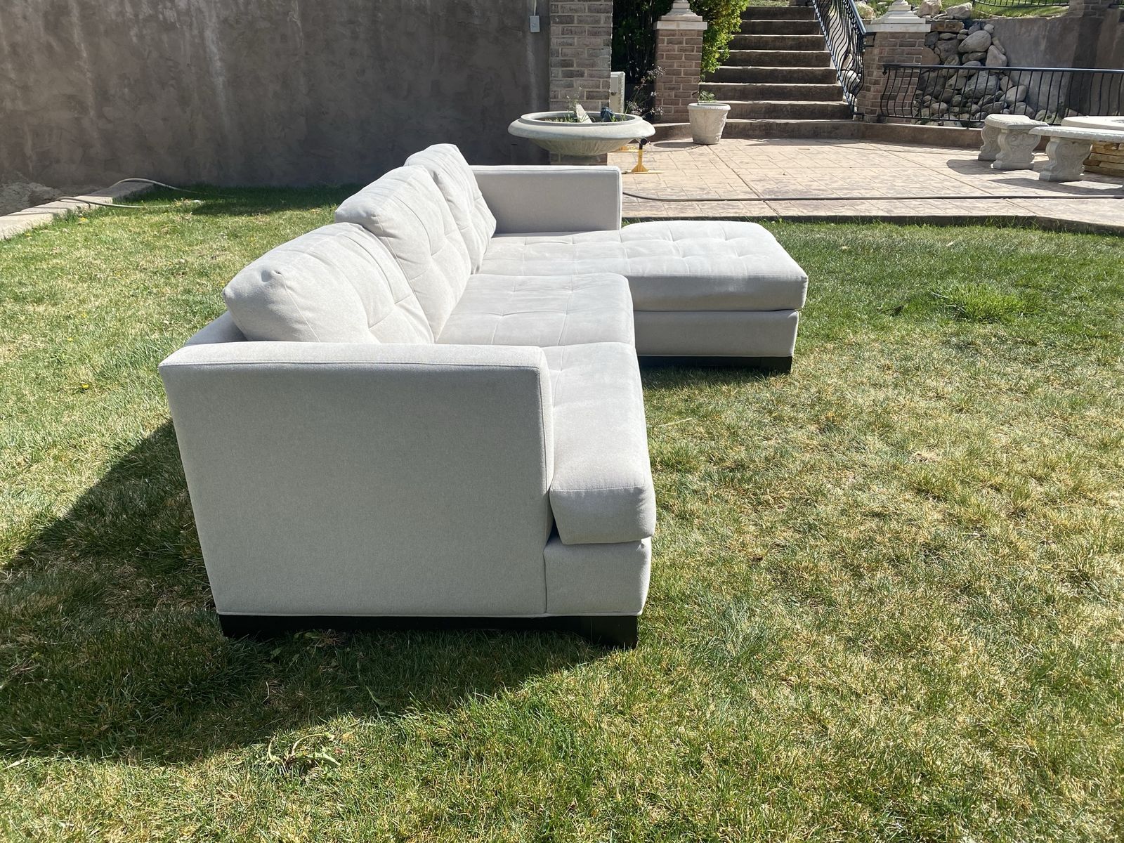 SIZE: roughly 8.5’ x 5.5’ Large L-Shape Sectional Couch — Light Beige** Beautiful, comfortable sectional couch in a soft light beige color. Spacious L-shape design with tufted back cushions and plush seating, perfect for a living room, family room, or bonus space. Includes an attached chaise for extra lounging room and a versatile neutral look that matches almost any décor.