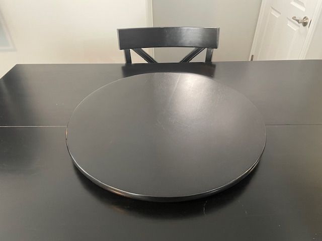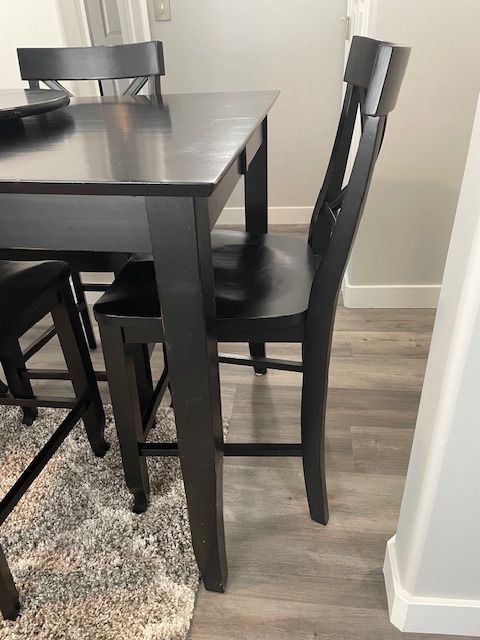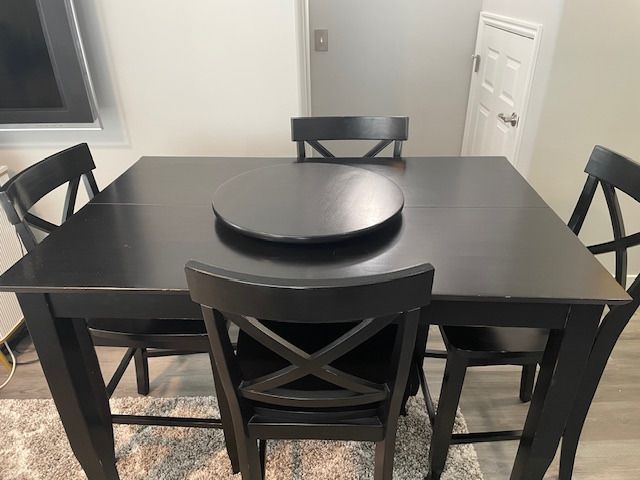 ApplePayBlack high top table / Pub table / Counter height table and chairs in really great shape, just a few small scratches on edges, easily touched up. Attached leaf, extend to square or save space as is. Comes with awesome, matching lazy susan. 36" w x 54" l Expanded with leaf to 54" x 54". Chair seat height = 24". Top of chair back = 41".