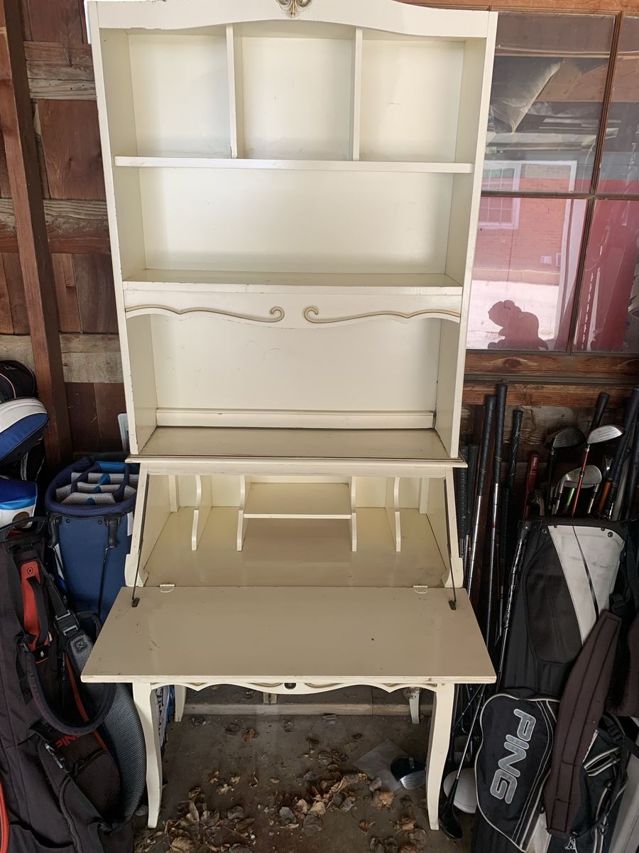 VenmoBeautiful mid-century French Provincial secretary desk with an integrated hutch. This is a versatile, all-in-one piece that works perfectly as a dedicated workspace, a bookshelf, or a statement piece for an entryway or bedroom.