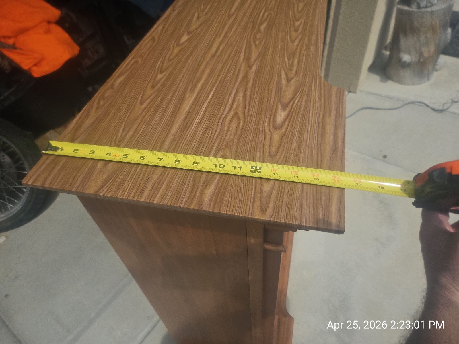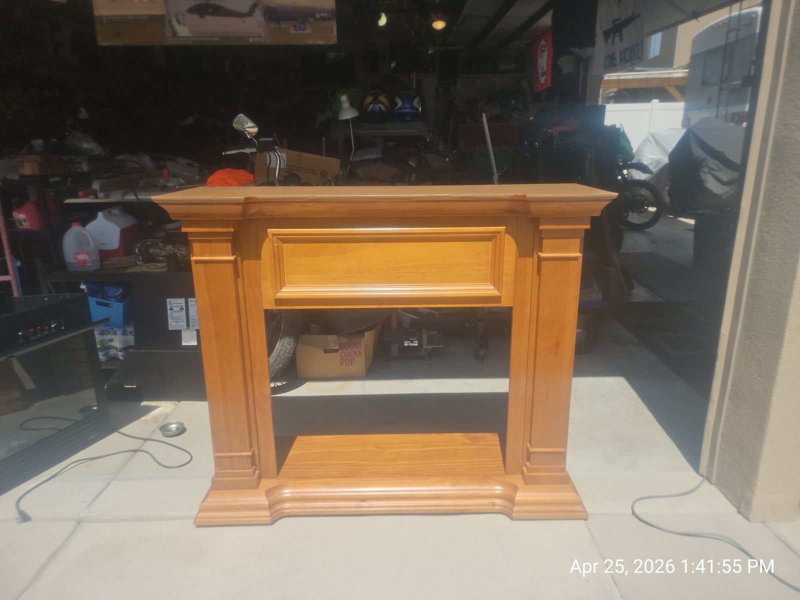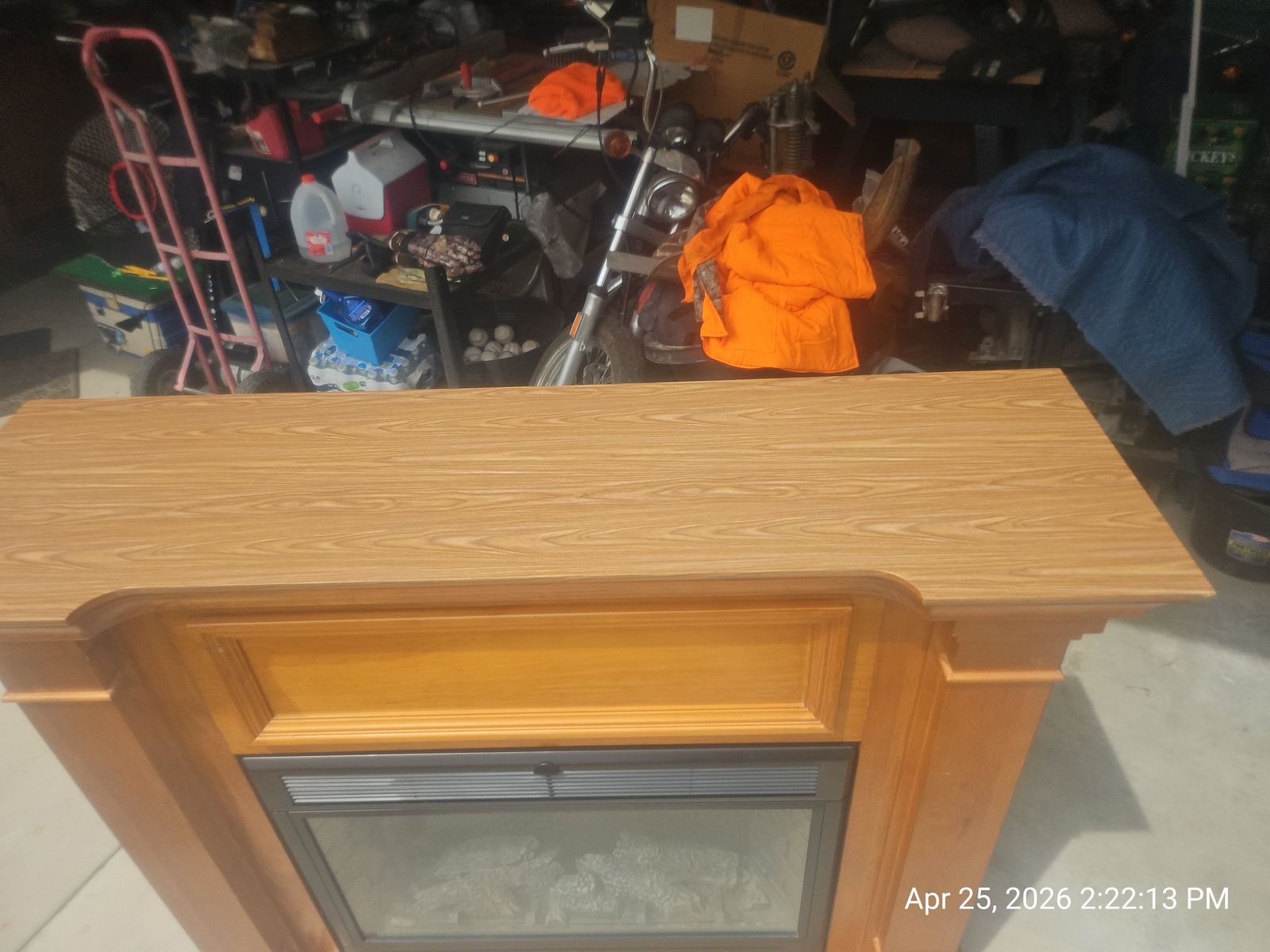 The top piece of wood (mantel) is scuffed up and bit dented from a big screen TV. It can be refinished if wanted. In lieu of refinishing the wood I put a sheet of contact paper over the top to cover it as a temporary aesthetic fix.... looks good