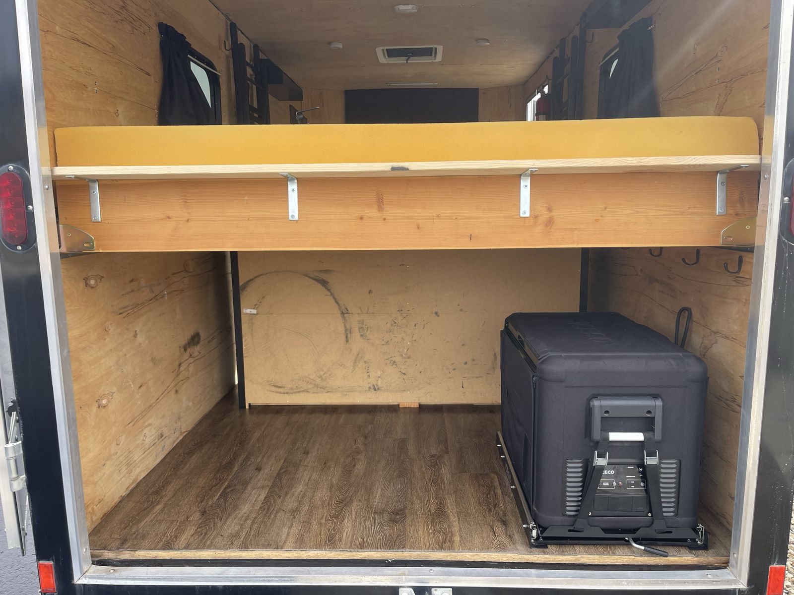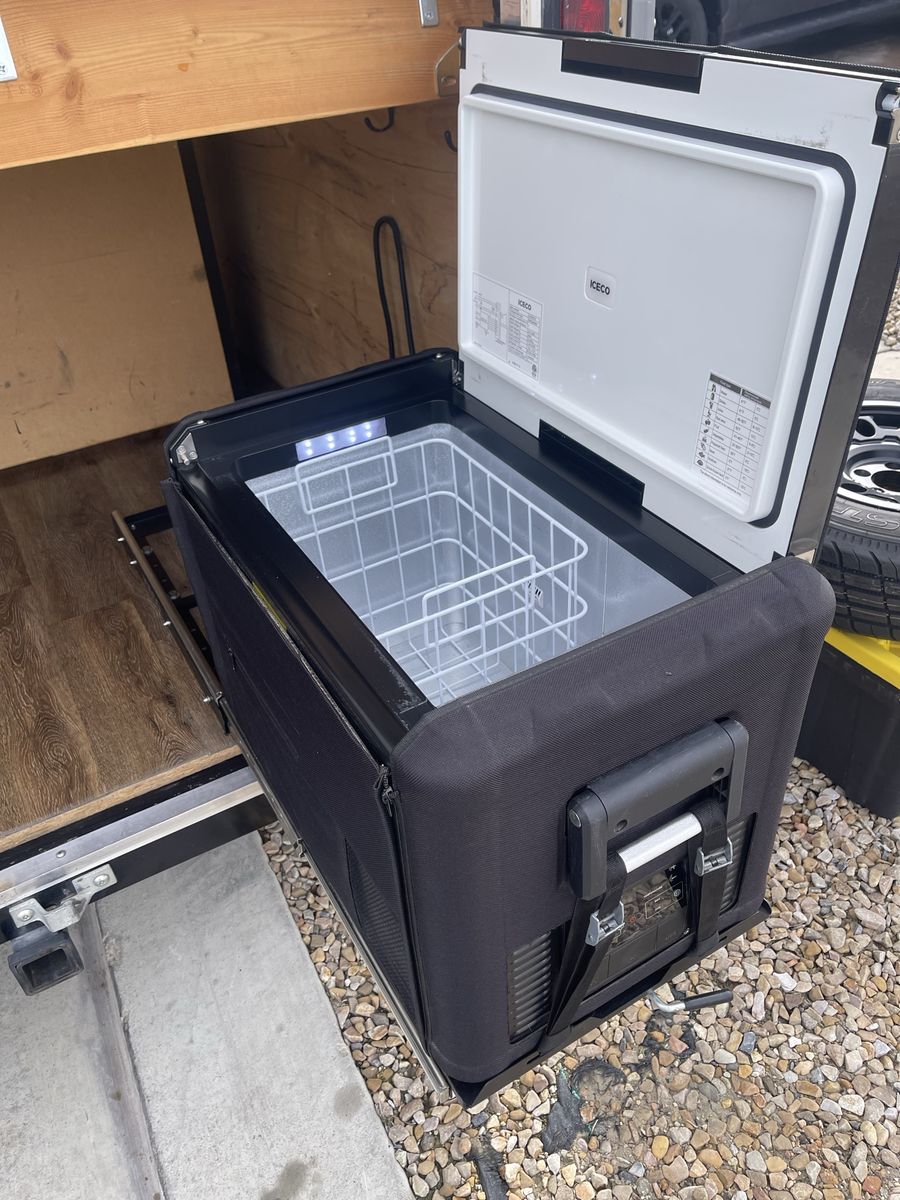 -12V Iceco fridge/freezer mounted in the back of the trailer. It’s on a track to slide out for easier access