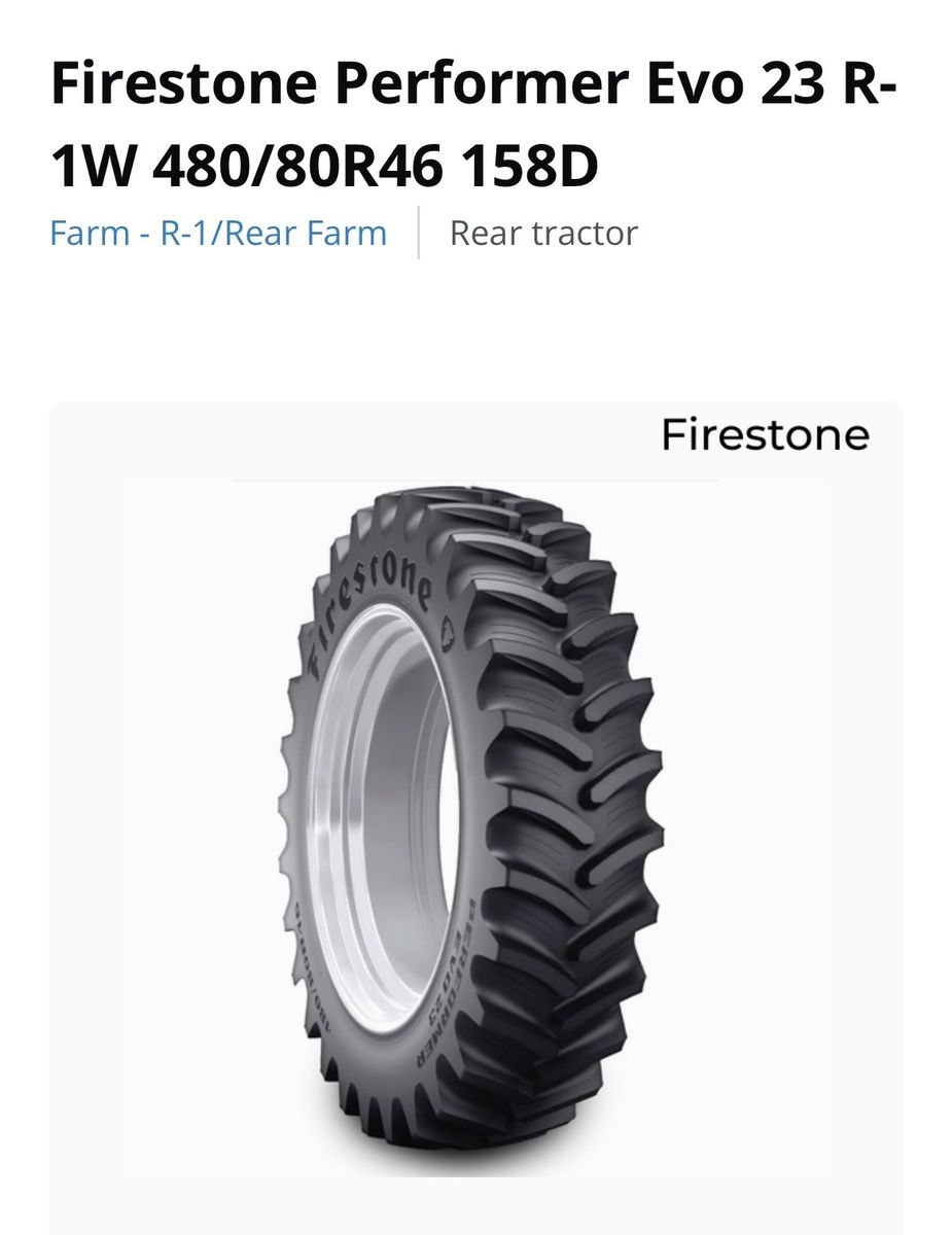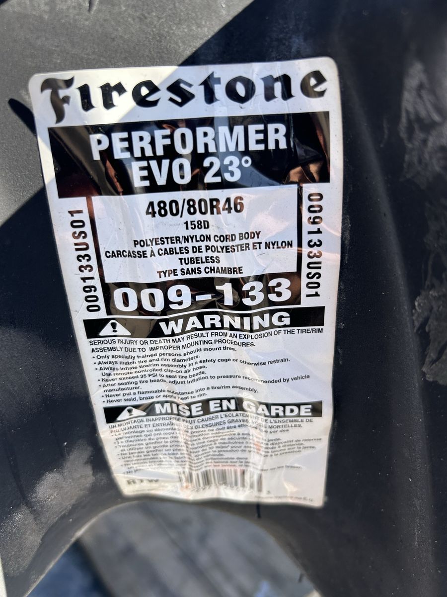 480/80R46 Firestone Performer Evo 23 R-1W Decided to go with a different model New, never mounted just ordered them in . $1600 ea. Mitch 4356305593 Delivery Available