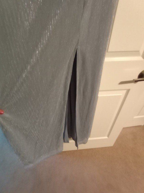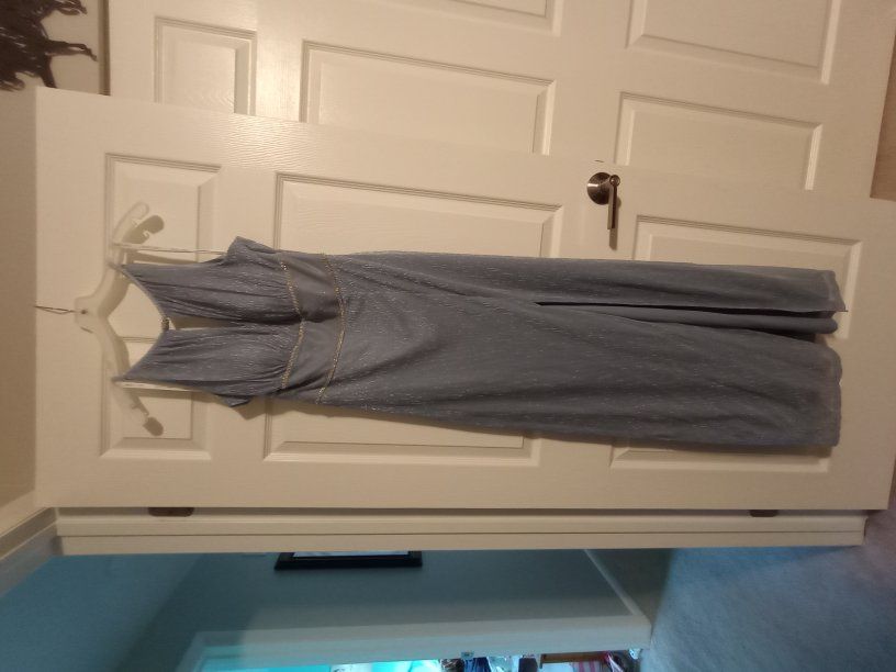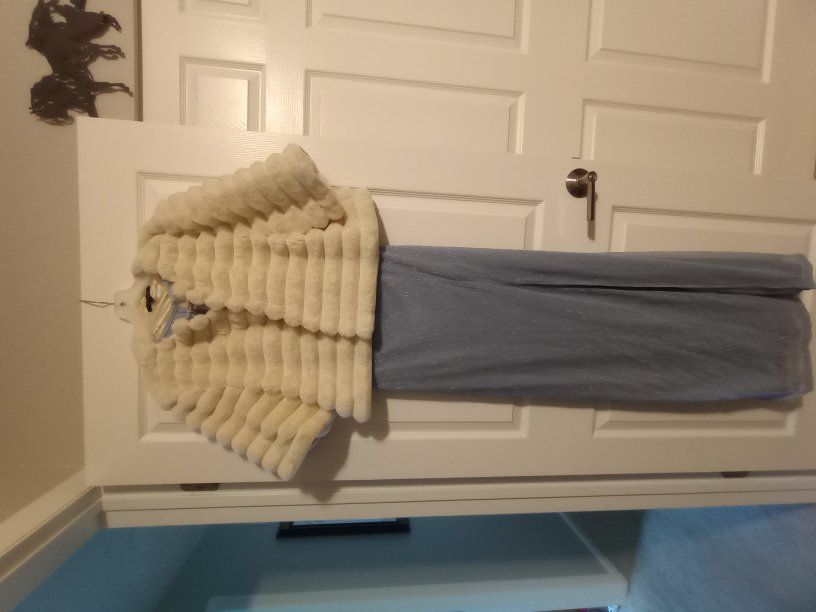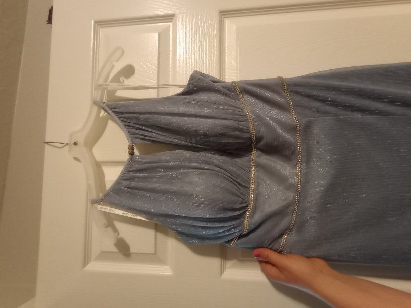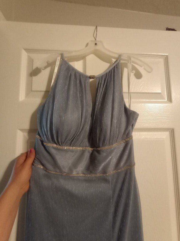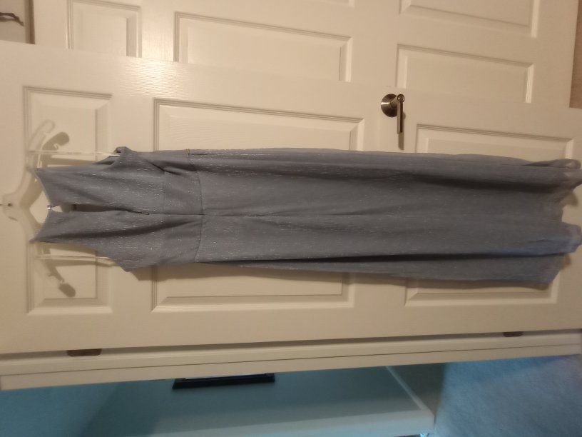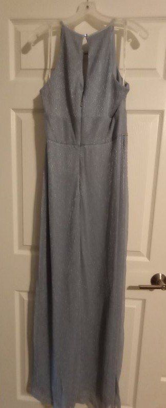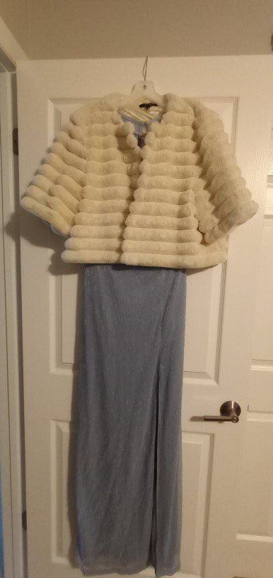 VenmoOleg Cassini, size 10, light sparkly blue. has a slit on the left side. worn only once. also have a short sleeve soft white faux fur jacket, size large. only worn once