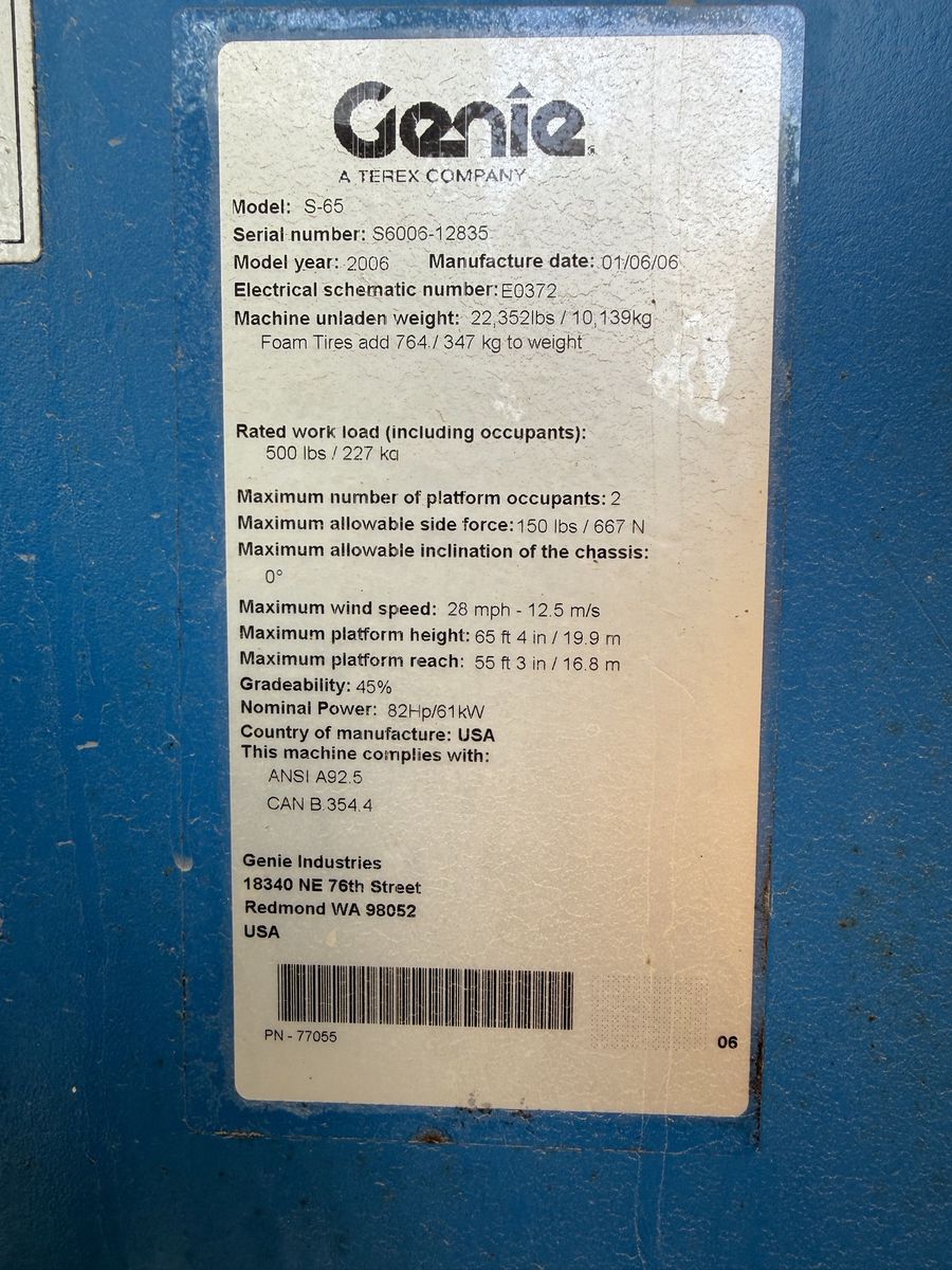 2006 Genie S65 for sale. 5426 hours. Just serviced, new plugs and oil change. Ready to work, delivery available for fee.