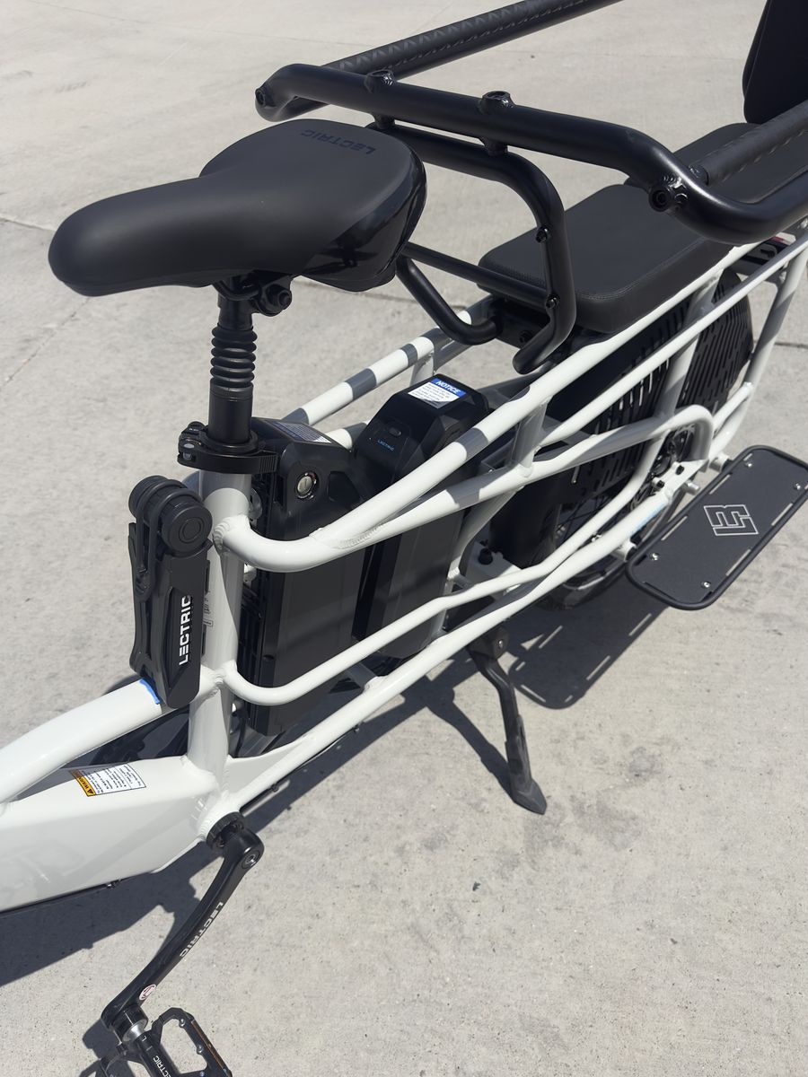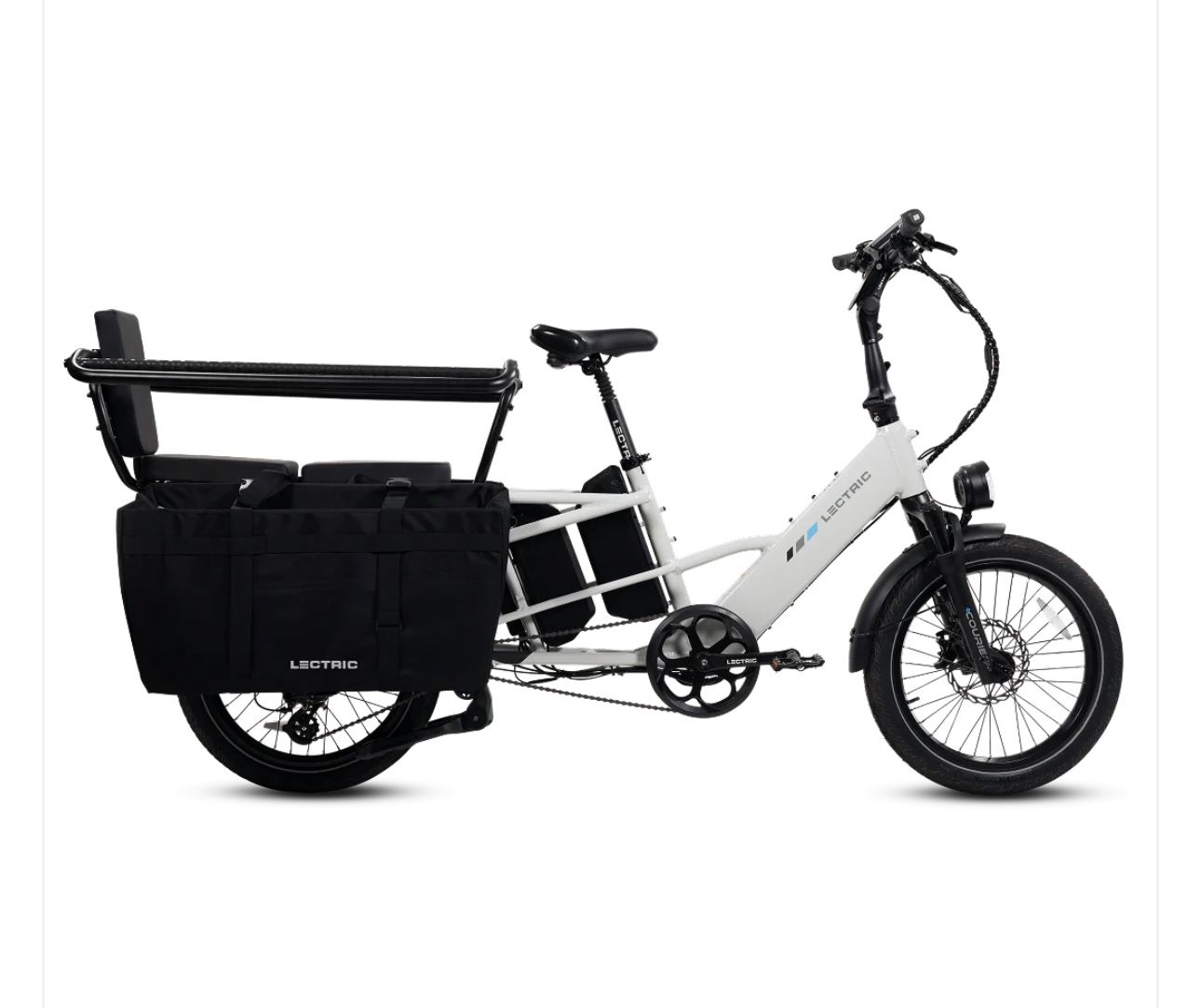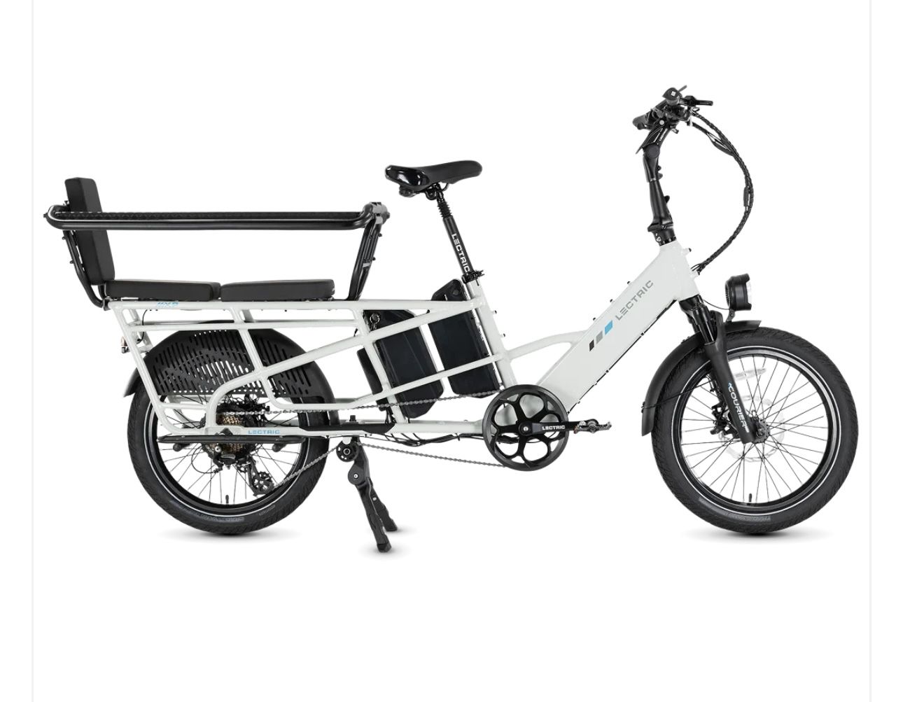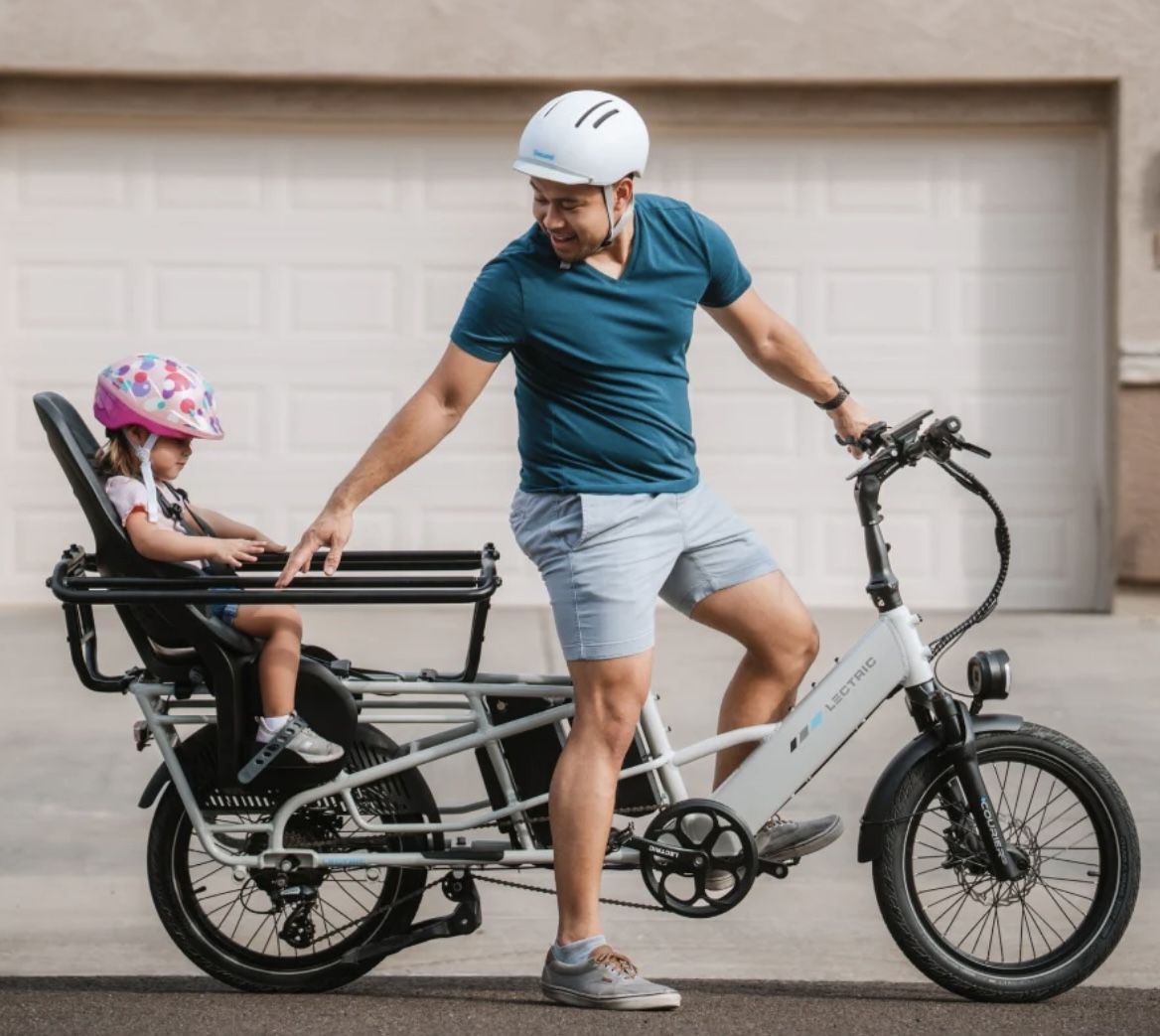 Lots of included accessories: - phone mount - eBike bell - (2) Mirrors - LECTRIC metal bike lock w/ keys - Running Boards - Elite Headlight - Suspension Seat Post - Orbitor rear basket to corral kids/cargo - (2) XL Cargo Bags - Fast charger - (2) Rear rack cushions