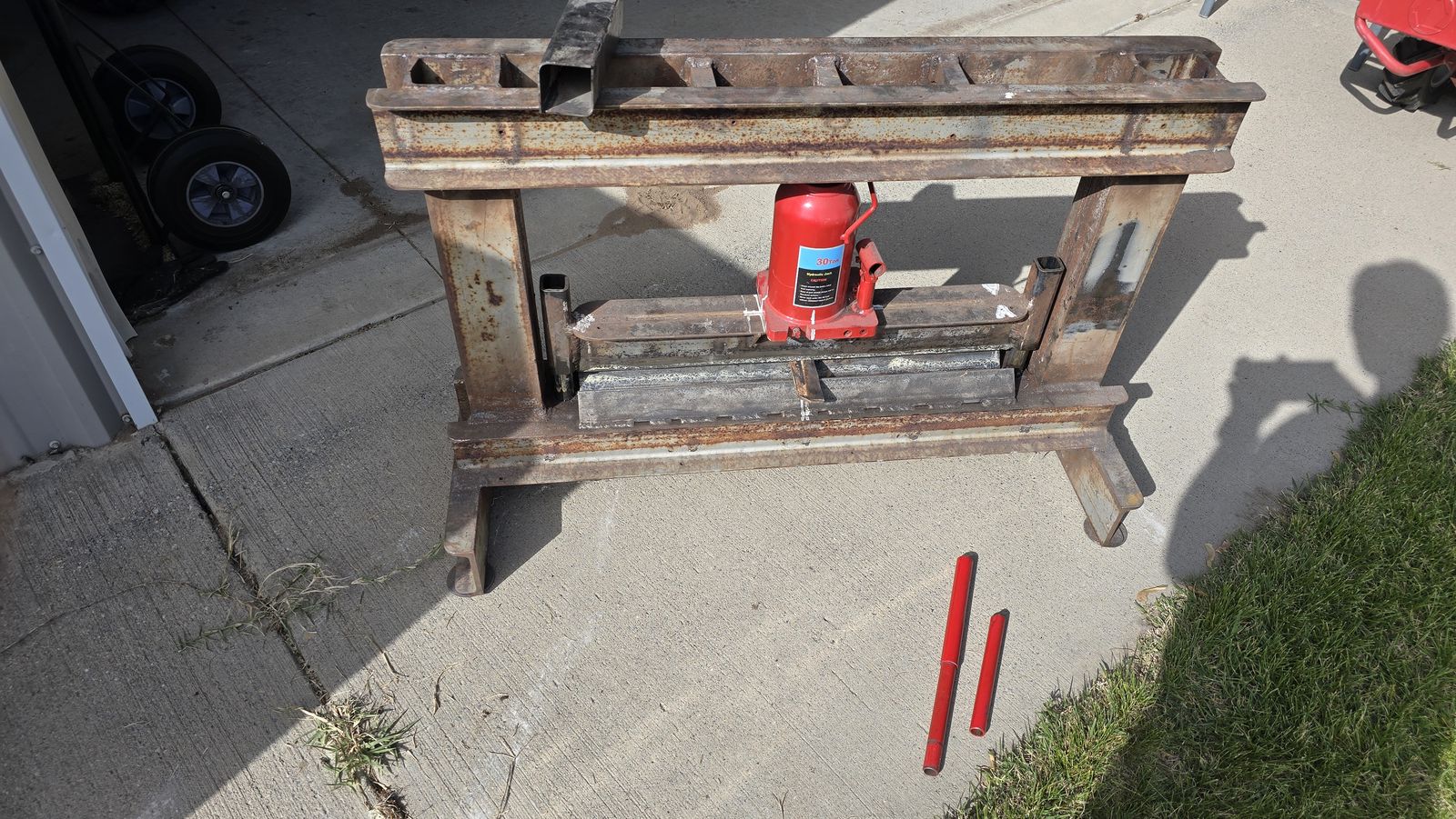 Built press to bend metal or make square tubes up to 12 gauge metal and 25 3/5 in long. I used this to make a trailer. Comes with 30 ton hydraulic press.