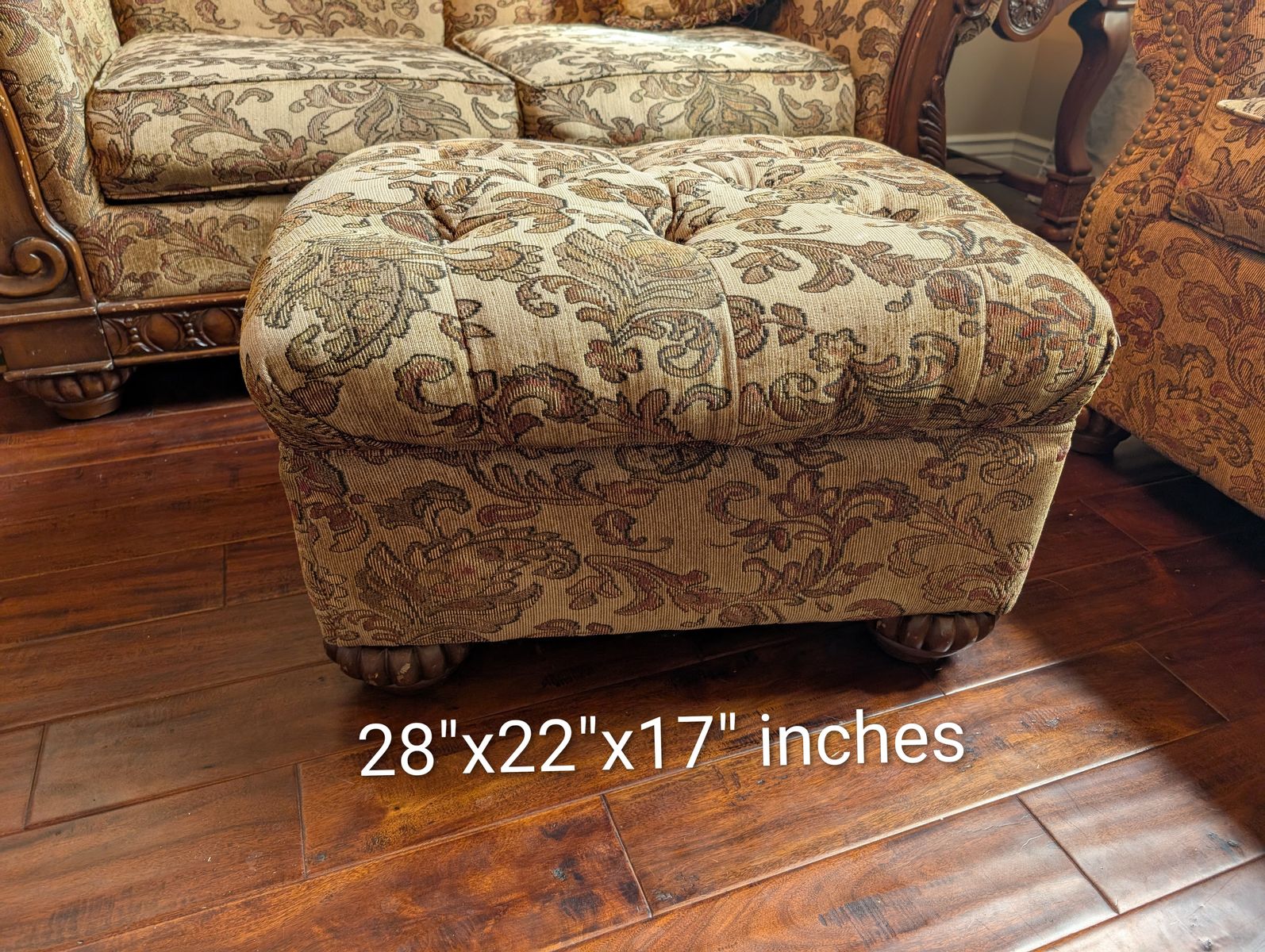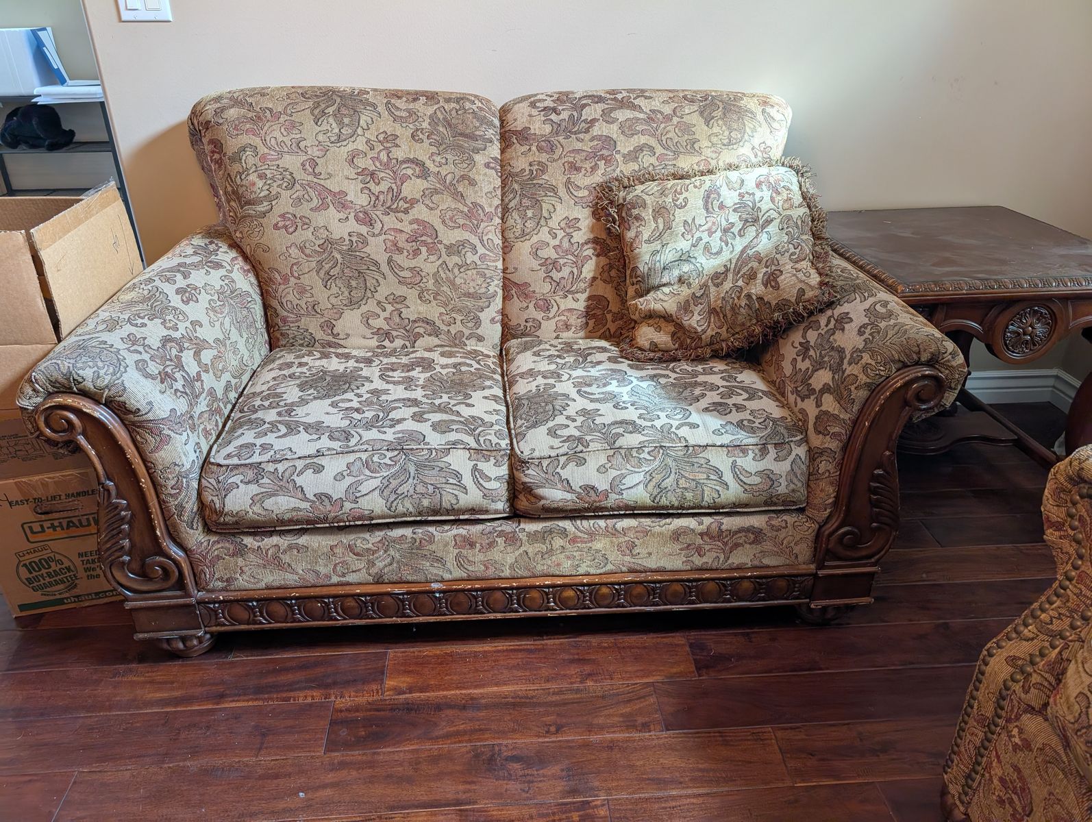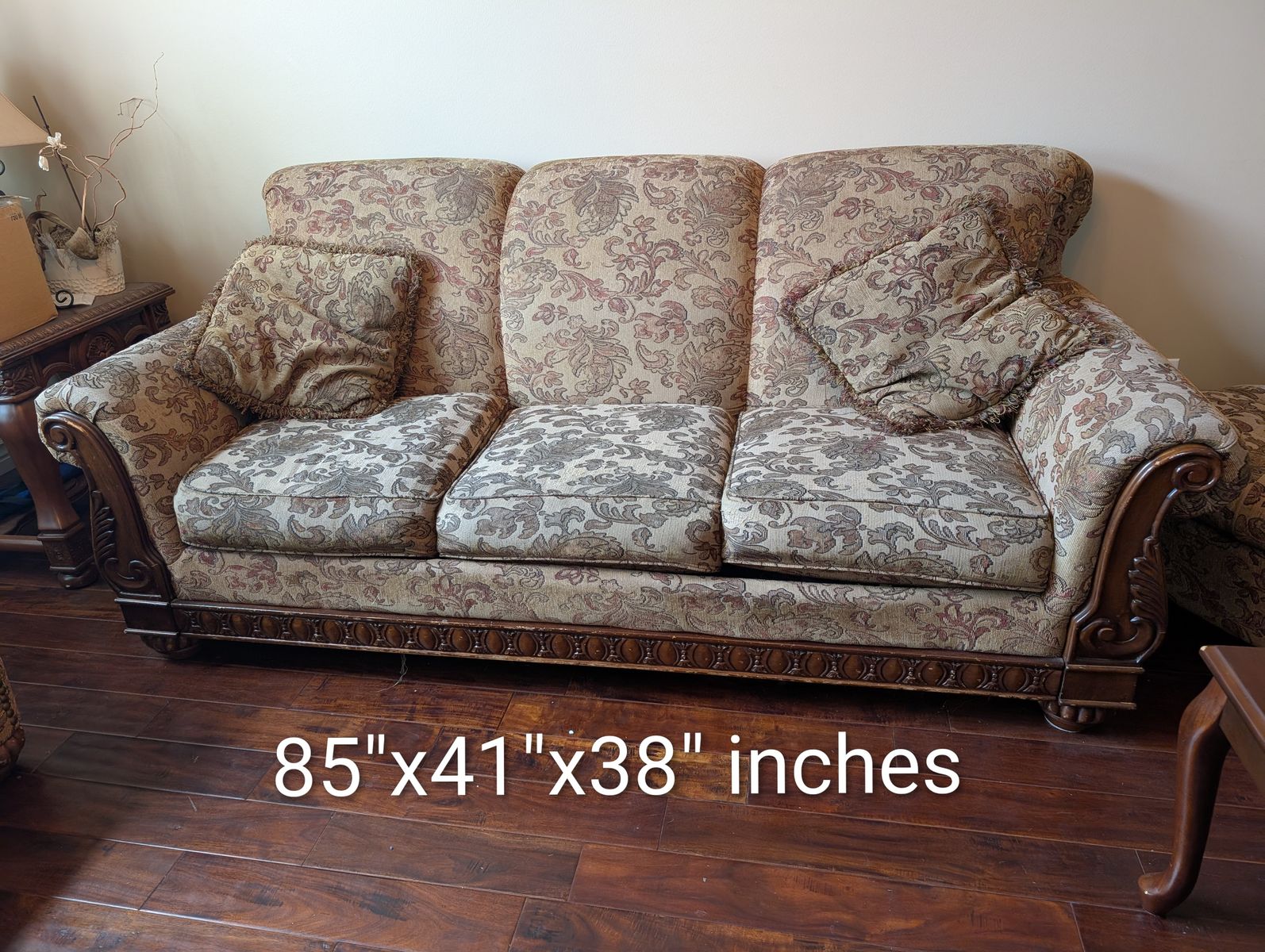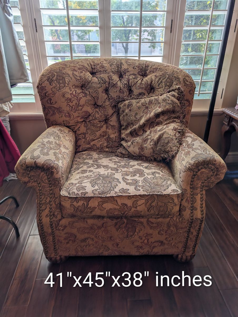 PayPalThis sofa set has a couch, loveseat, and a matching chair. It also includes two square end tables, a coffee table and a taller narrow table. The dimensions are in the photos. They are located in Farmington. Happy to help load, but will not deliver.