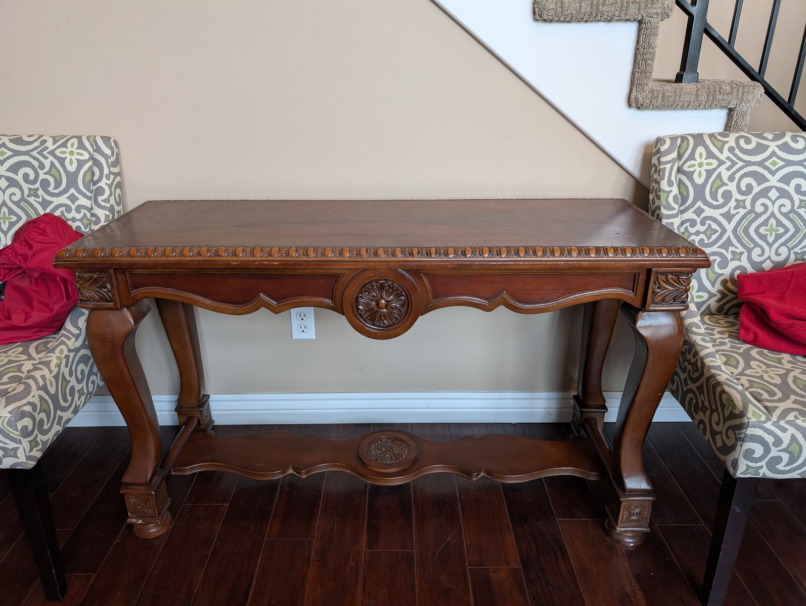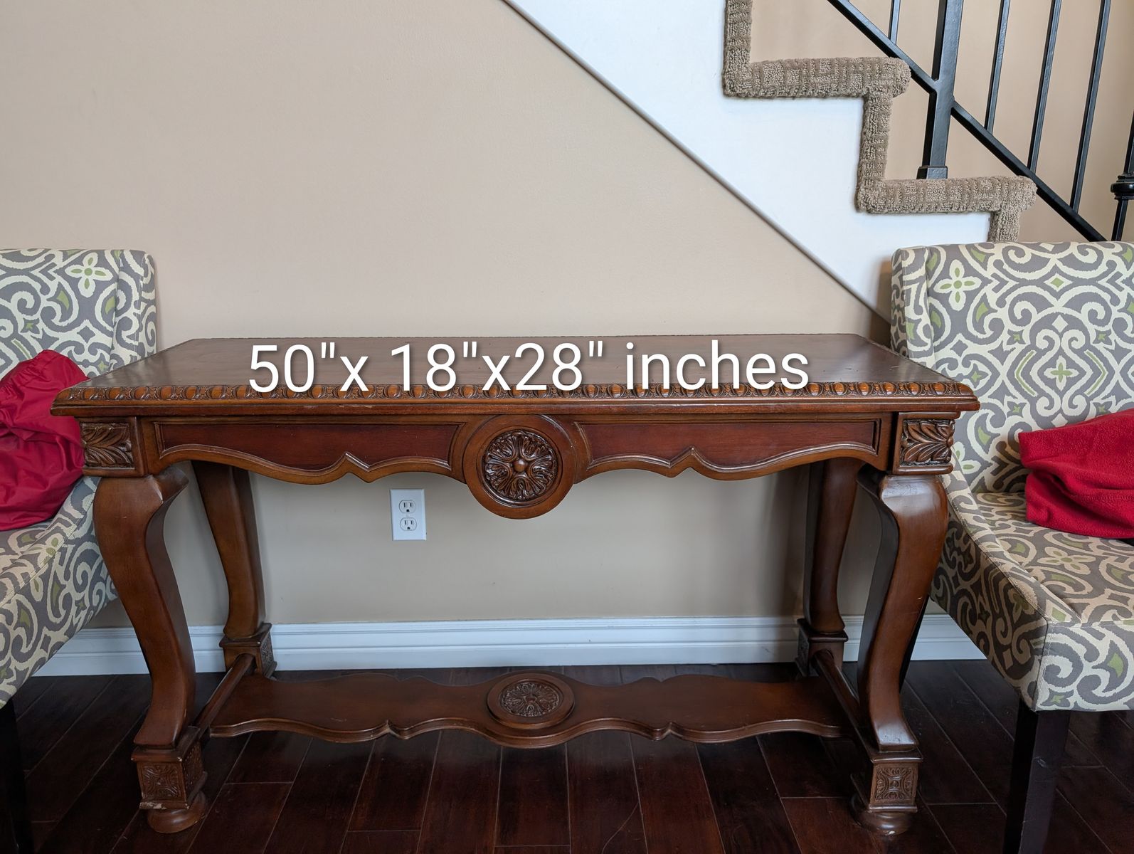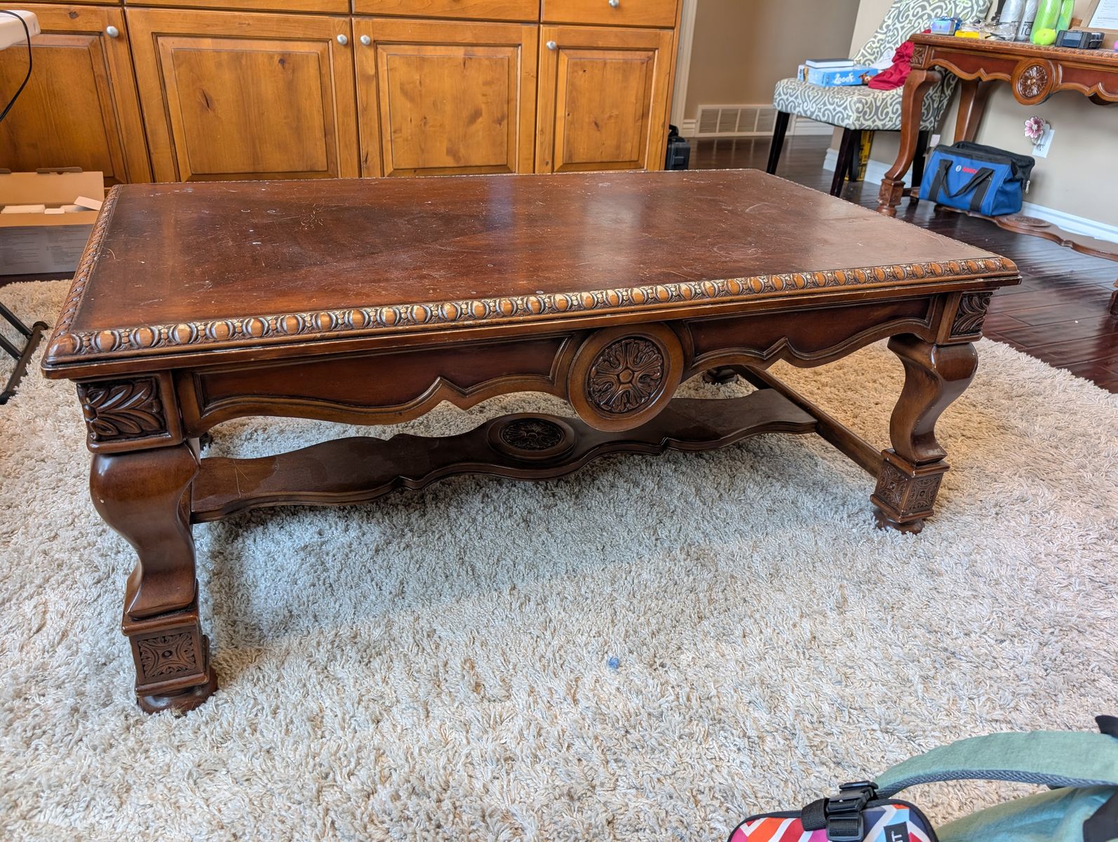 PayPalThis sofa set has a couch, loveseat, and a matching chair. It also includes two square end tables, a coffee table and a taller narrow table. The dimensions are in the photos. They are located in Farmington. Happy to help load, but will not deliver.