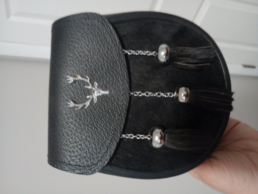 Venmoblack fur sporran with a silver stag head on it with tassels. used once.