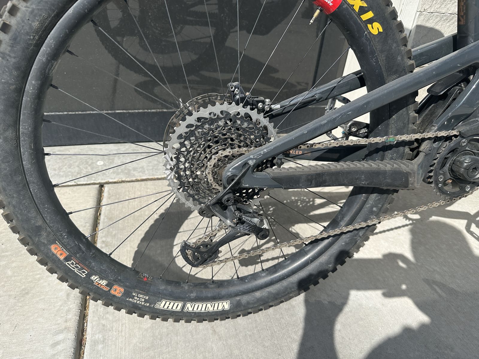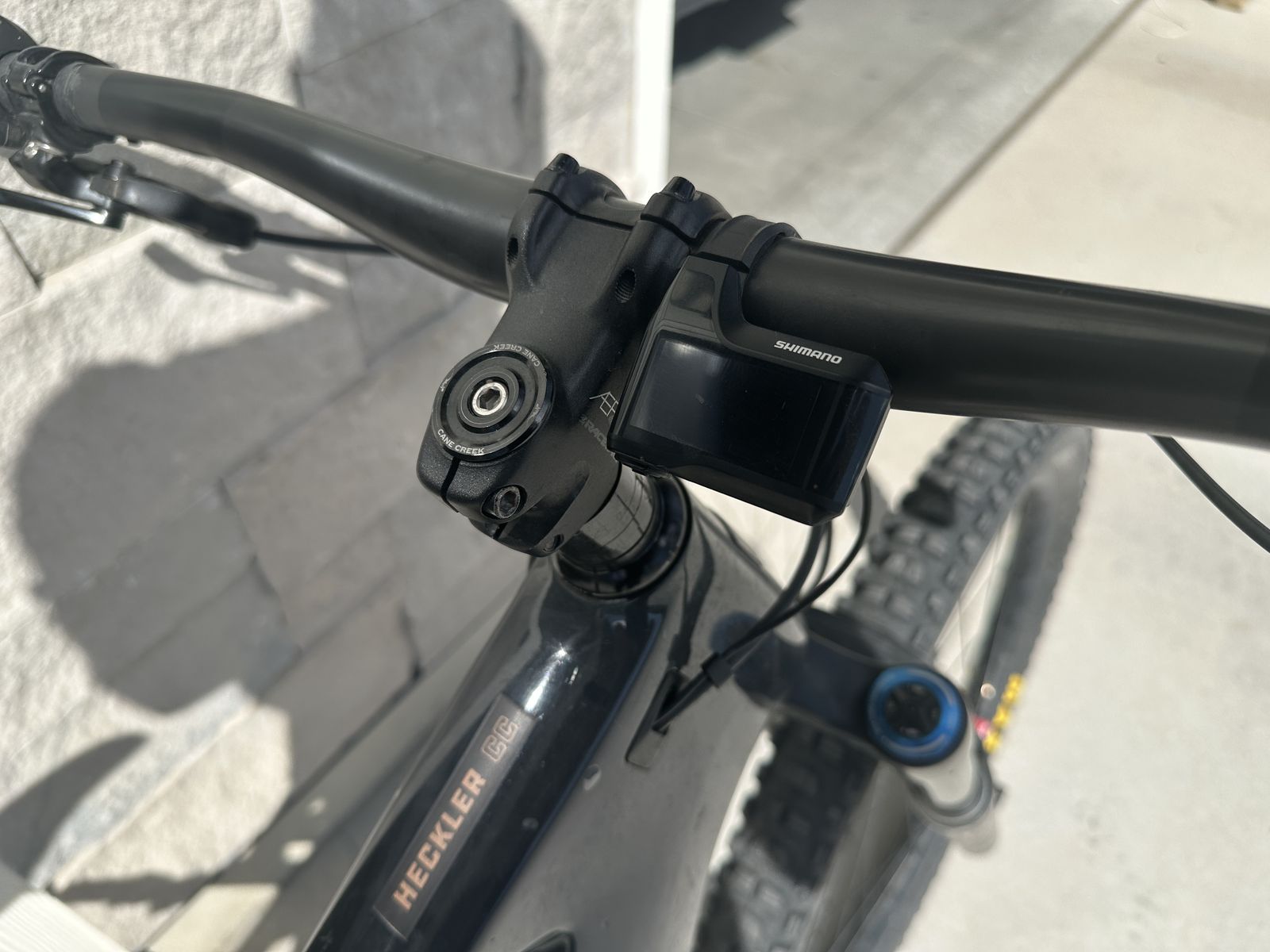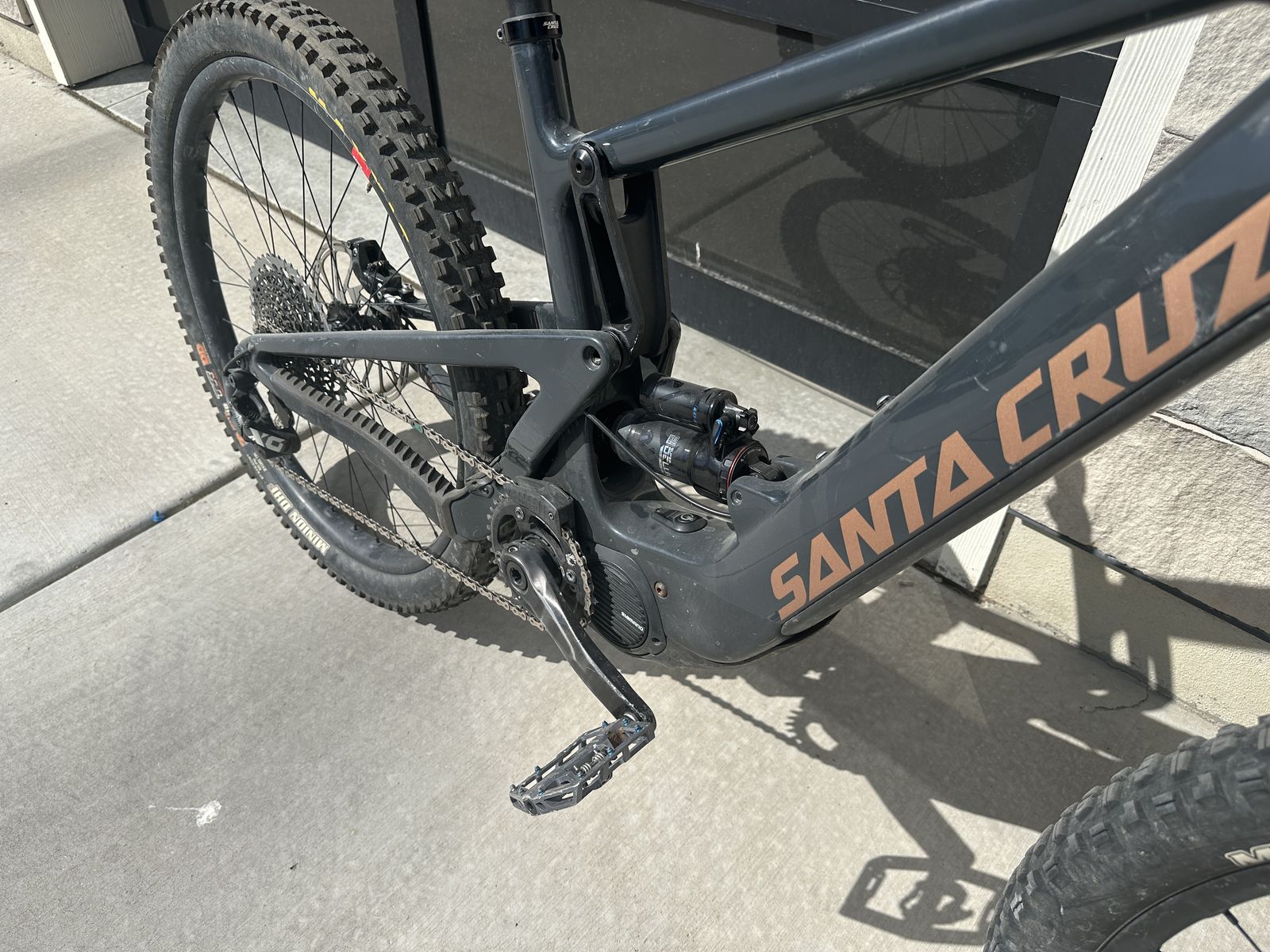 Frame: Santa Cruz Heckler (Carbon) Size: Large Wheels: 27.5” Motor: Shimano STEPS (smooth, reliable assist) Fork: Fox 36 Performance Elite Rear Shock: Fox Float Drivetrain: SRAM Eagle (wide range) Brakes: Hydraulic disc Tires: Maxxis Minion DHF / DHR II (aggressive trail setup)