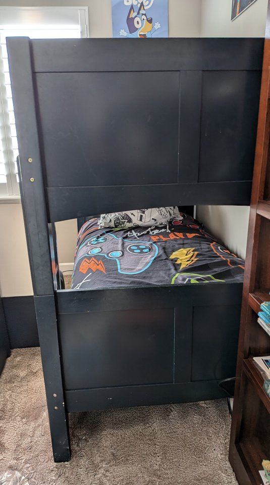 VenmoTwin over Twin bunk bed. Real wood, blue in color. Very solid. It has some dings and scratches on the rails, the worst of it is pictured. Disassembled and ready to move. Comes from a smoke and pet free home.