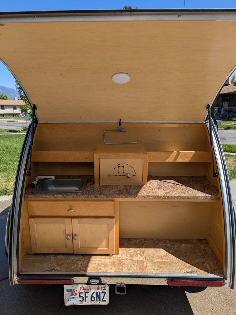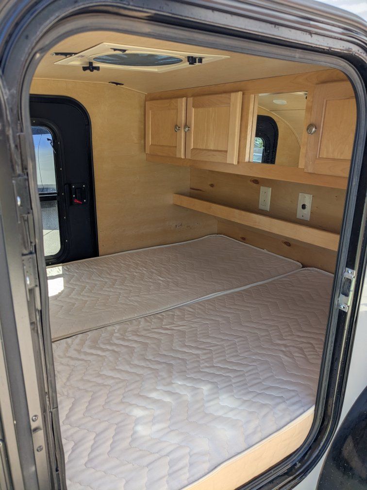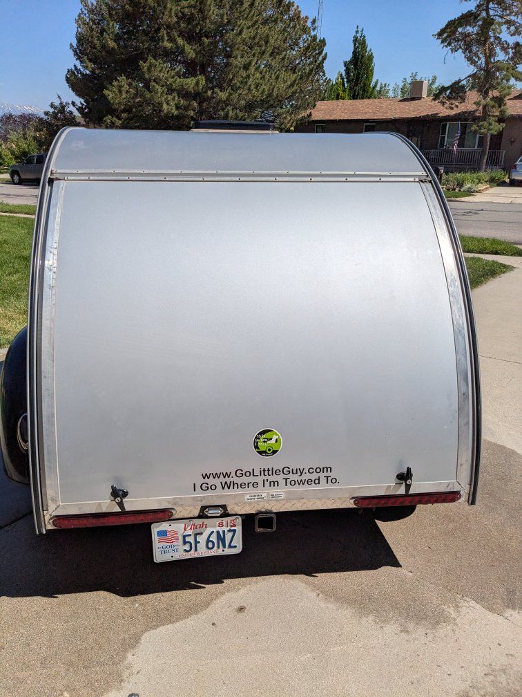 Venmo2014 Little Guy Silver Shadow teardrop trailer that is 5 foot wide and 10 foot long. It is lightweight (approx. 1,000–1,200 lbs), making it towable by most small vehicles. It features a vintage silver exterior, birch interior, and rear galley kitchen, a queen-size mattress, cabinets, and overhead lights, a fantastic fan, and shore power. The rear hatch opens to a kitchen area, with a sink and storage. Models typically sell for between $8,000 and $14,500, with prices varying based on condition and location.