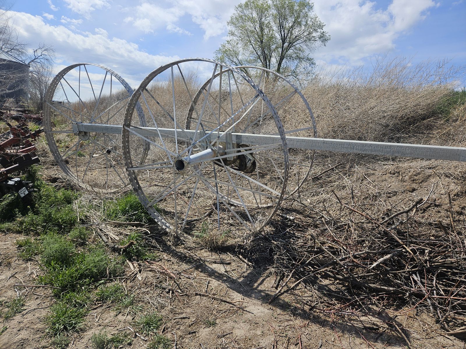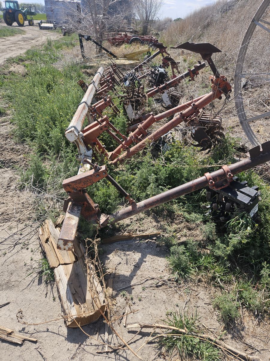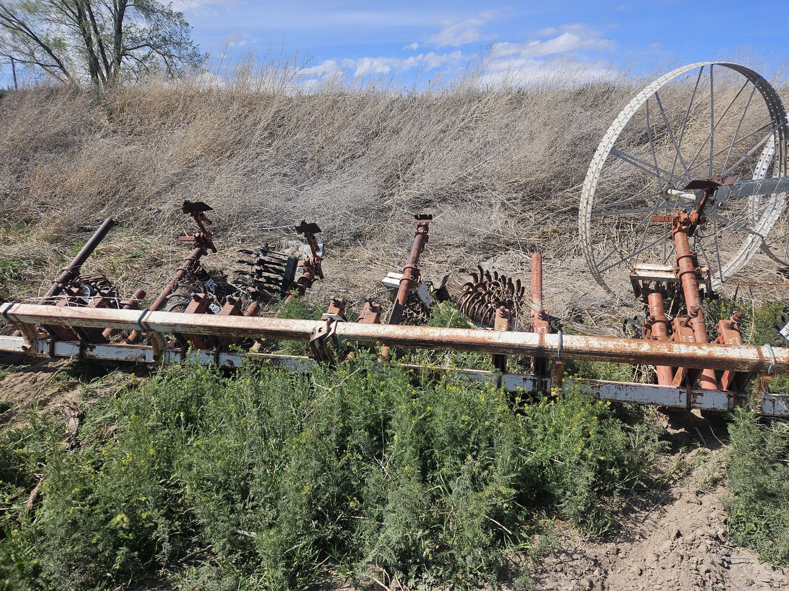 Older loader off a 544 Farmall, 6 row liliston cultivtor, Thunderbird mover, endgate for a semi trailer was probably used in a beet trailer