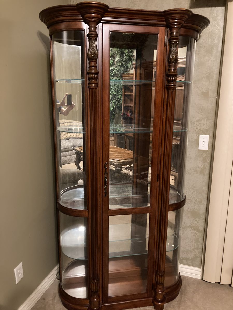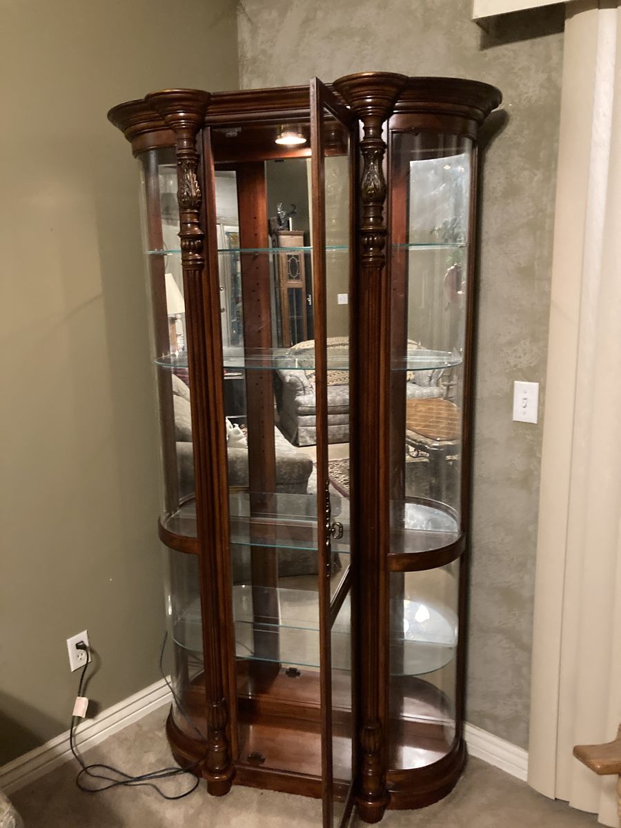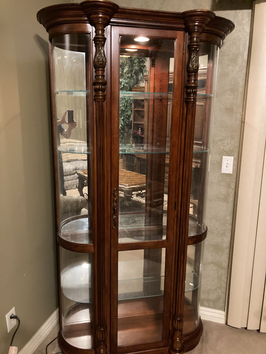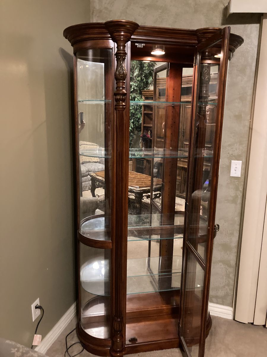 Hello I have a Pulaski Empire Style Cherry Wood Large Bowed Glass With Interior Lighting Height 76 Inches Width 41 Inches Depth 12 Inches Very Nice Well Made Classy Curio Cabinet Great Deal