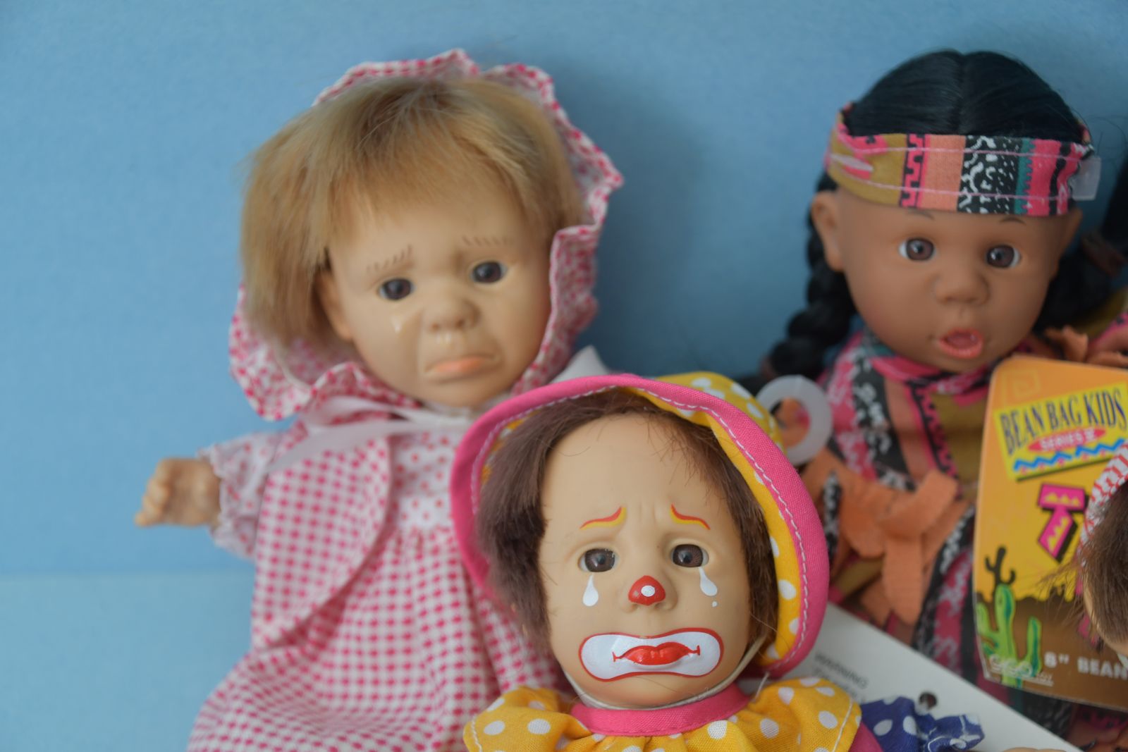 This Set of 7 BEAN BAG DOLLS are about 8.5" in height. There are HAPPY KIDS, TEEPEE TOTS & BEANIE CLOWNS. 6 of the DOLLS have TAGS. They are CLEAN! Questions??? Please ask. We are located in Plain City. Cash only please.