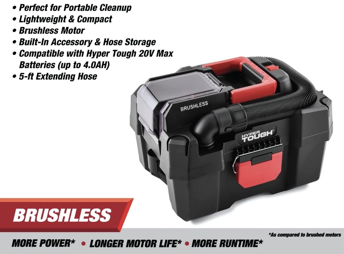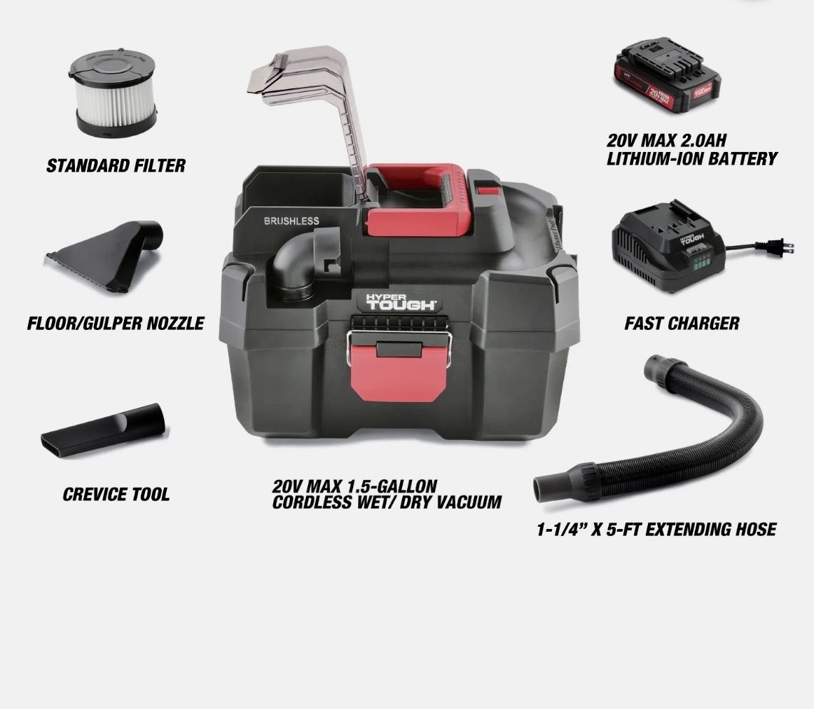 Venmo• Hyper Tough 1.5 Gallon Wet Dry Vac, 20V Max, Brushless Motor, Cordless, Battery and Charger Included