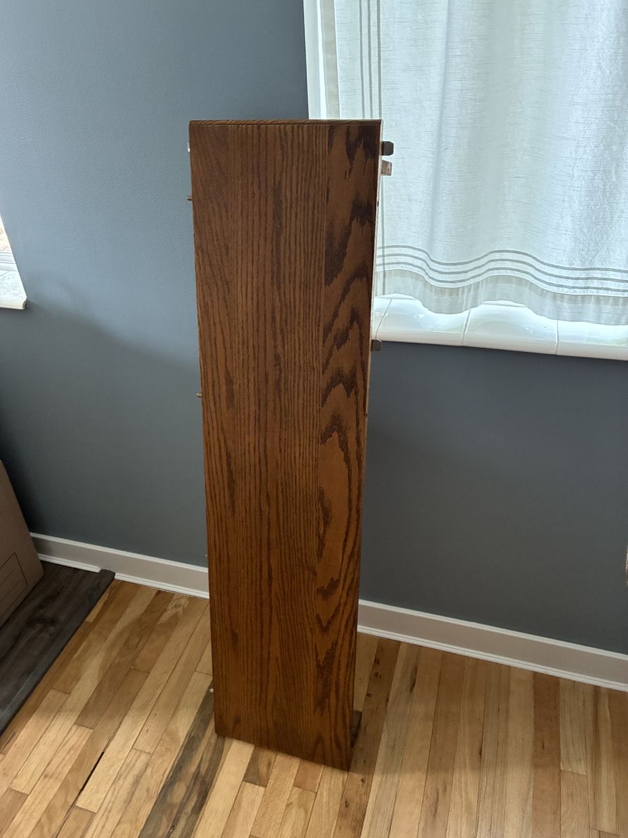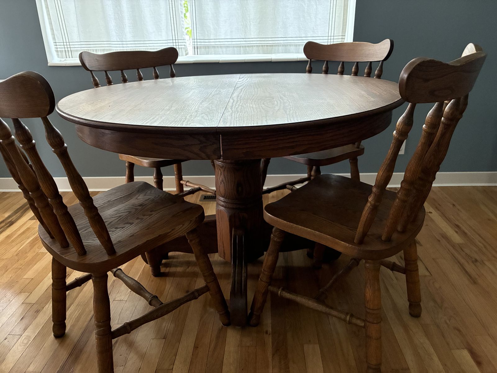 ZelleDining table and four chairs. Oak, in excellent condition. 48" round, include two leaves that are 11.75" each so the table length can be extended a total of about 23.5" or 71.5" total length. Motivated to sell, moving and need to get it out of the way.