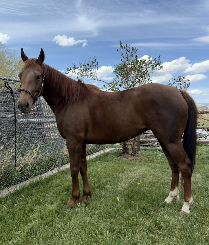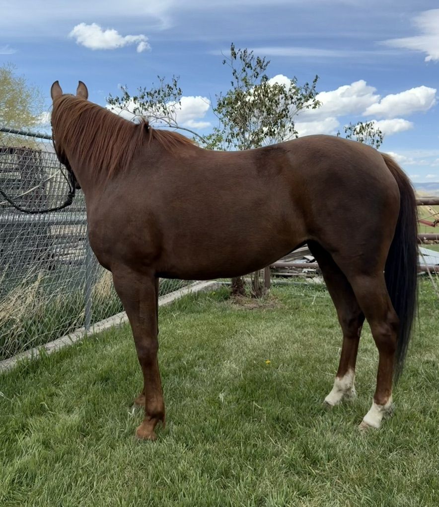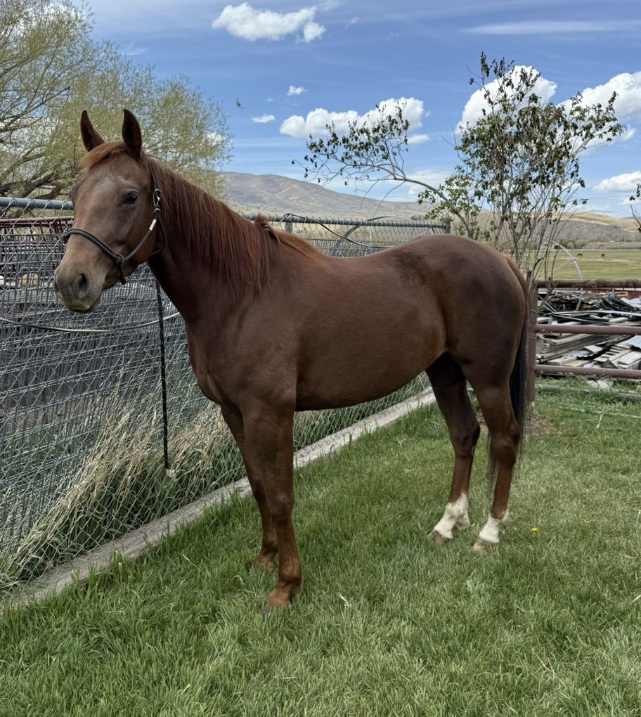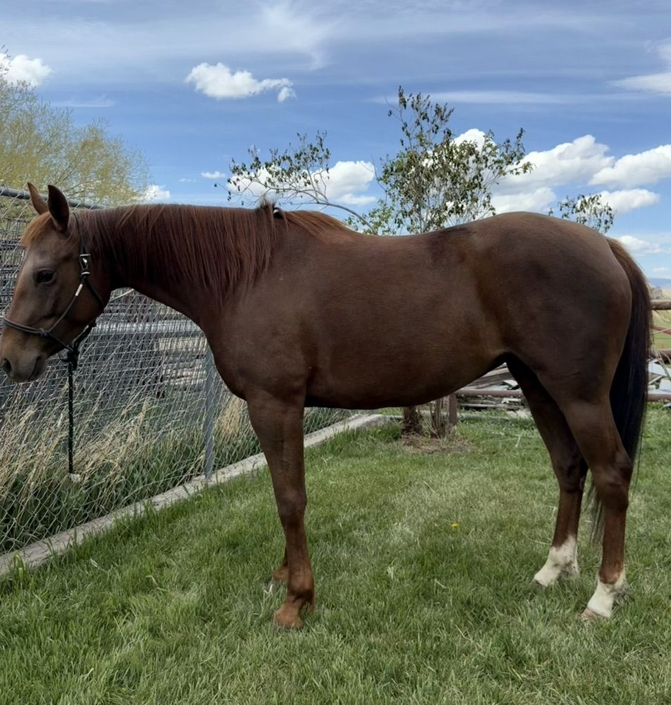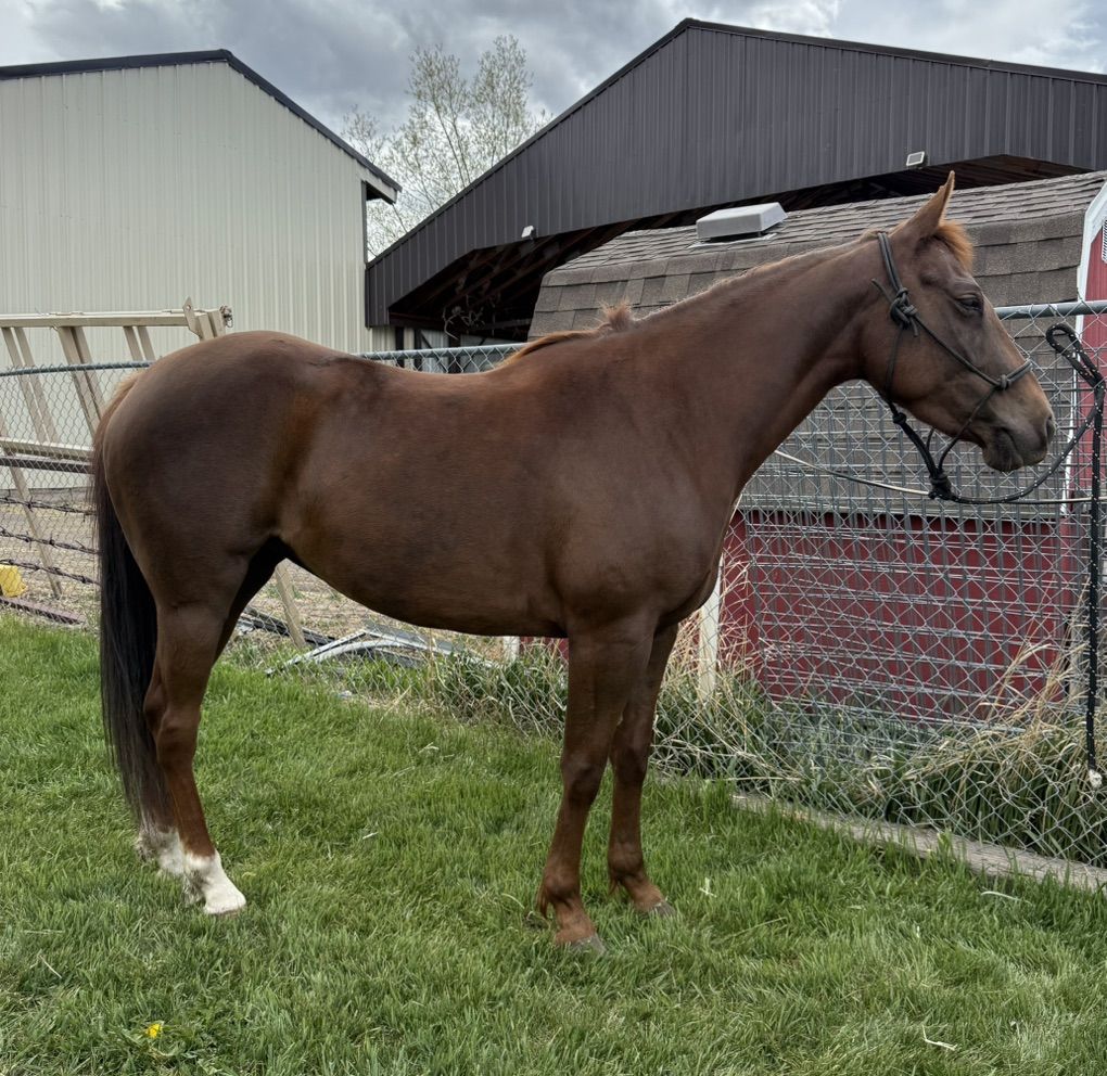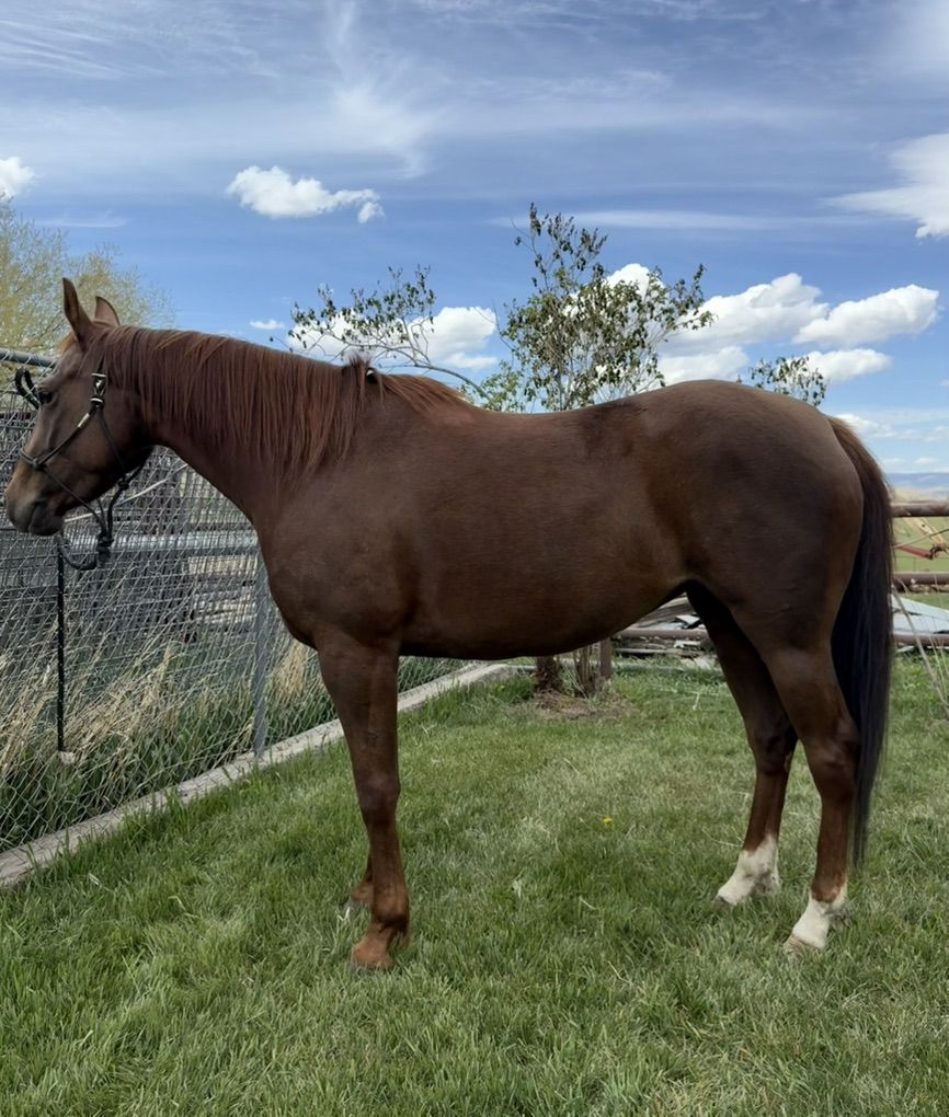 This 5 year old AQHA chestnut mare is the one you can depend on every day, whether she’s 6 months fresh or rode every day. She’s my go to horse when I need something done. She’s very cowy and has been used in the sorting pens at home, in the arena, as well as gathering cattle on the mountain. She’s good with a rope and has been used to rope and doctor cattle. She is willing, honest, and will do anything you ask of her, crosses water with no issues, stands quietly to open and close gates, loads in and out of a trailer no problem. She’s very broke, gentle, and easy to get along with. She has a solid stop and plenty of speed when you need it, I haven’t ever been outrun on her. She is a smaller mare but built well. She gets along with other horses and lets you walk up and catch her in the feild.