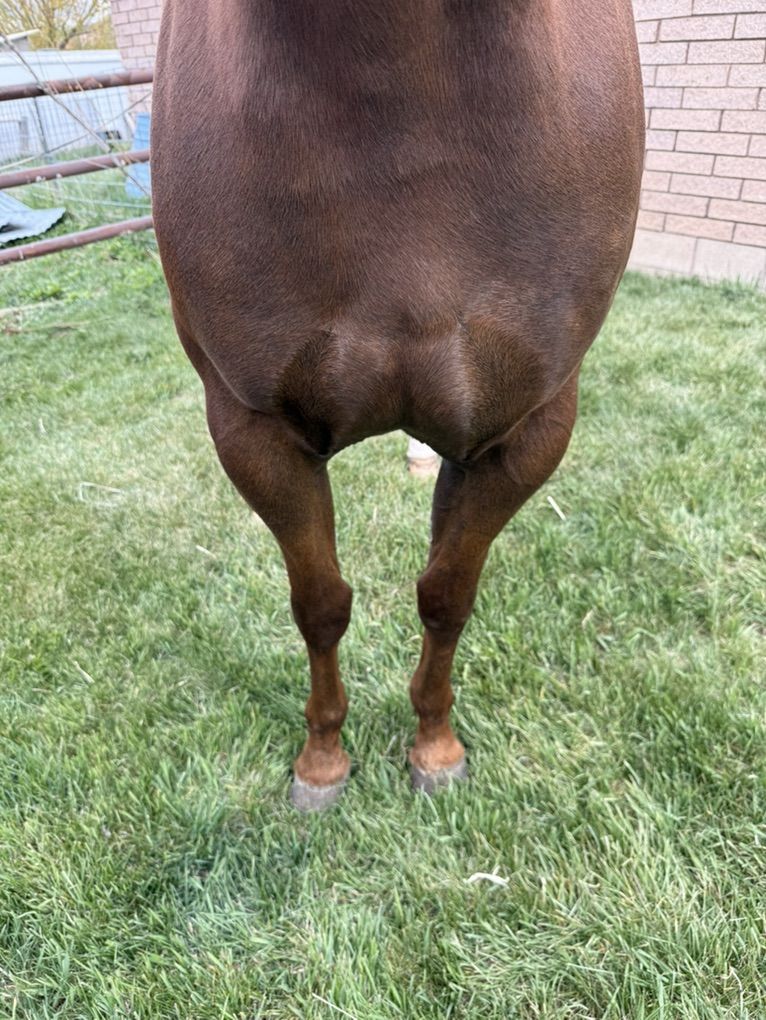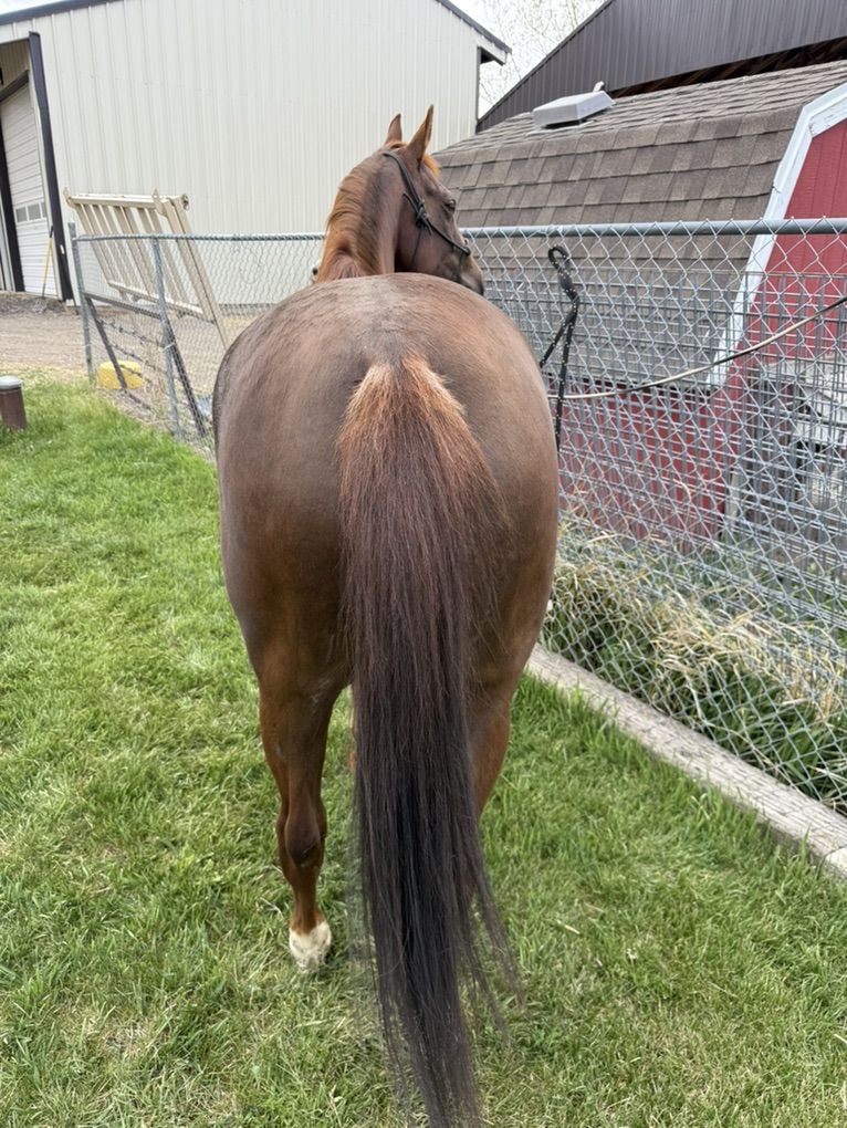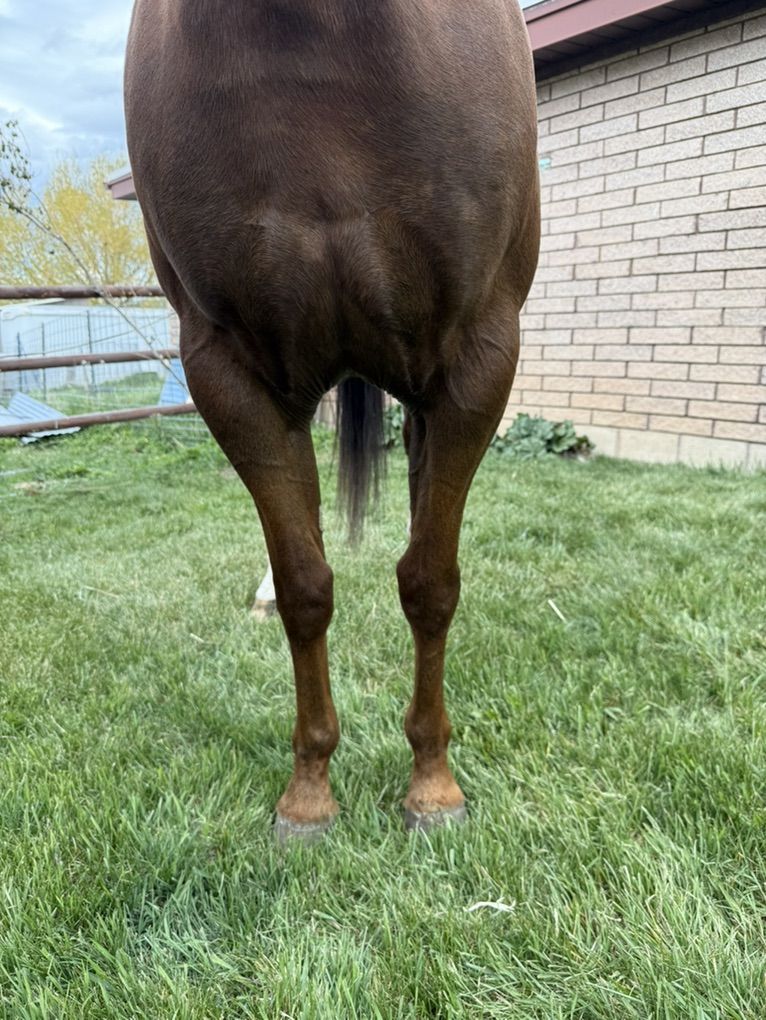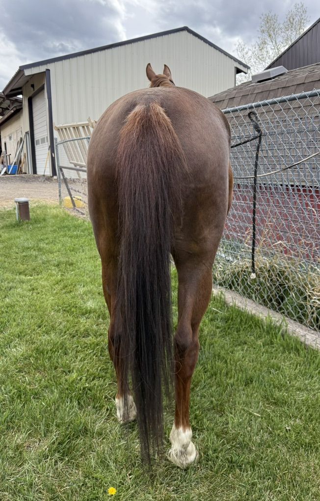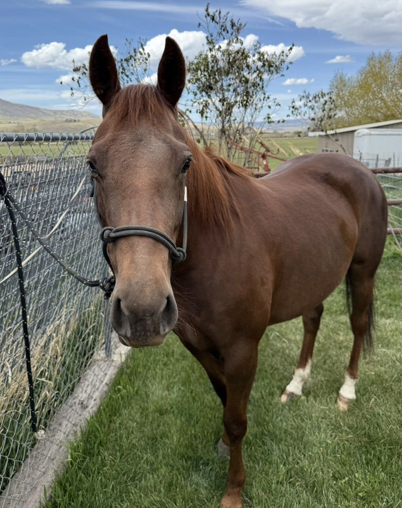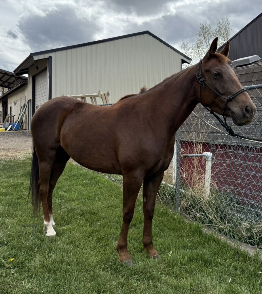This 5 year old AQHA chestnut mare is the one you can depend on every day, whether she’s 6 months fresh or rode every day. She’s my go to horse when I need something done. She’s very cowy and has been used in the sorting pens at home, in the arena, as well as gathering cattle on the mountain. She’s good with a rope and has been used to rope and doctor cattle. She is willing, honest, and will do anything you ask of her, crosses water with no issues, stands quietly to open and close gates, loads in and out of a trailer no problem. She’s very broke, gentle, and easy to get along with. She has a solid stop and plenty of speed when you need it, I haven’t ever been outrun on her. She is a smaller mare but built well. She gets along with other horses and lets you walk up and catch her in the feild.