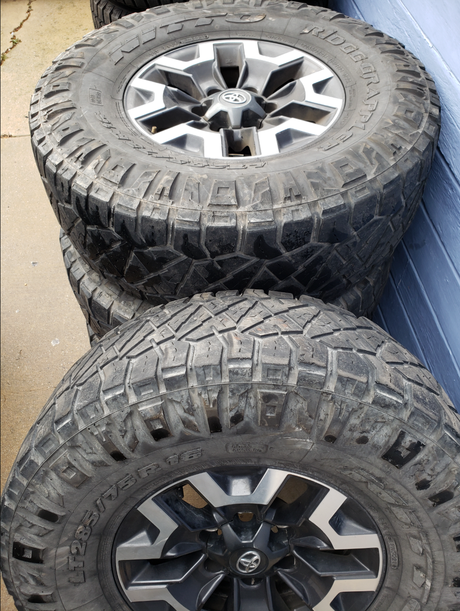 Toyota Tacoma Wheels & Tires off my wife’s 2021 Tacoma. Ridge Grappler’s LT285/75R16 Wife wanted new wheels for her Tacoma. Selling her old set with Tires. Tires are in the 45% to 50% range. The spare is 85% . These come with a full set of lug nuts as well. 1st $650.00 takes them to the rodeo. Call 801 540-6218