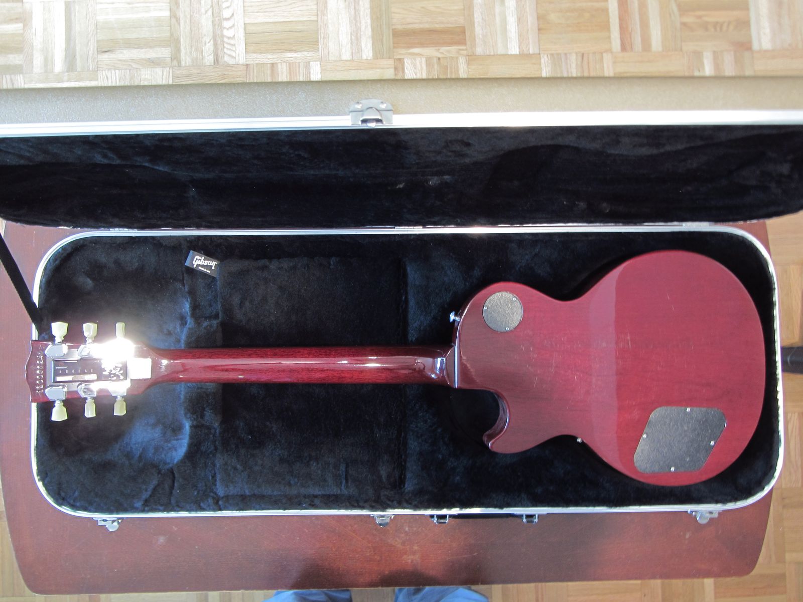 Gibson USA 2015 Les Paul Studio in Wine Red. Plays and sounds great. Has a wider neck and slightly thicker rosewood fingerboard than the previous model. Gibson G-Force electronic tuner works well. I replaced the trim with off-white to look more like George Harrison's famous "Lucy" and replaced the speed knobs with top hats. I replaced the brass zero fret nut with a Graph Tech TUSQ version which sounds better. The old hardware will be included in the sale. Only wear is some minor surface marks and two small finish chips behind the headstock (both sealed). From Gibson: