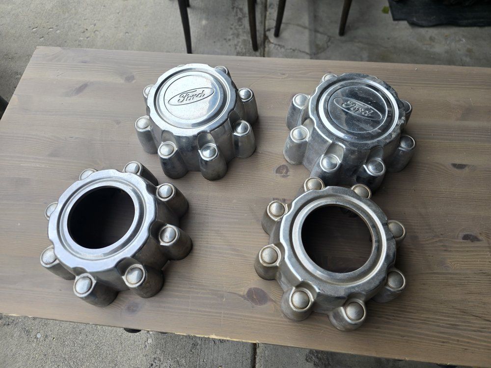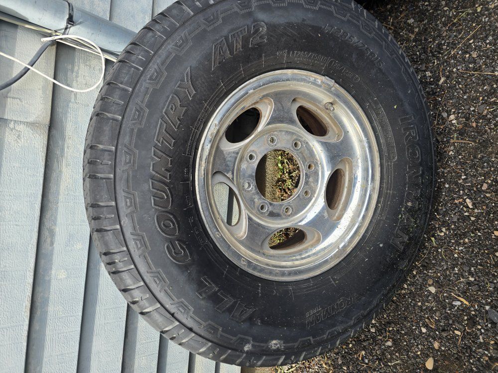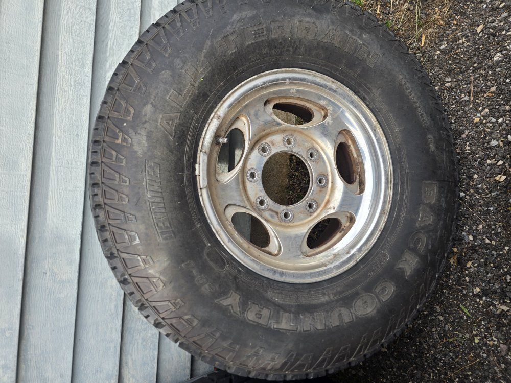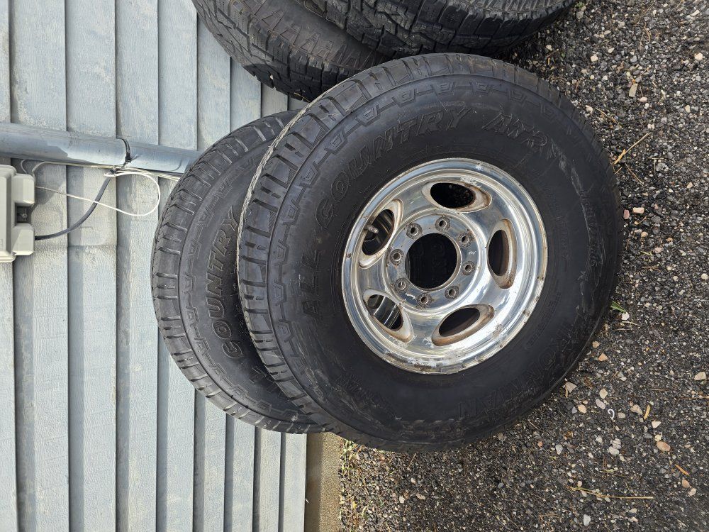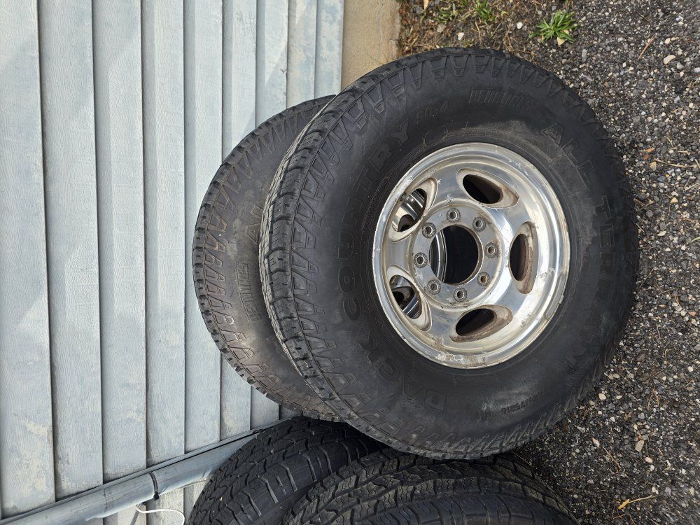 Set of 4 fairly new tires on some Ford 8 lug wheels. Tire sizes match but the brands do not, although they look very similar. I have the Ford center caps for the wheels, the wheels have some corrosion.