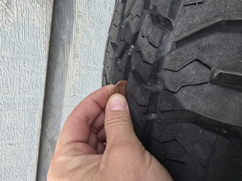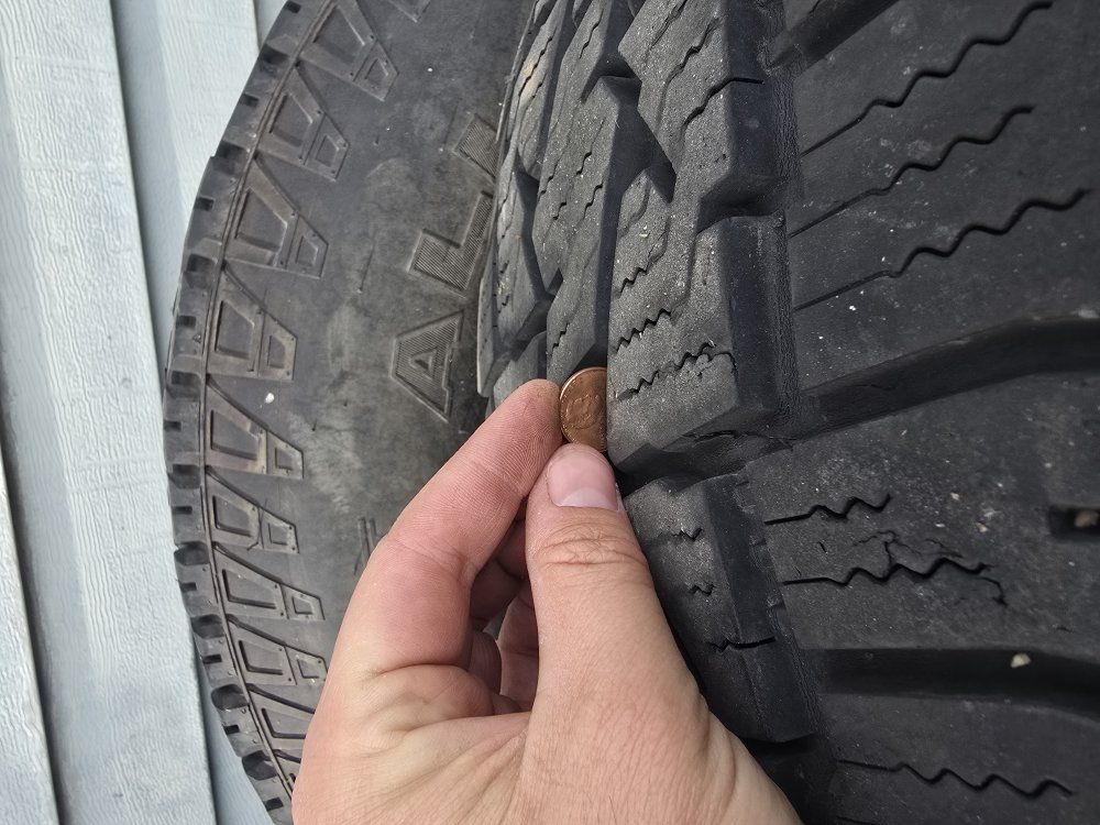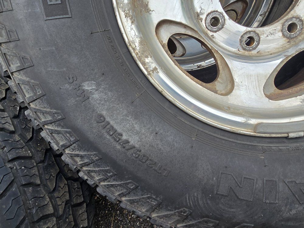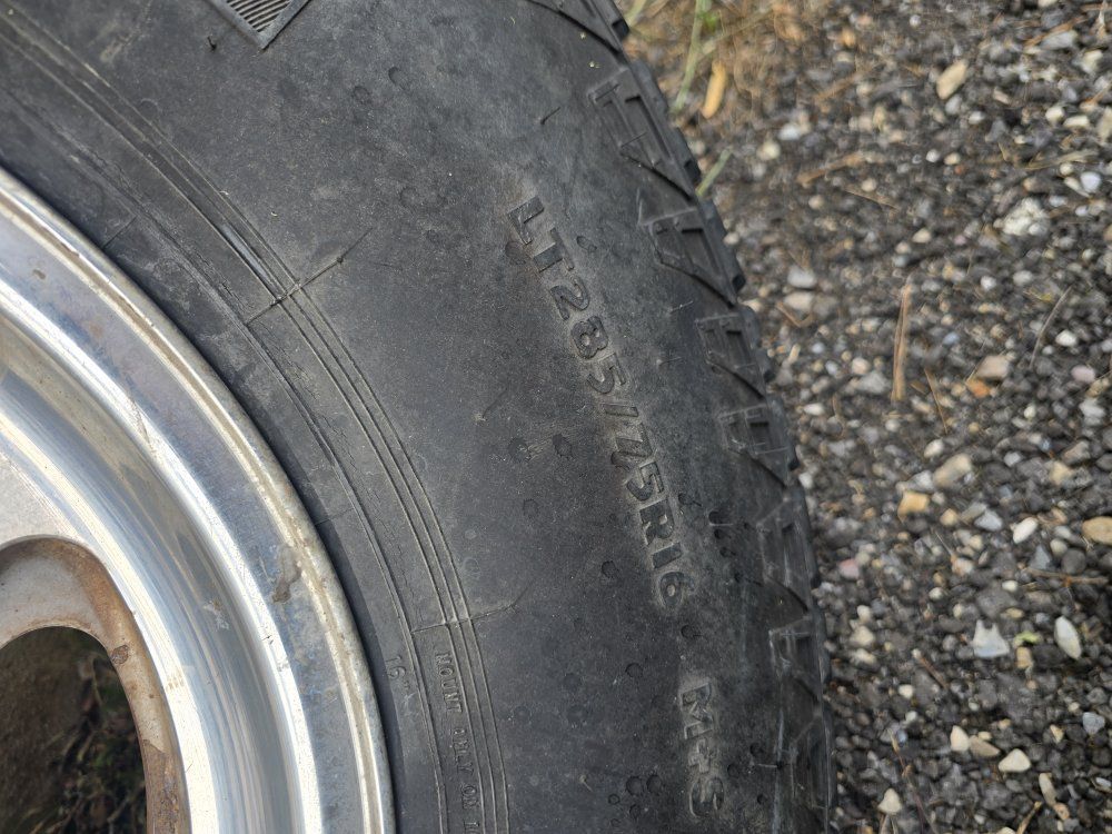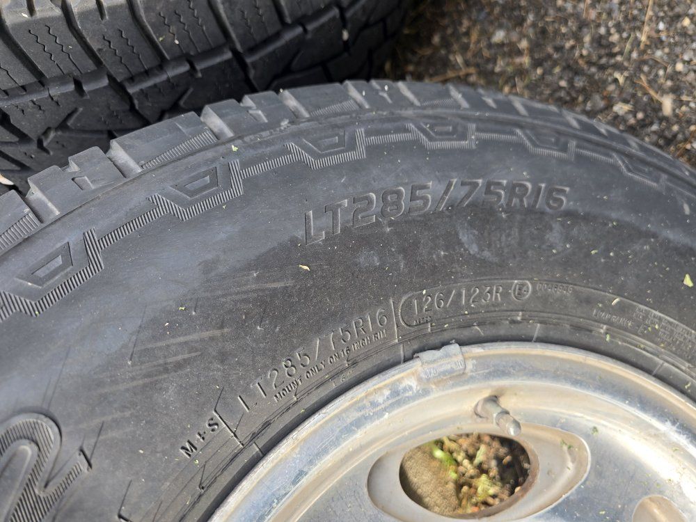 Set of 4 fairly new tires on some Ford 8 lug wheels. Tire sizes match but the brands do not, although they look very similar. I have the Ford center caps for the wheels, the wheels have some corrosion.