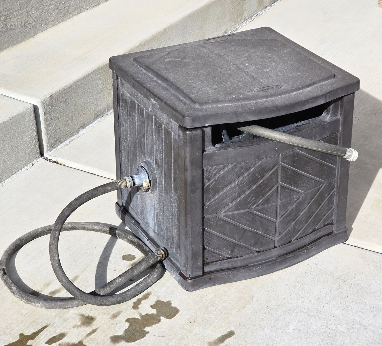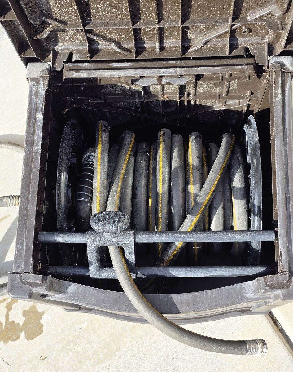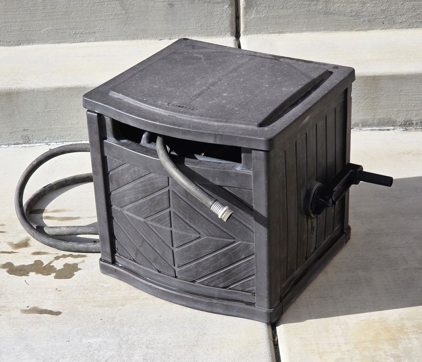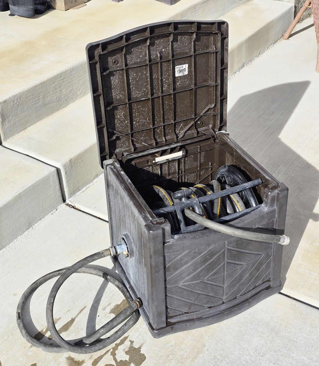 As shown, this box contains a 100ft, 5/8" heavy-duty hose. (Replaced by a wall-hanging retractable hose model.)