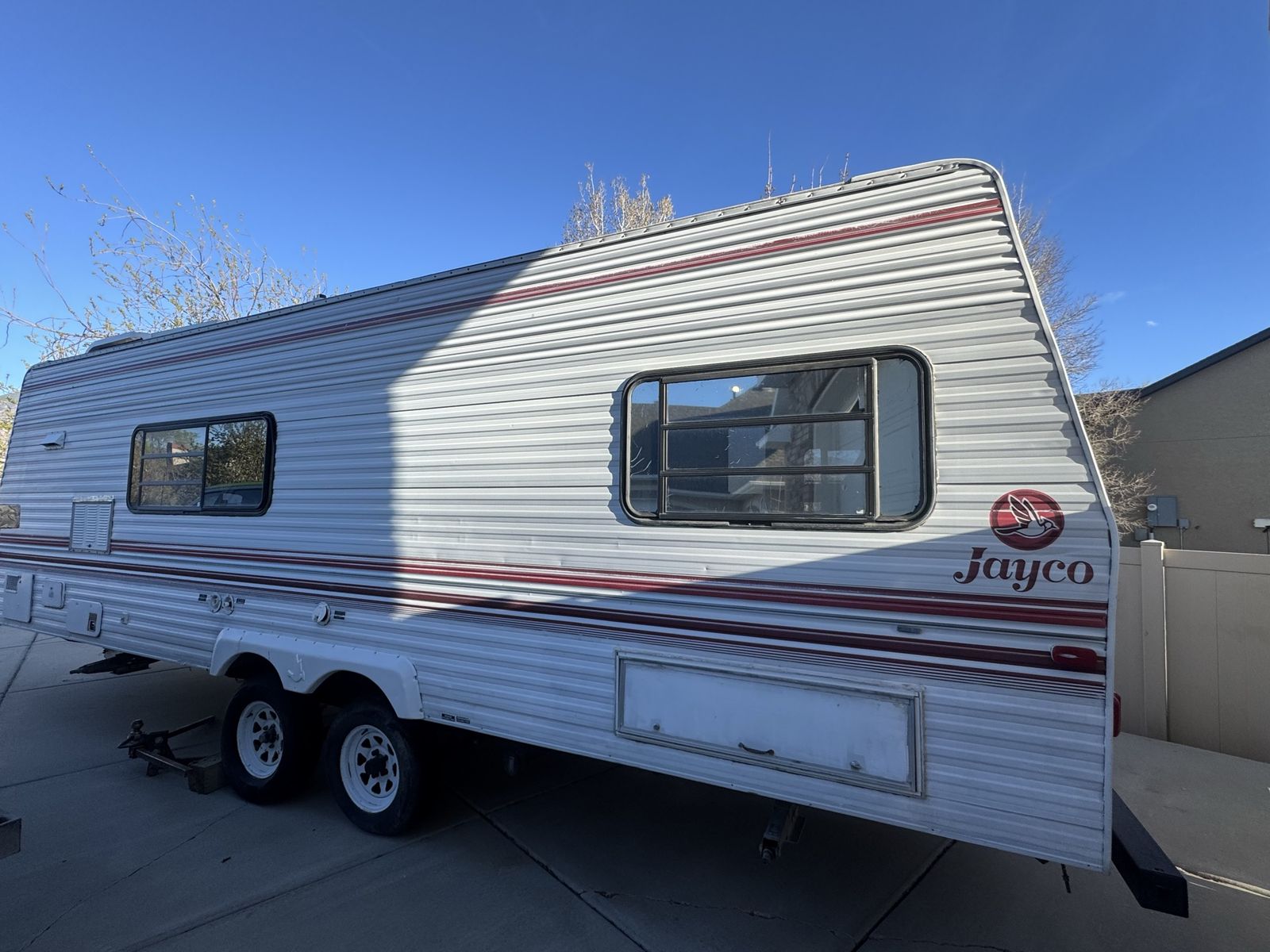 ApplePaySelling a Jayco travel trailer that belonged to my late brother and mom. It’s being sold as-is and will need some work, but could be a great project for the right person or used for parts. Details: •Brand: Jayco •Type: Travel trailer (bumper pull) •Sleeps: 4 •Layout includes kitchen, bathroom, and sleeping area Condition: •Interior needs cleaning and repair (see photos) •Flooring is worn/dirty •Appliances present but condition unknown •Has been sitting and not recently used •Exterior is in fair shape for its age Good for: •Fixer-upper project •Hunting cabin / temporary living •Parts Other info: •Clean title •Located in Stansbury Park, Ut •Buyer responsible for transport Price is OBO – motivated to sell. Message me with questions or to come take a look.