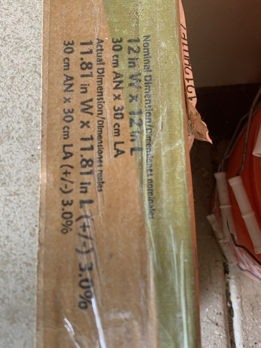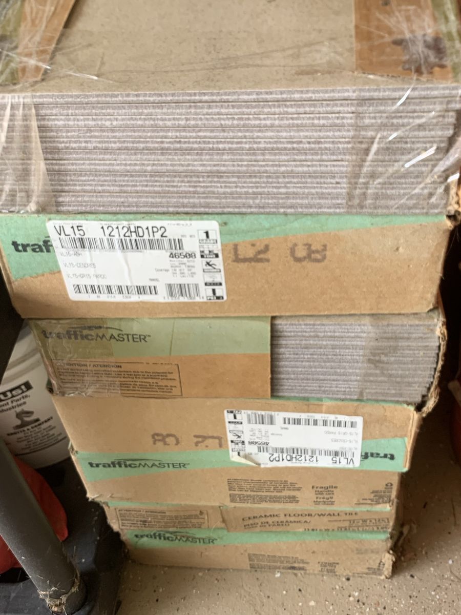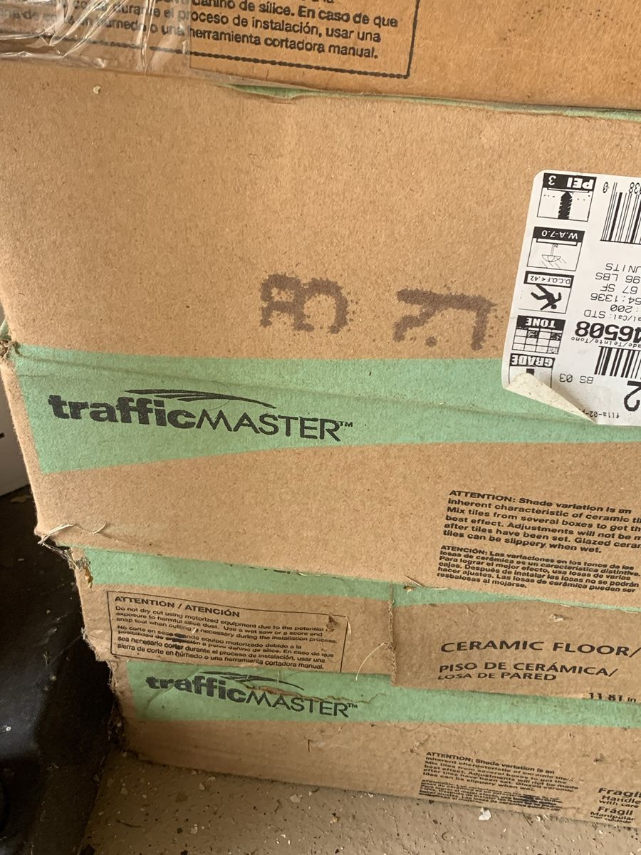 I have 7 boxes of traffic master tile left. There are 11 tiles to a box and the tiles are 12”x12”. There are some broken tiles in one of them.