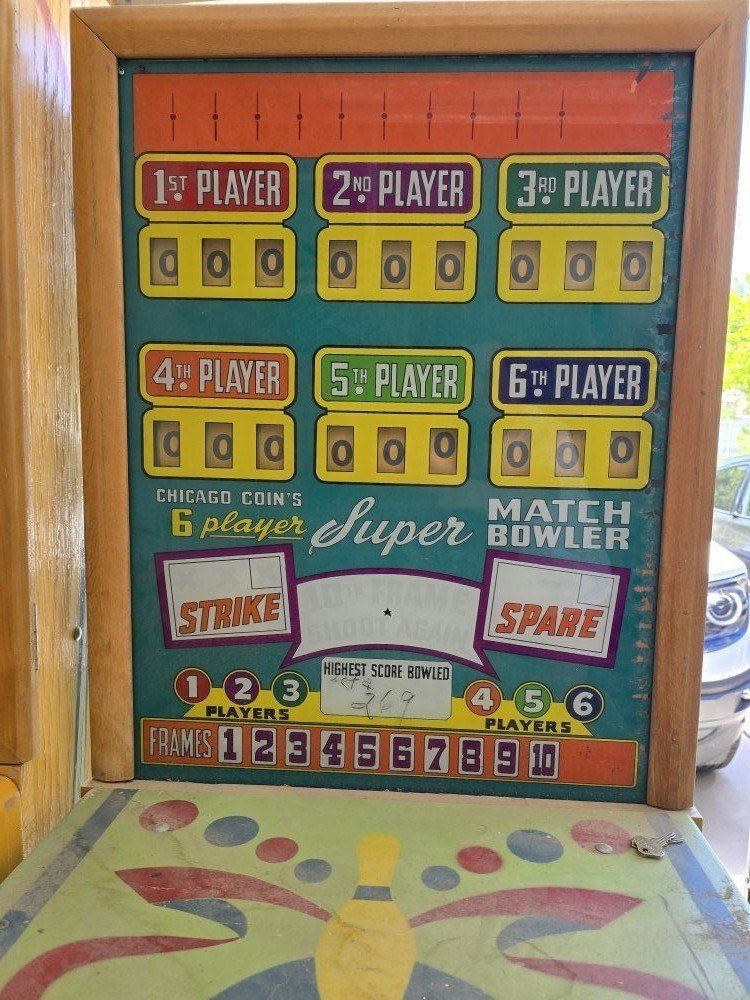 Chicago Coin’s 6 Player Super Match Bowler Classic vintage bowling arcade machine with original scoreboard and cabinet art.