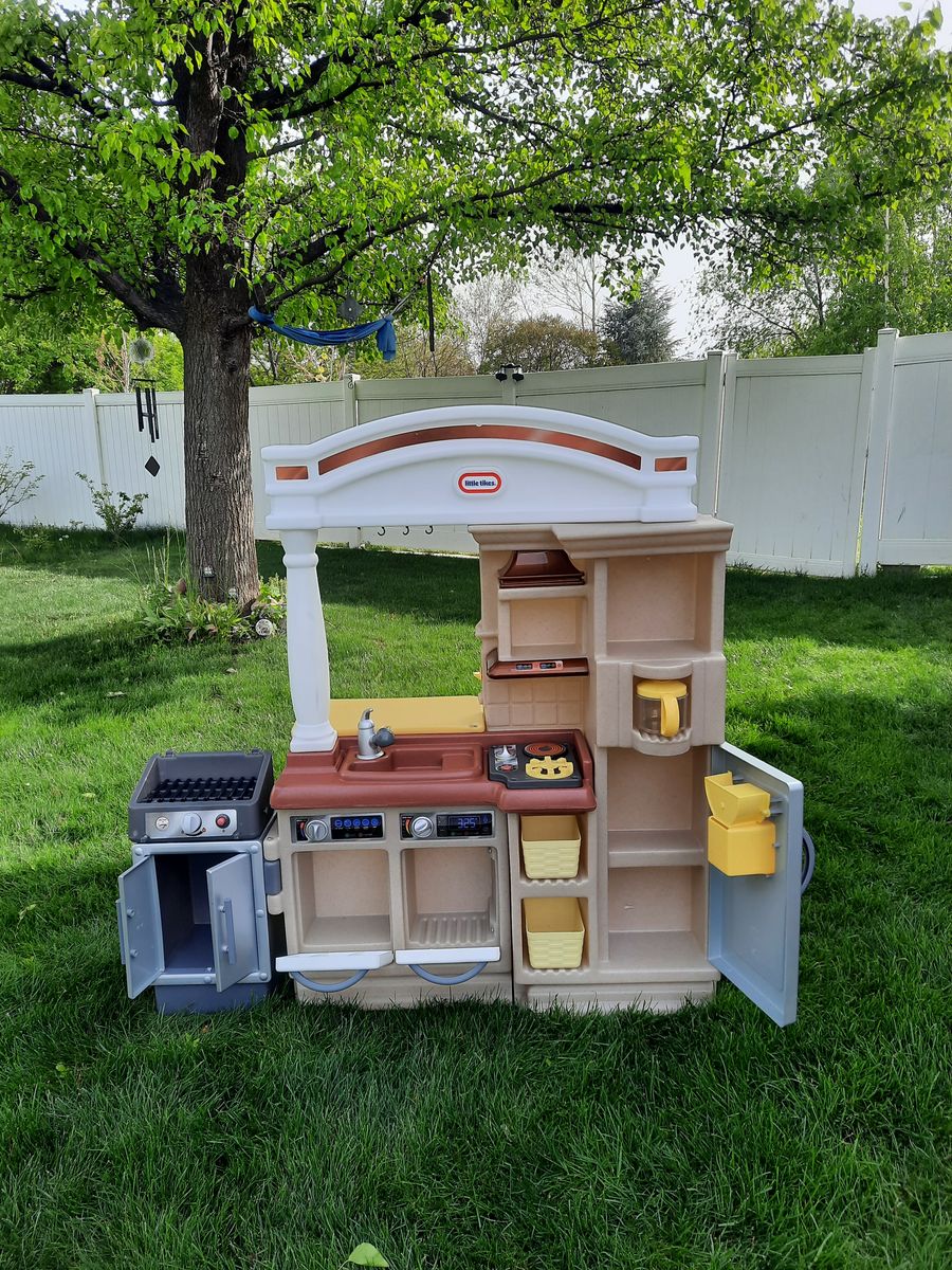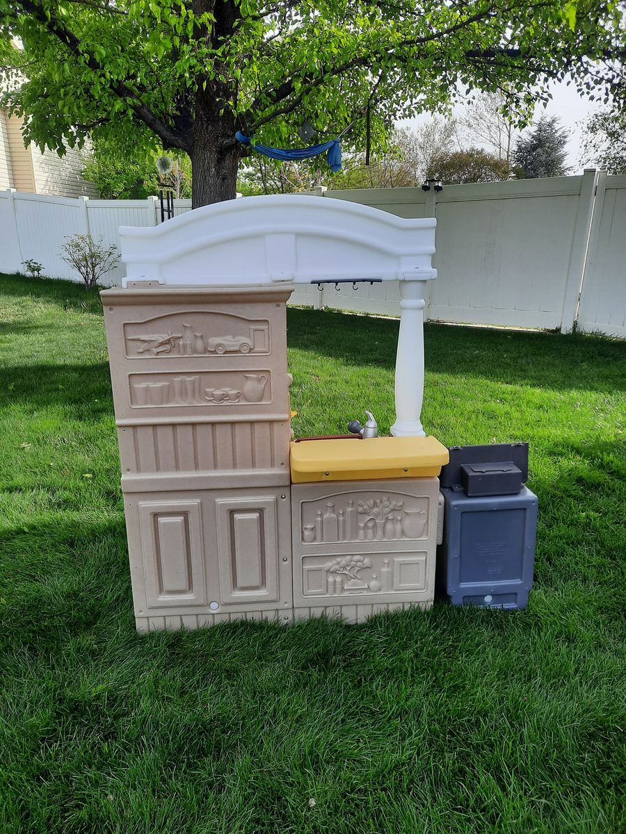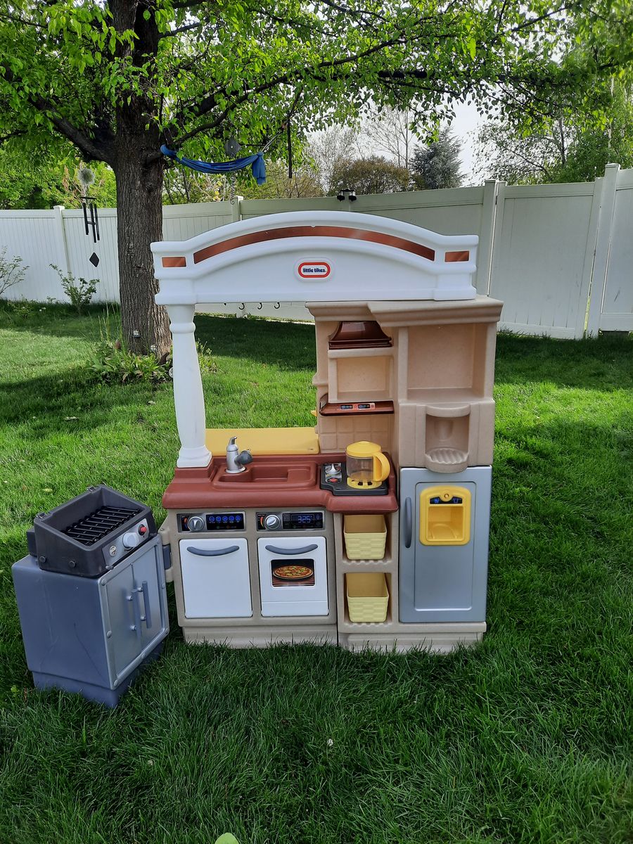 VenmoWe have an adorable Little Tykes play kitchen for sale. This kitchen has a fridge, cupboards, a BBQ, 2 baskets/bins, and a tea pot/coffee pot. The cooktop and BBQ make cooking noises. The cooktop still has working batteries. The BBQ does not, but takes 3 D batteries. The BBQ also moves position back and forth. This kitchen also includes dishes, serving utensils, oven mitts, an apron, and a bunch of food. Located in Woods Cross.