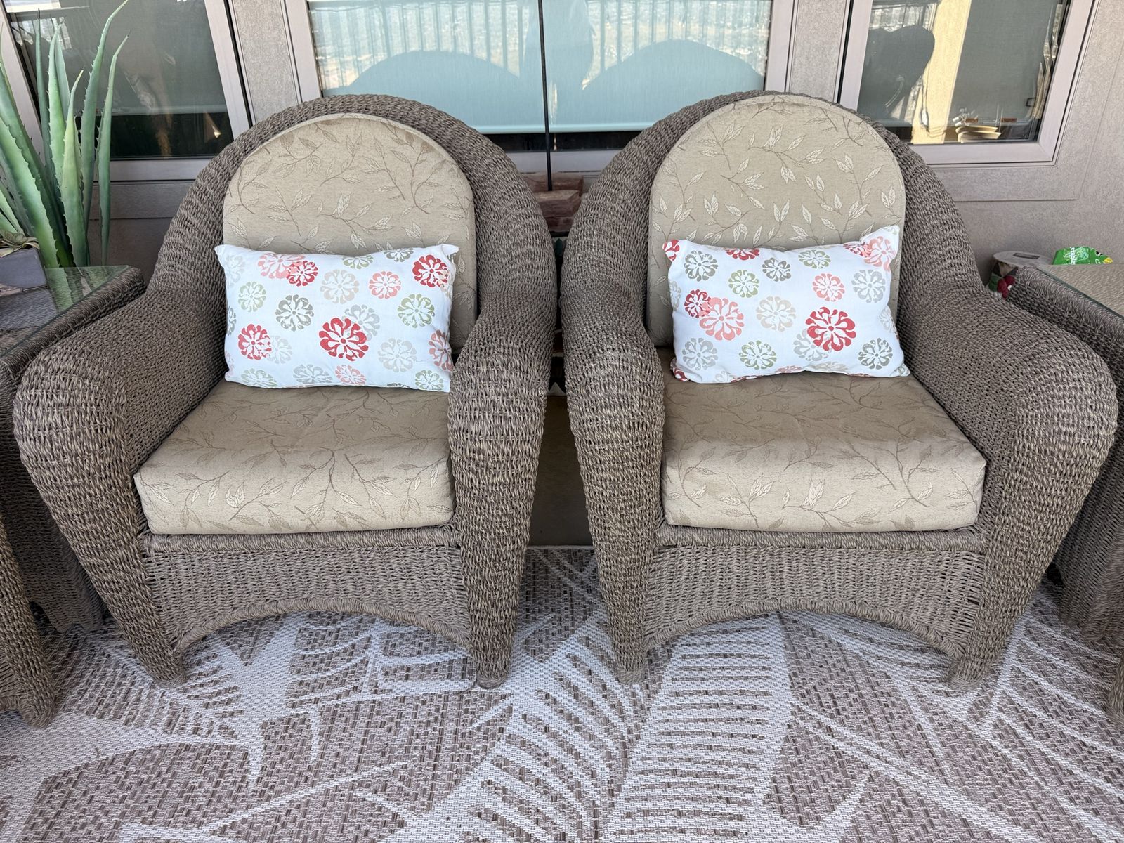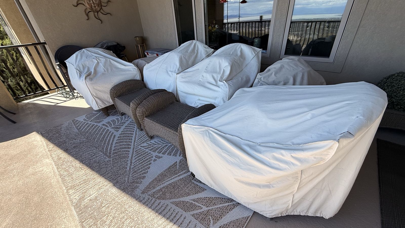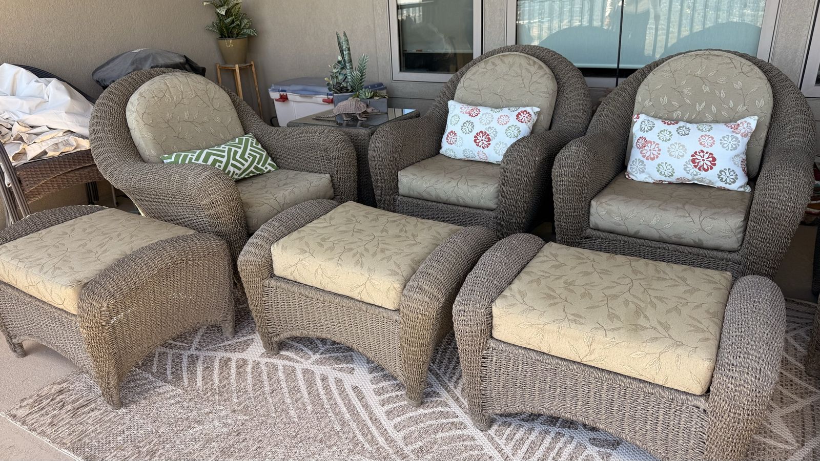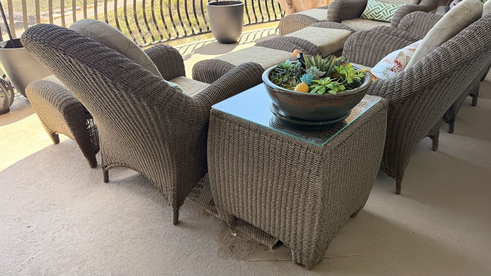 What’s included: • 4 cushioned armchairs • 4 matching ottomans • 2 glass-top side tables • Furniture covers (included) • All cushions + decorative pillows shown