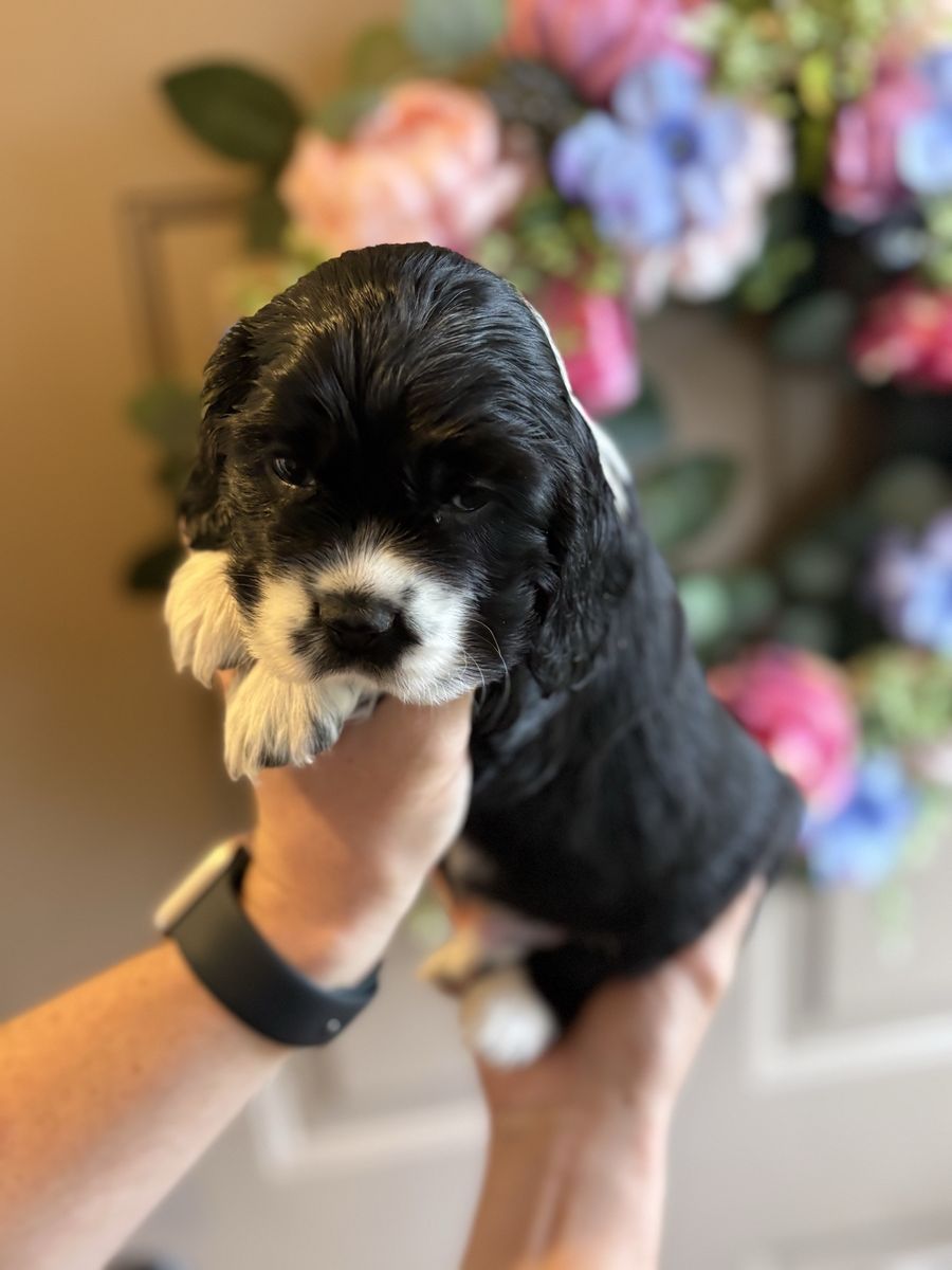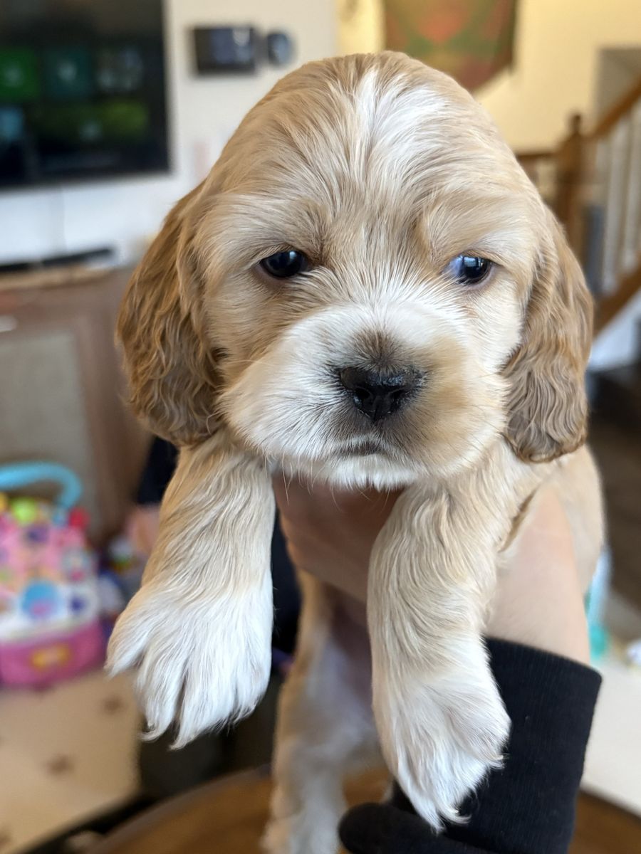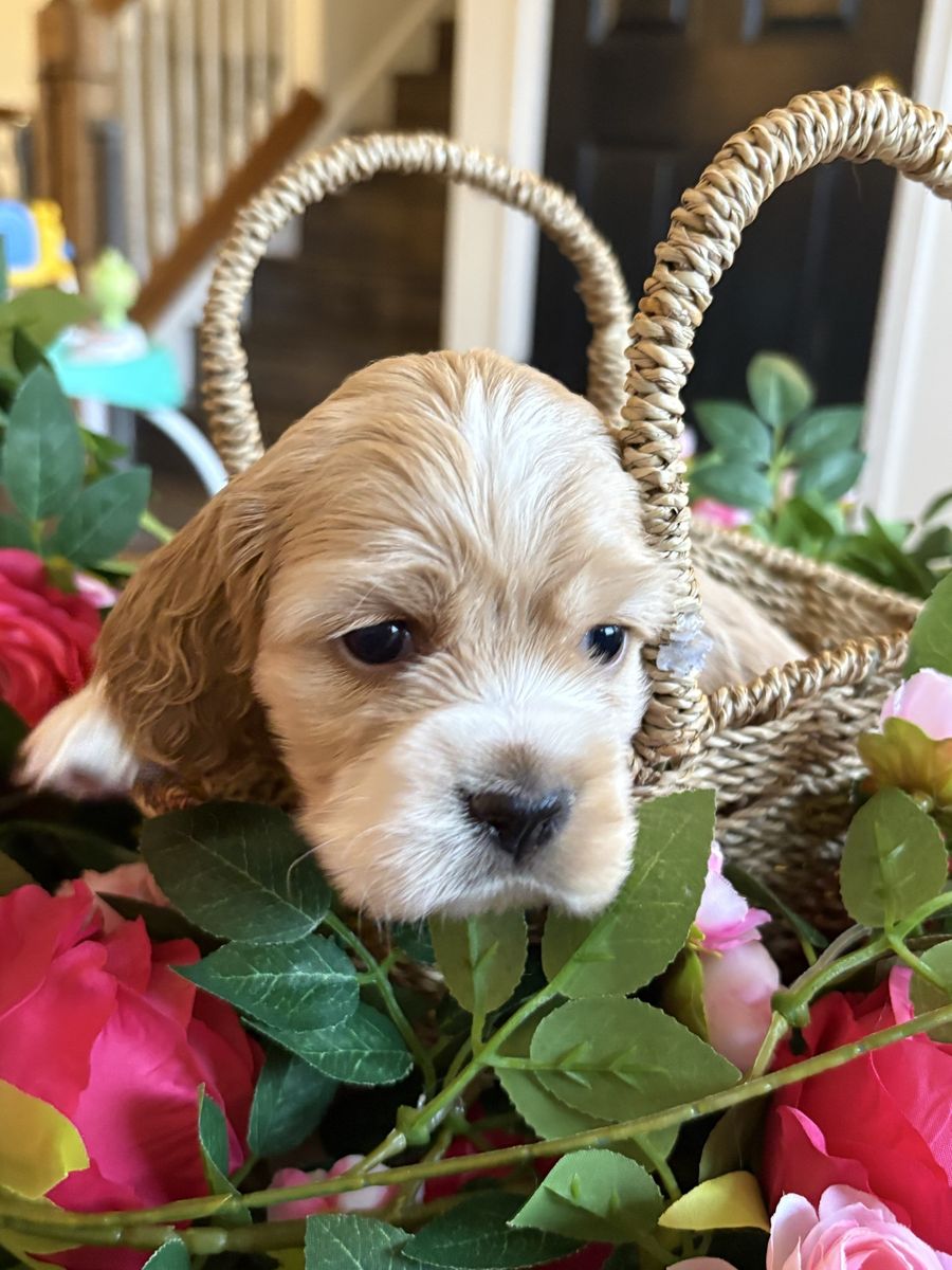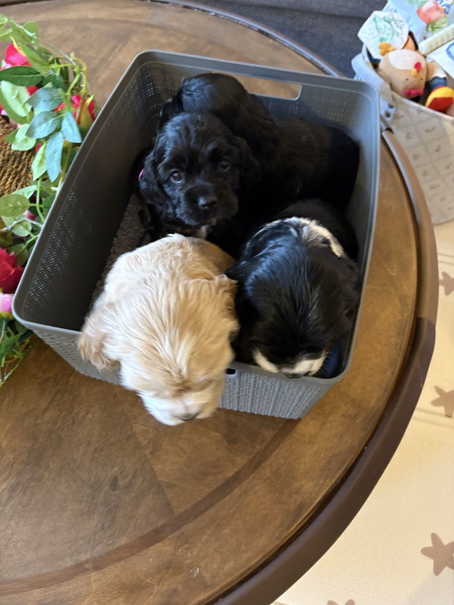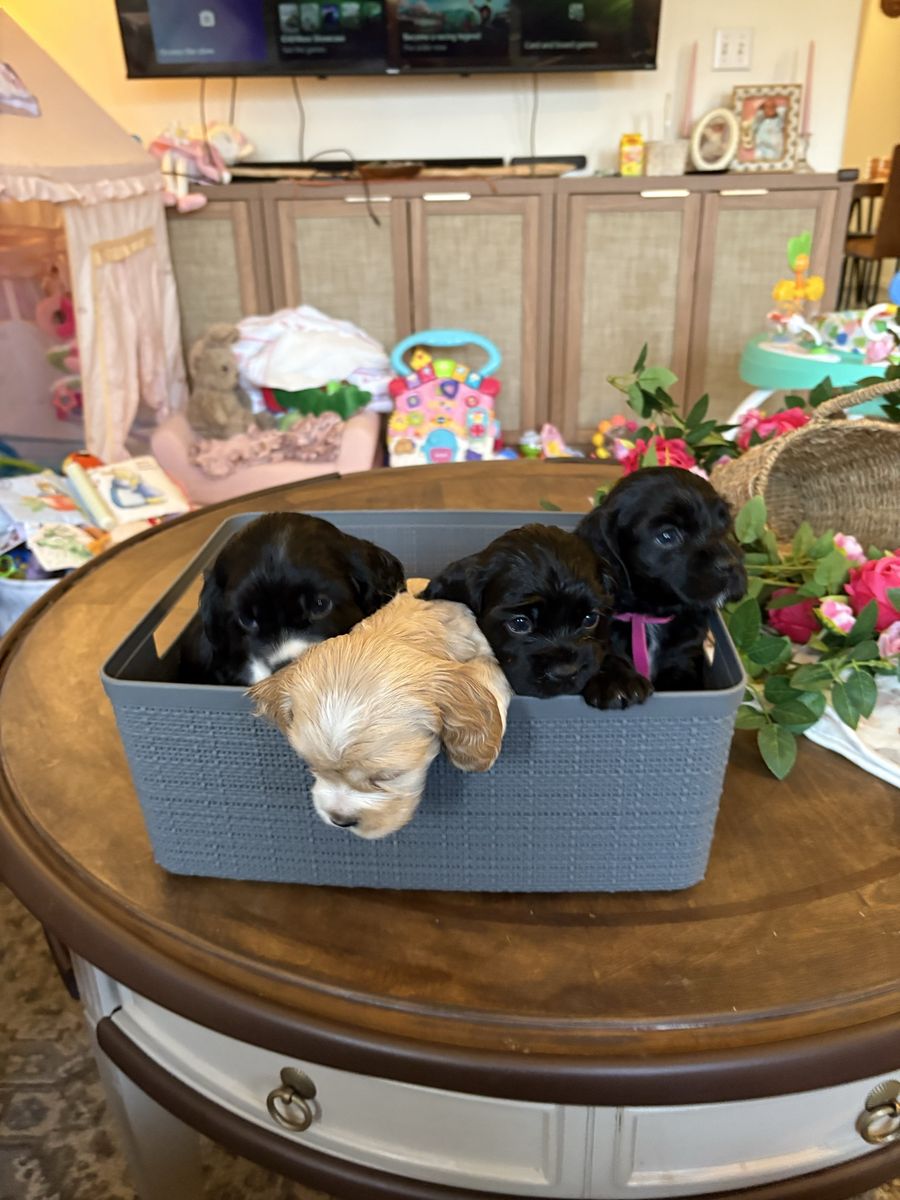 ZelleWe have 4 American Cocker Spaniel puppies! They will be 6 weeks old on Mother’s Day weekend. 3 females, 1 male.