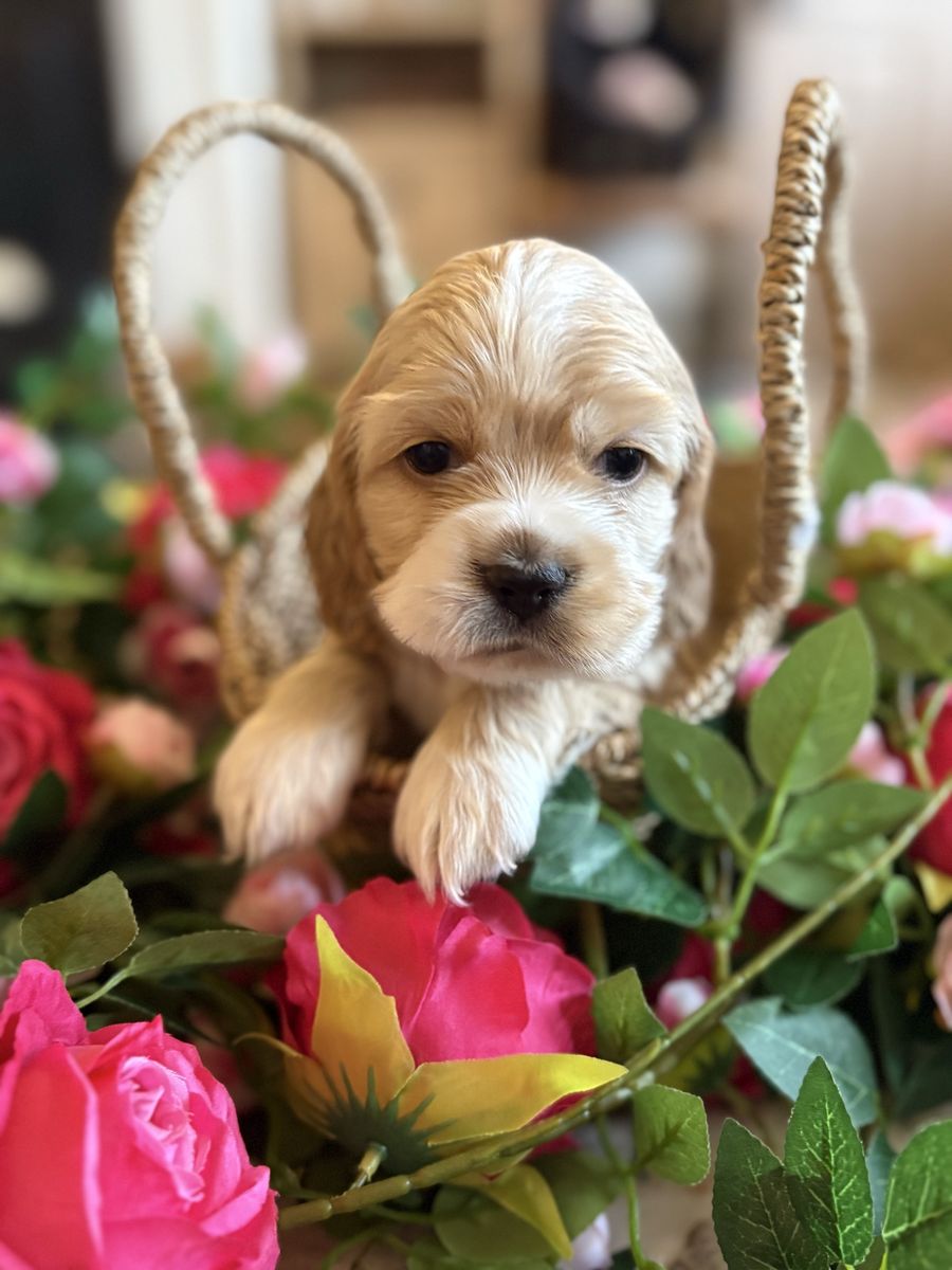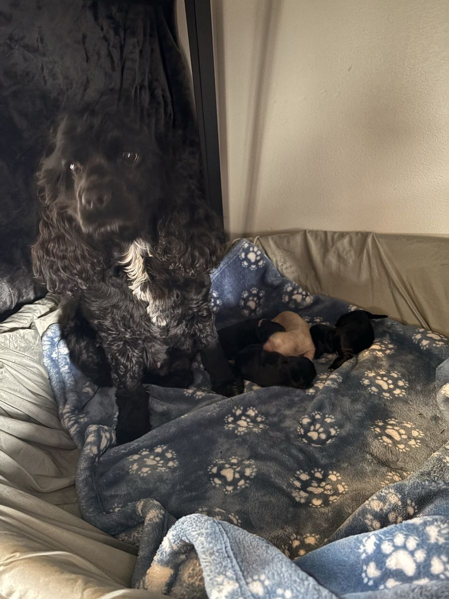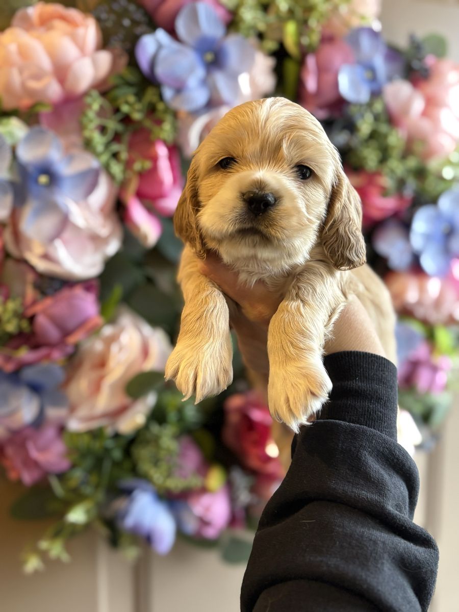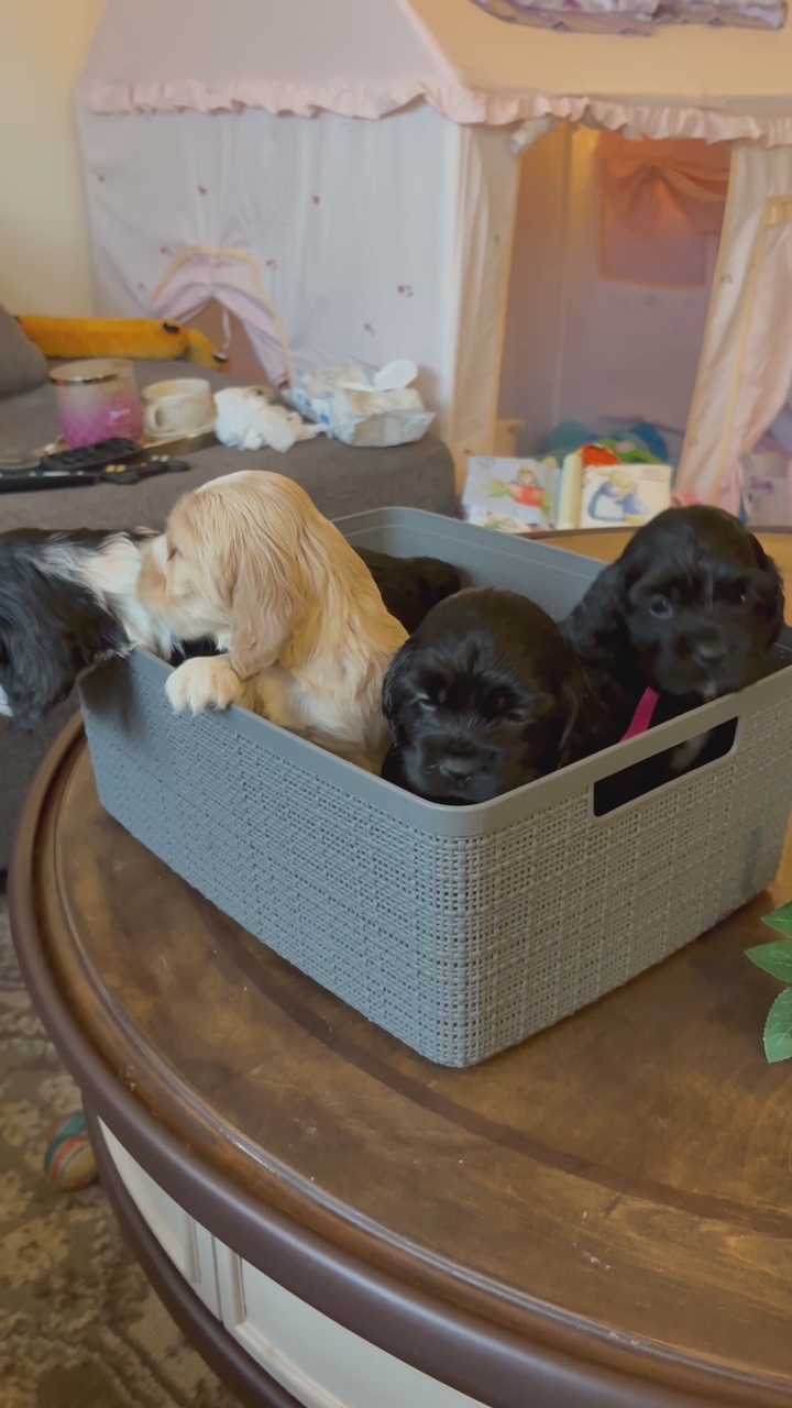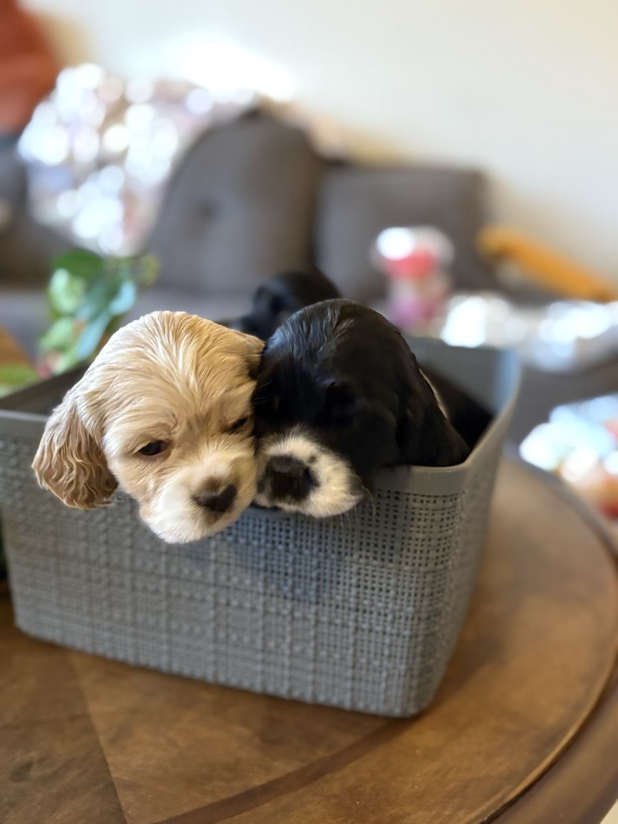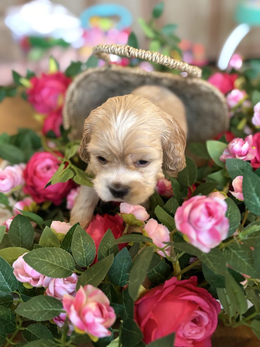 ZelleWe have 4 American Cocker Spaniel puppies! They will be 6 weeks old on Mother’s Day weekend. 3 females, 1 male.