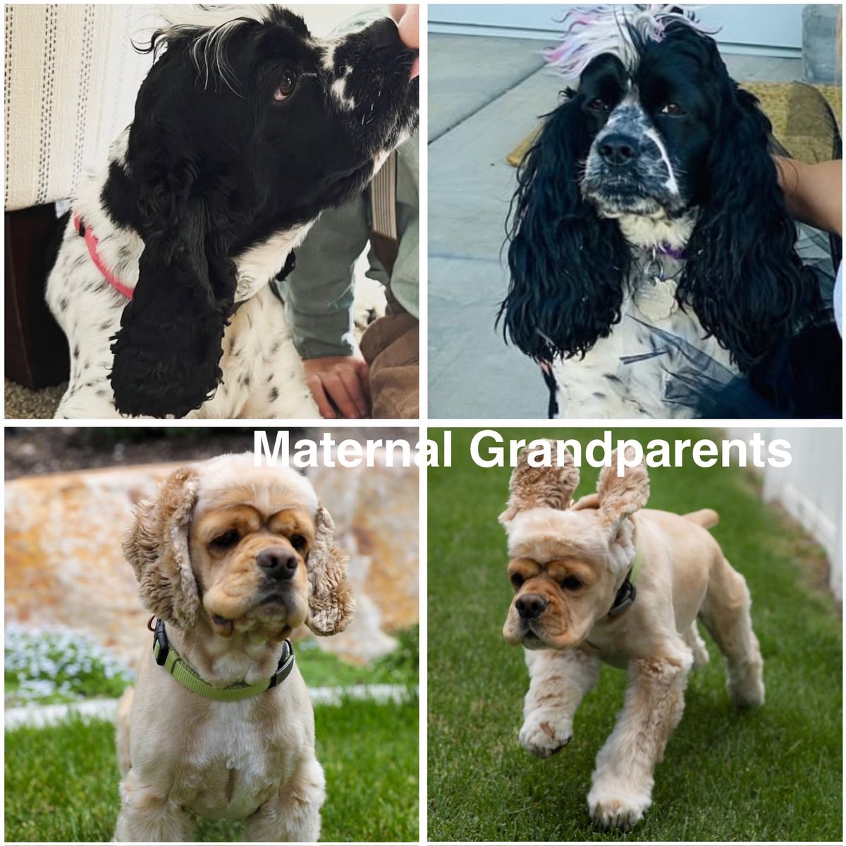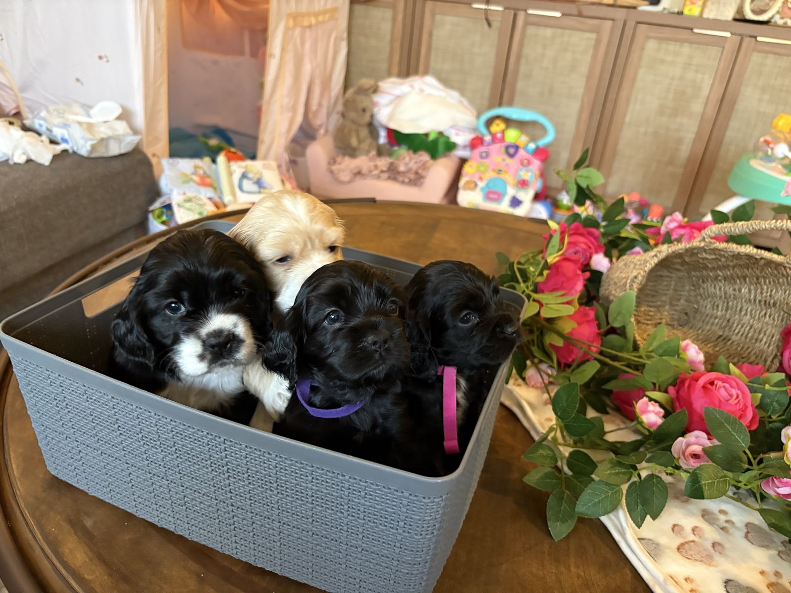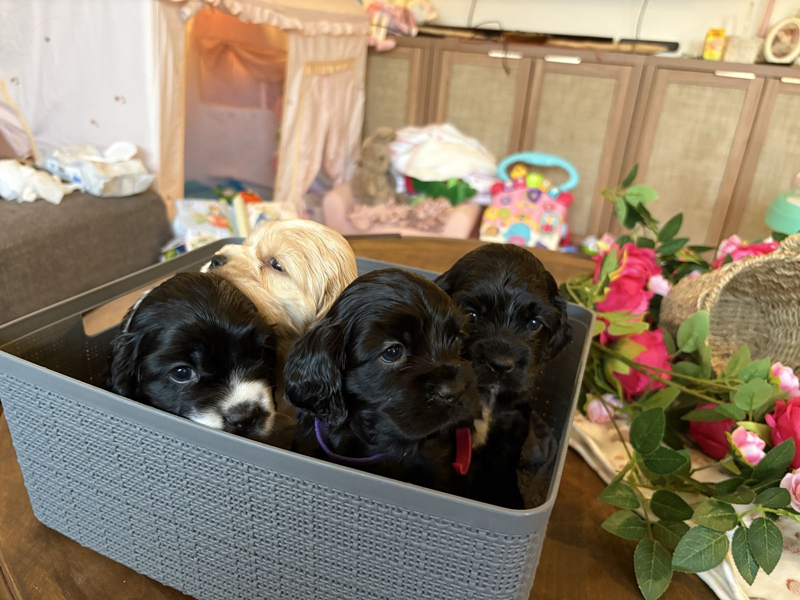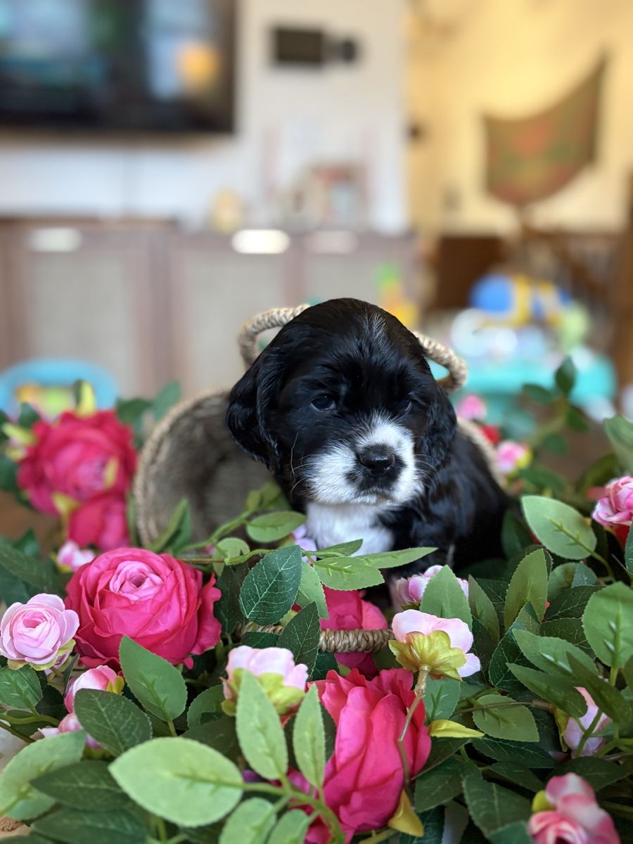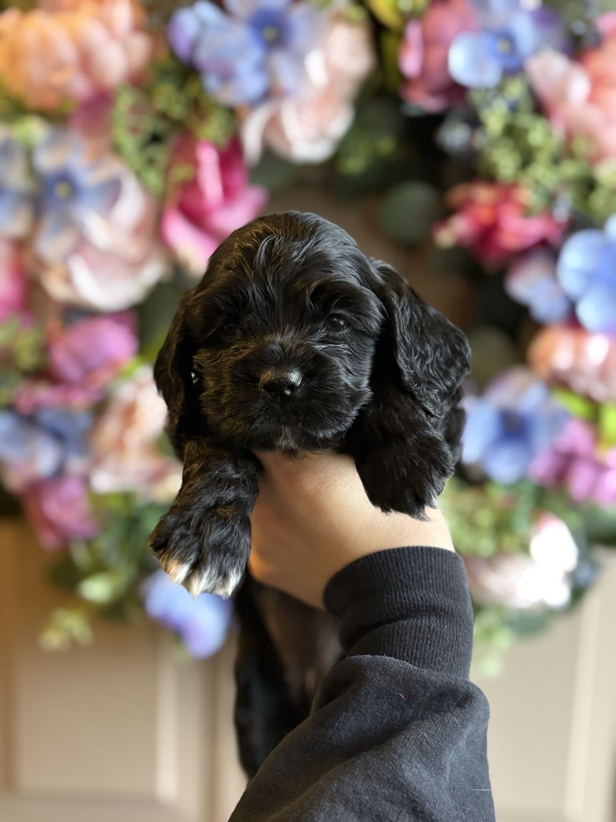 ZelleWe have 4 American Cocker Spaniel puppies! They will be 6 weeks old on Mother’s Day weekend. 3 females, 1 male.