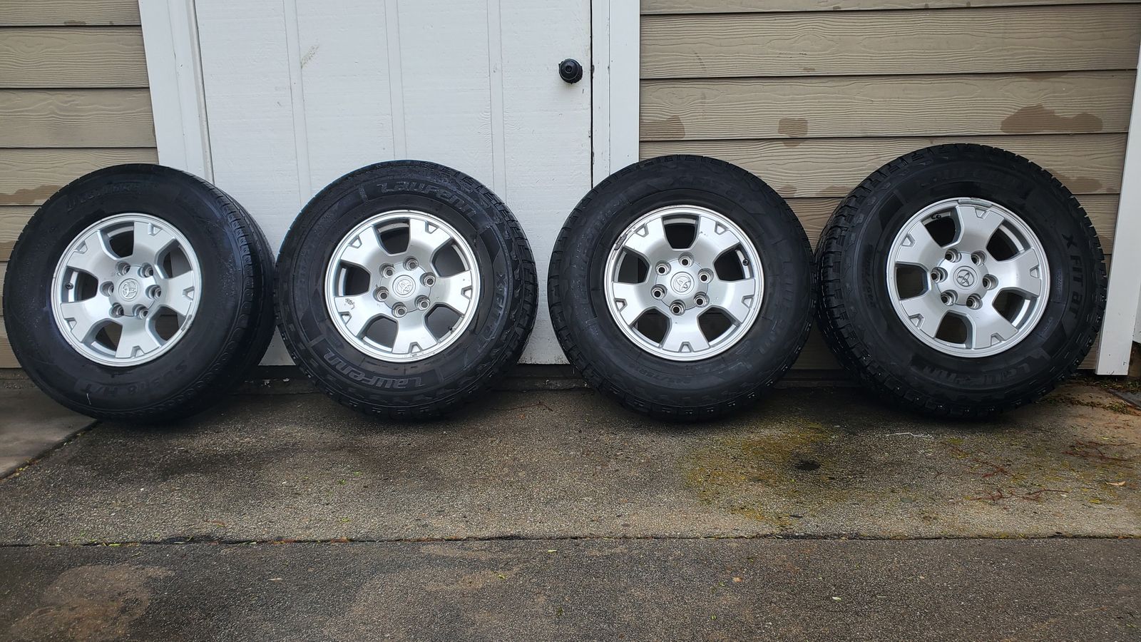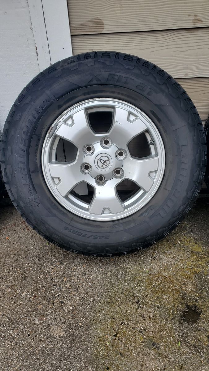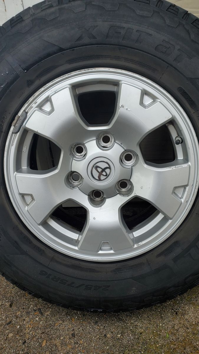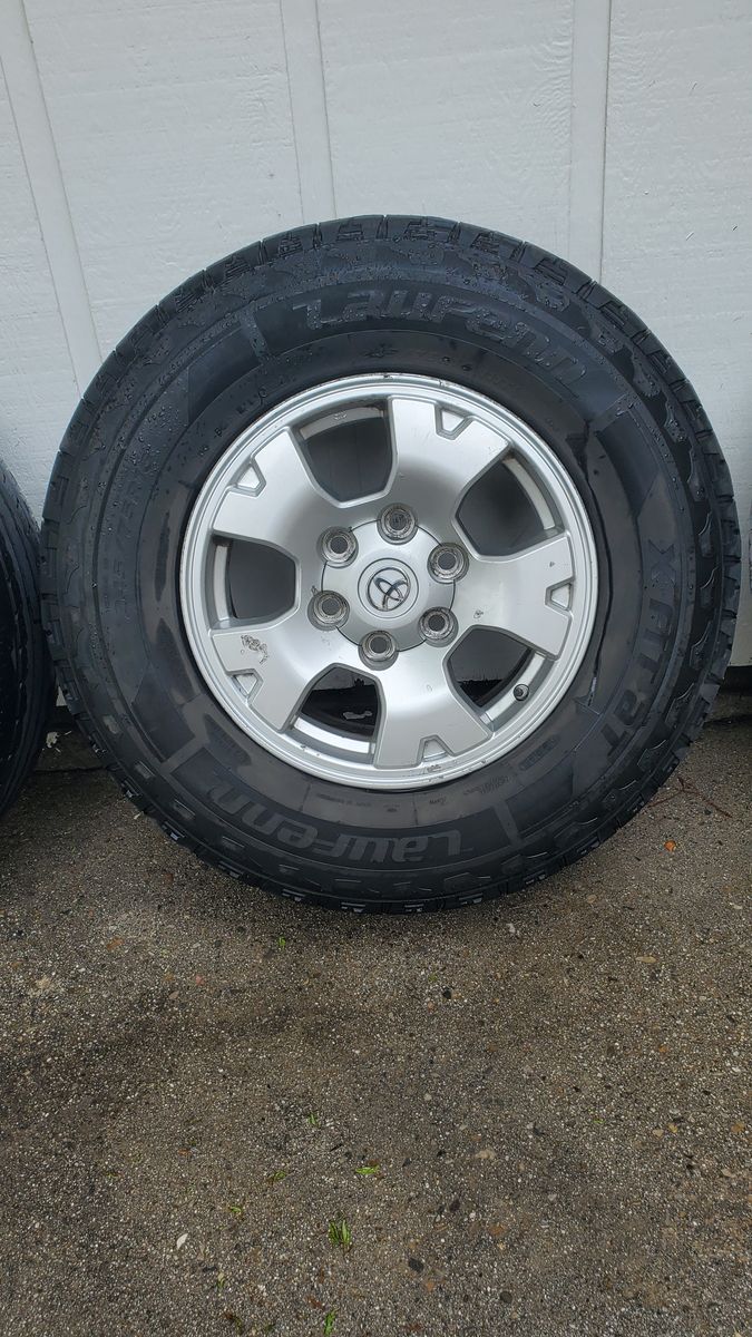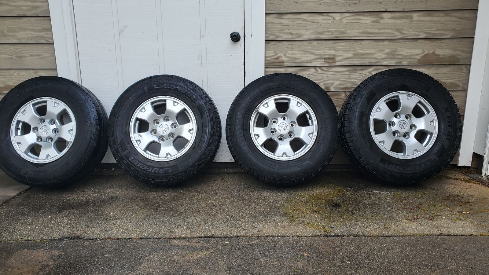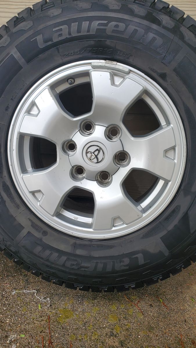 PayPalThese 6 lug tires and wheels 245/75R-16 came off of a 2012 Toyota Tacoma Crew Cab. The tires are tired and need replaced. One tire is doesn't match because a previous tire was ruined, so we just ran a off brand. The wheels have some light curb rash and a couple of areas that have started to corrode. 125/75-16 The tires are Laufenn Brand. $400 OBO.