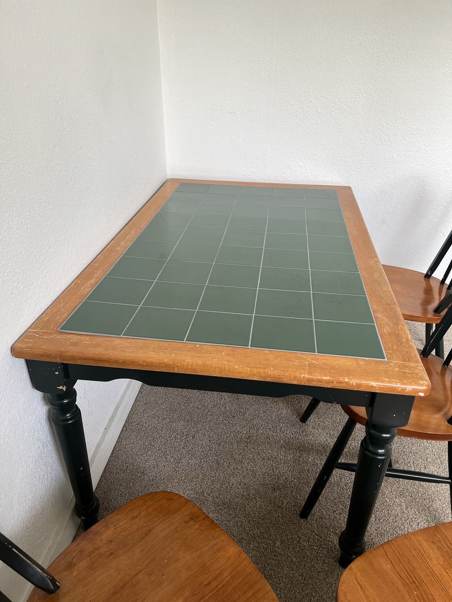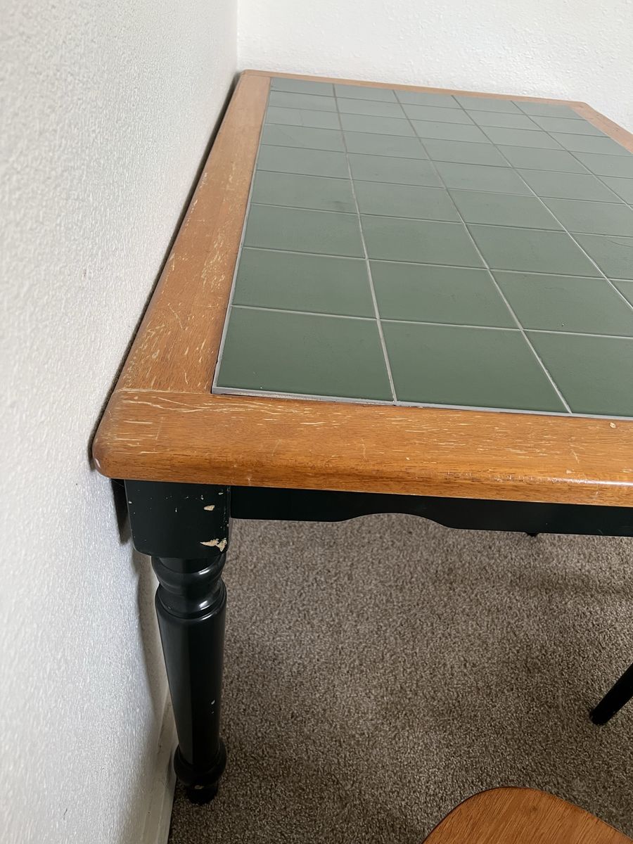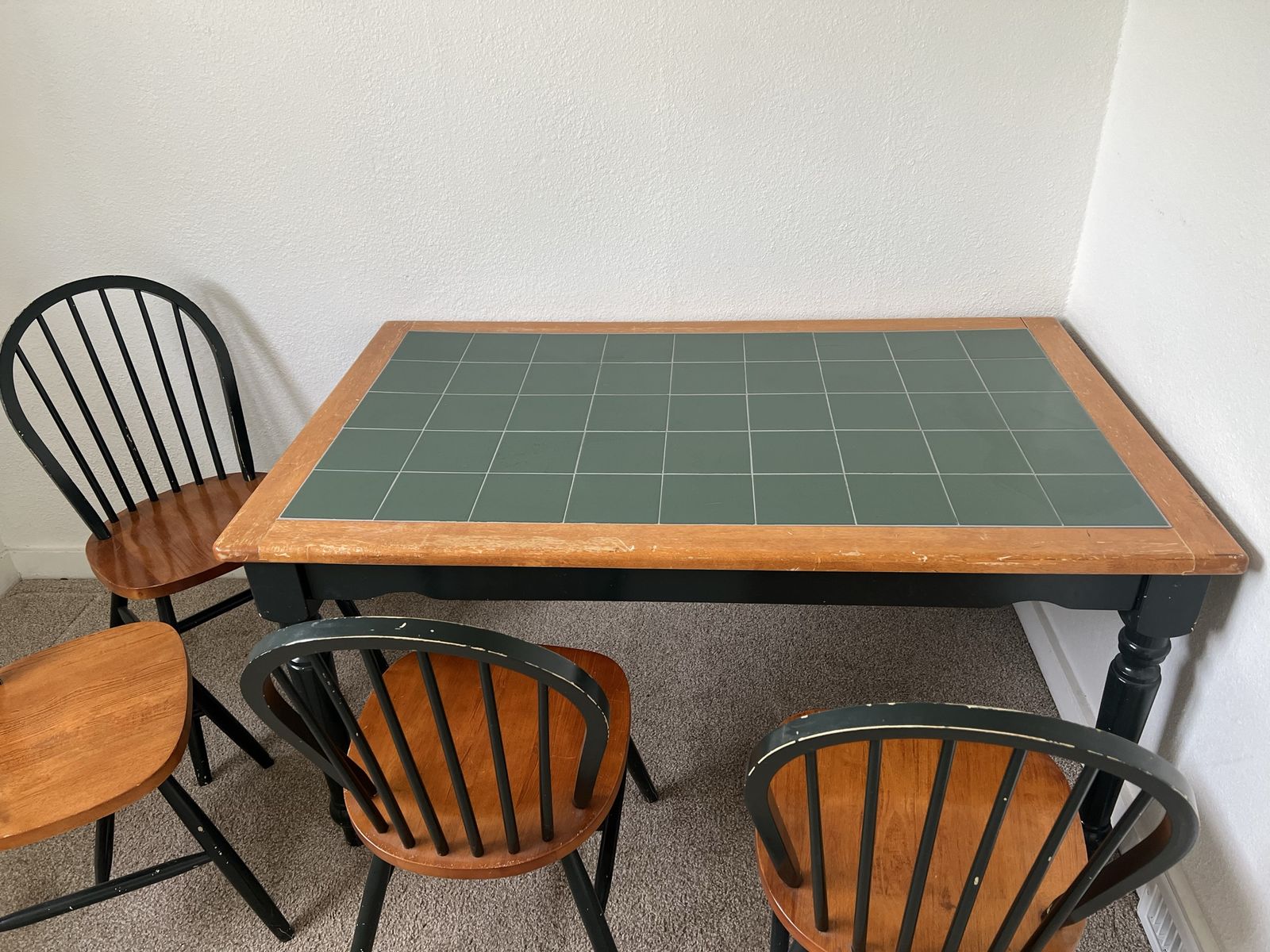 CashAppWood table with a green tile top and 4 matching chairs. We love it but listing it so cheap because we don't have room in our new place and need to get it out of our old place!