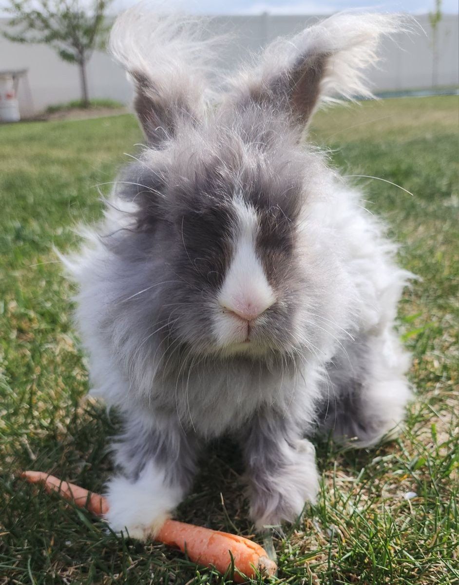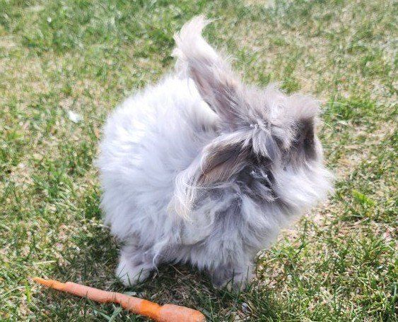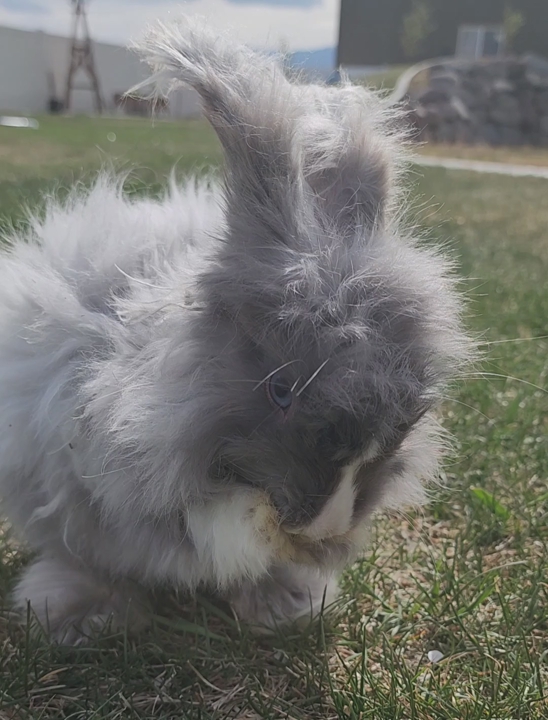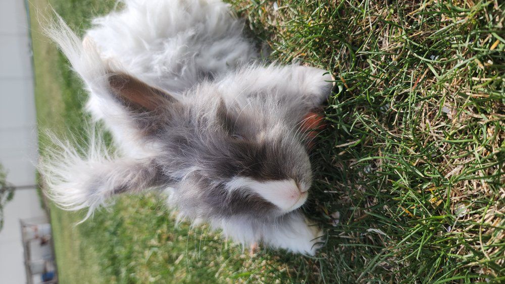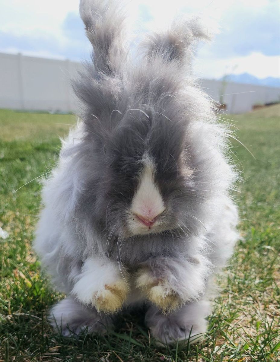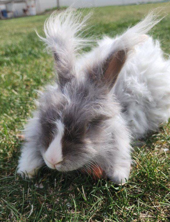 Beautiful light grey English Angora doe with a white blaze from forehead to nose and one white paw. She is 1 year old and has a soft, high-quality coat. She would make a great fiber rabbit, pet, or small breeding addition. Healthy and well cared for.