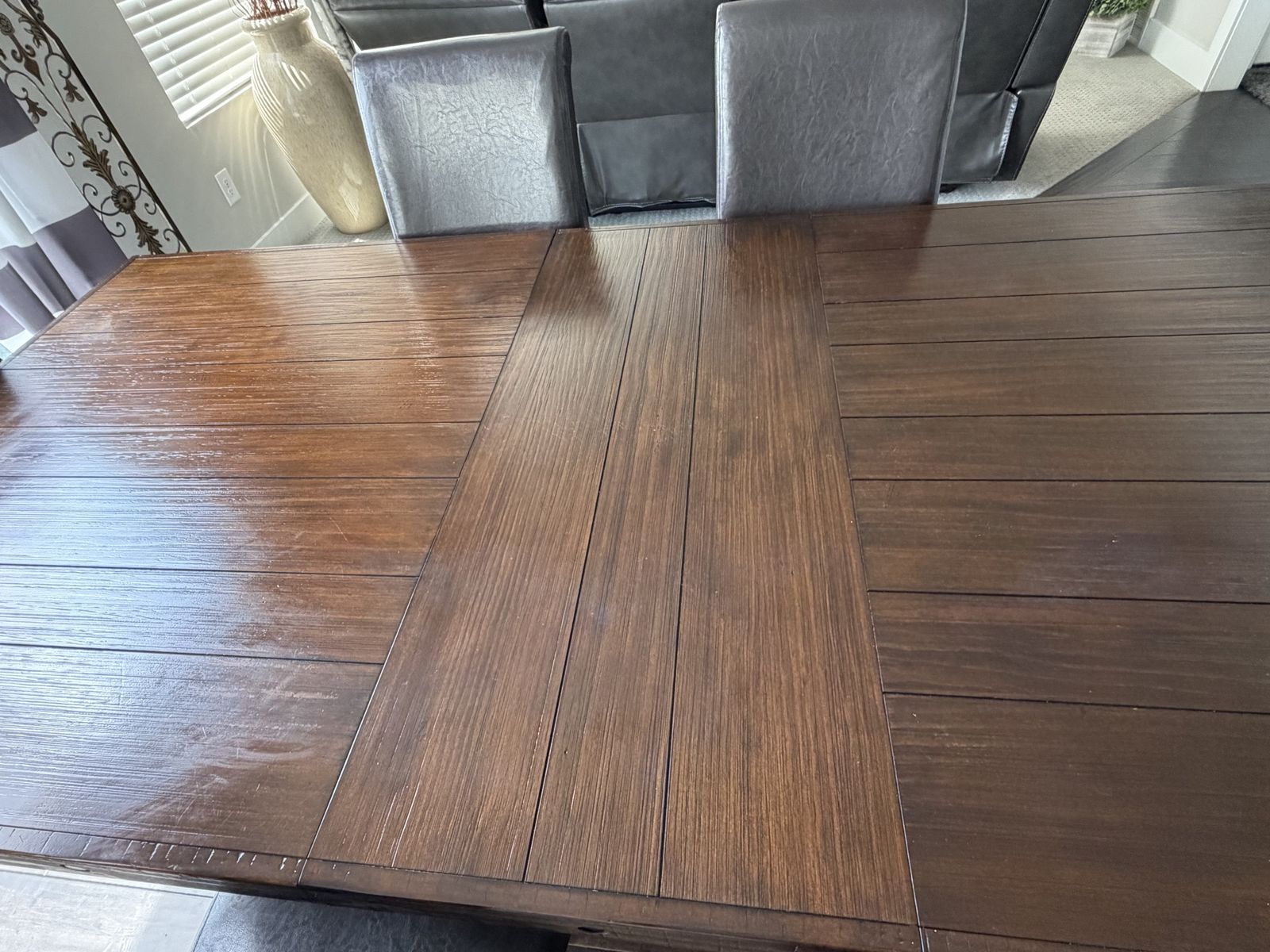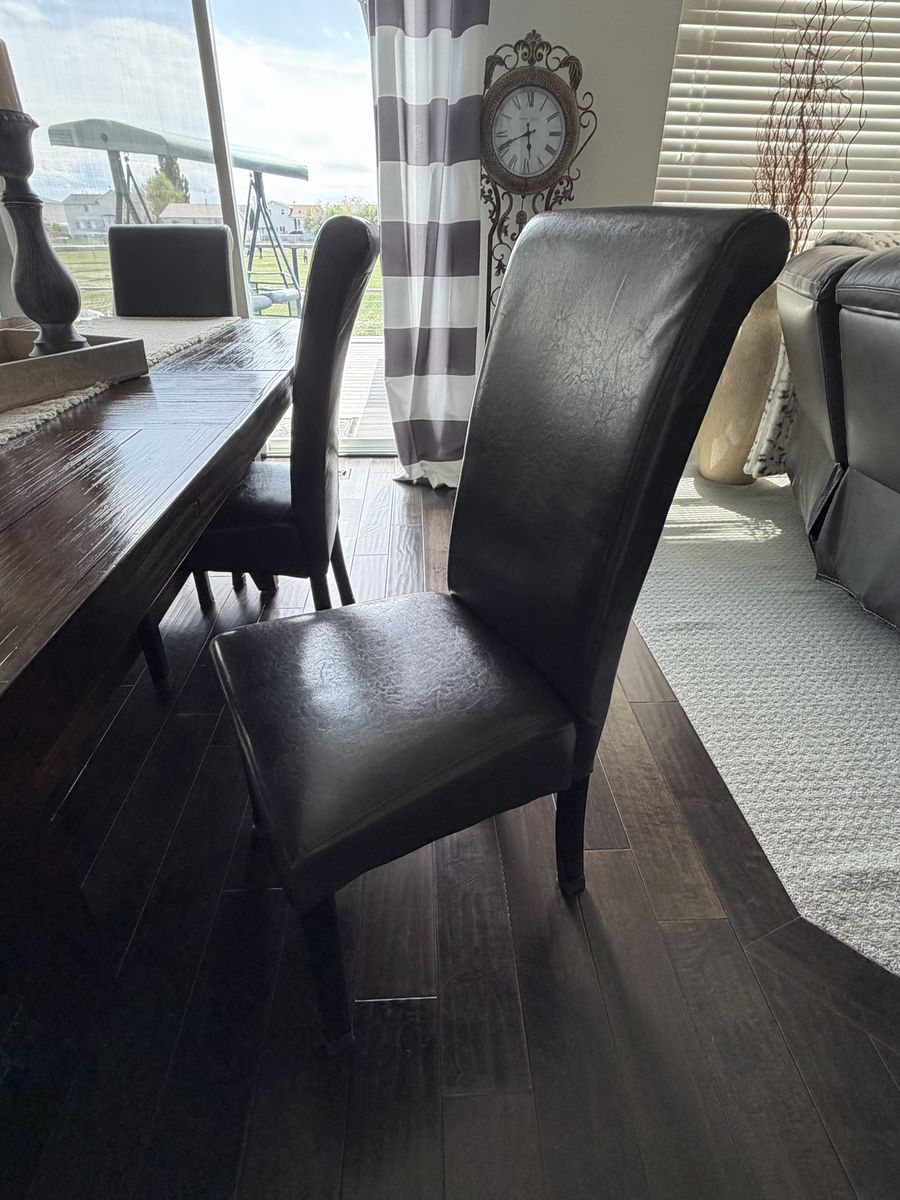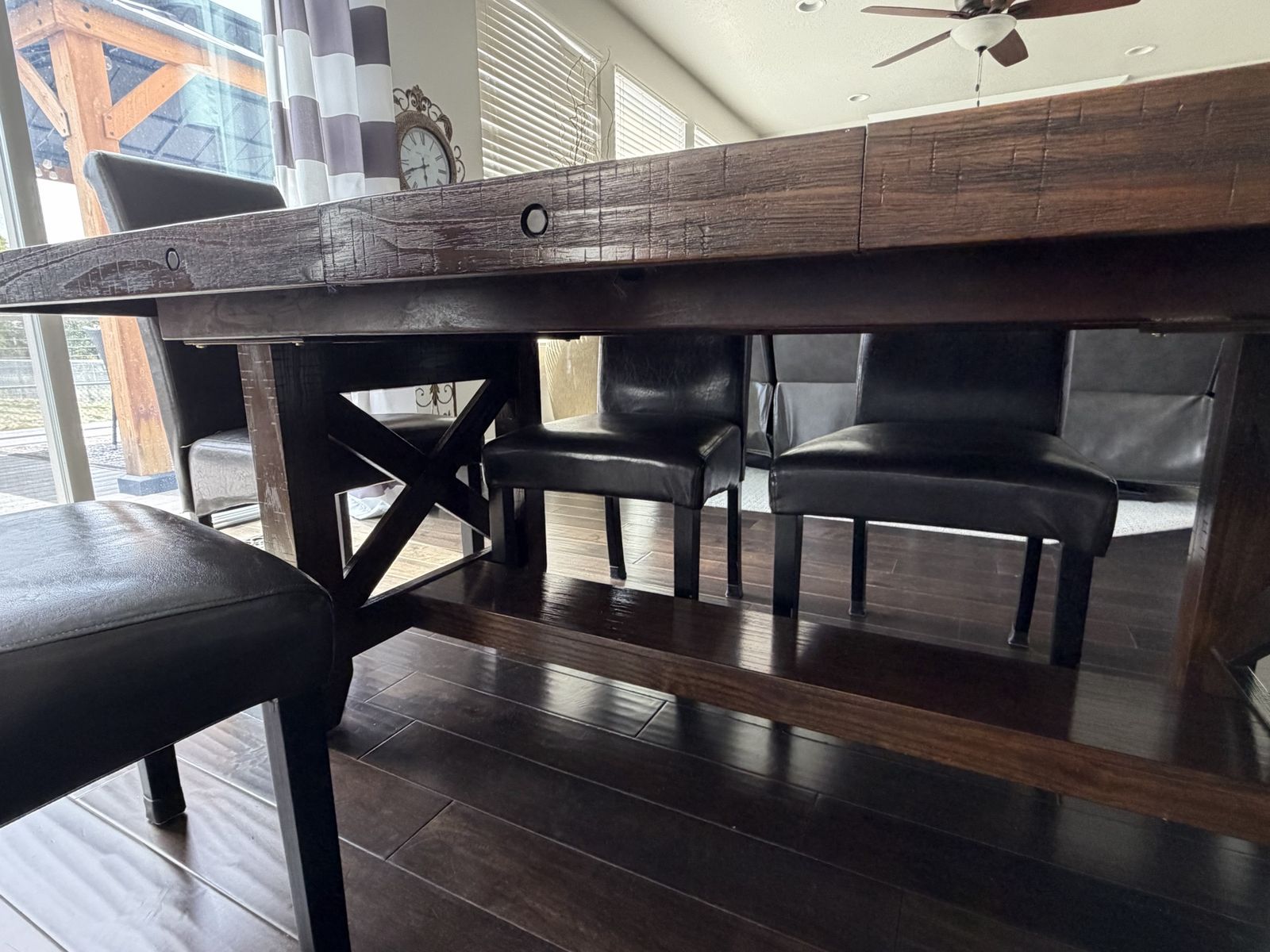 ZelleDark brown farmhouse style table with 6 faux leather chairs. 29 in. height, 90 in. length, 42 in. width. These measurements are with leaf insert. Insert can be removed for smaller table. Excellent shape. $325 Table decor not included. Must pick up.