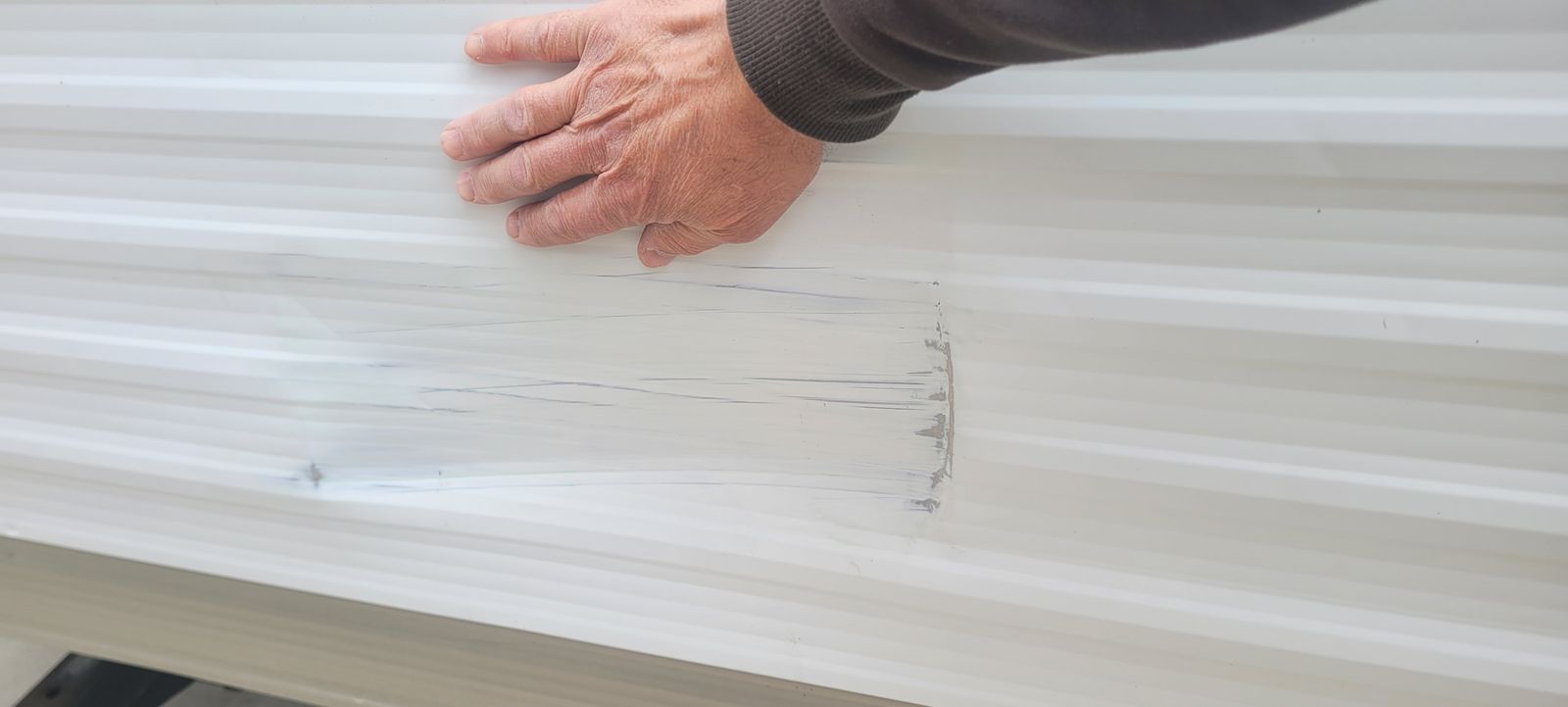 **The only exterior damage other than normal bumps and scrapes is the indentation shown in the photo.