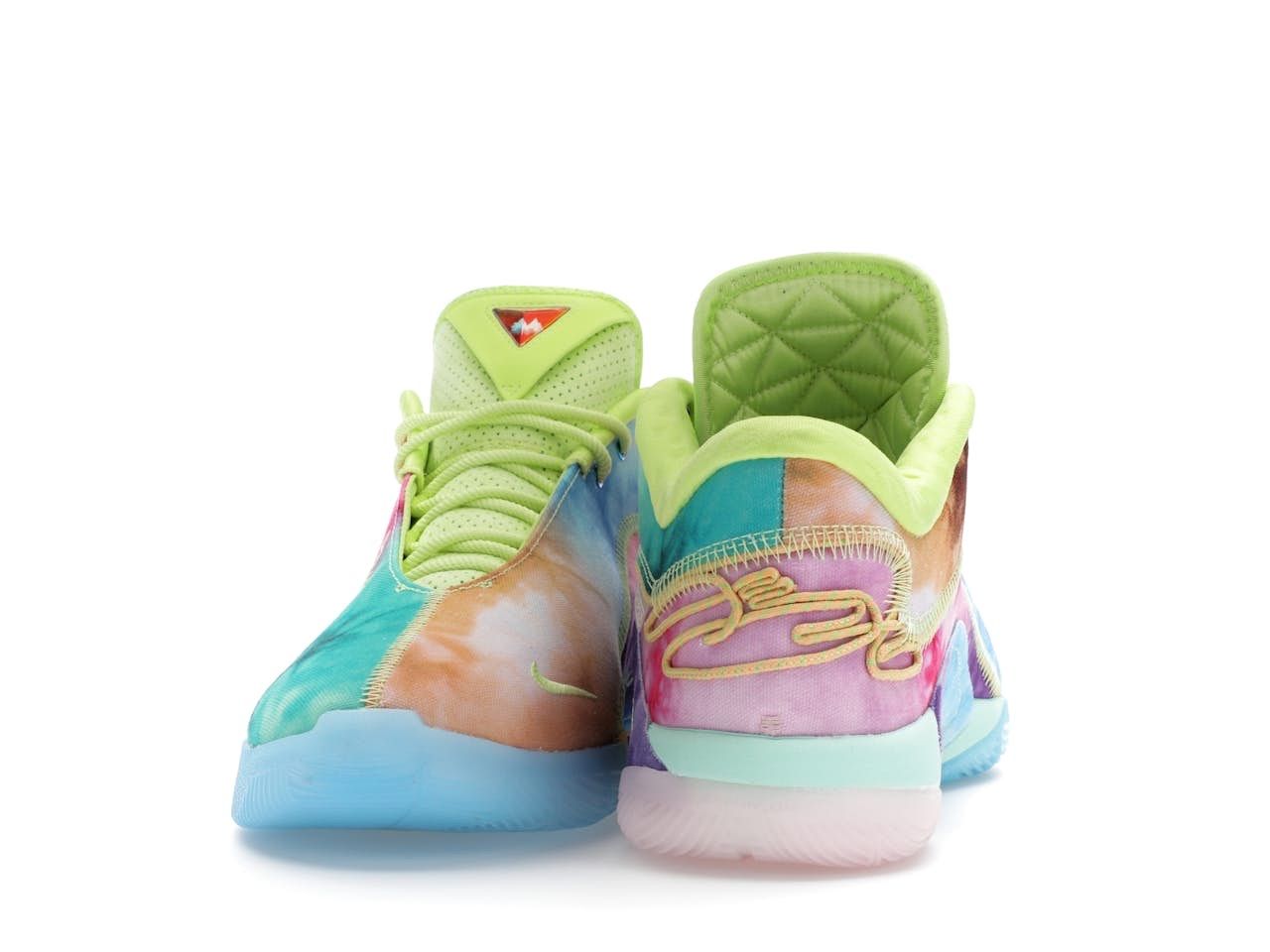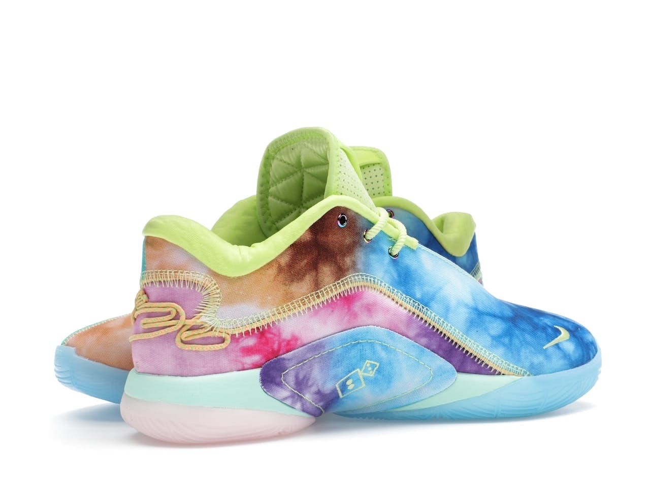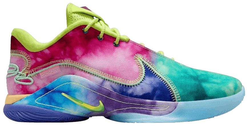 The Monopoly x Nike LeBron 22 'Tie-Dye' delivers the third installment in the collaborative series. A tie-dye print in red, green, blue and orange adds a swirling blend of colors to the textile upper, featuring a Swoosh outlined in exposed yellow stitching. A dice graphic adorns the medial quarter panel, while LeBron James' signature graces the back heel in yellow embroidery. A discreet Monopoly label decorates the lateral heel. The multicolor tie-dye design continues on a full-length Cushlon 2.0 midsole with springy Zoom Air cushioning in the forefoot and heel.
