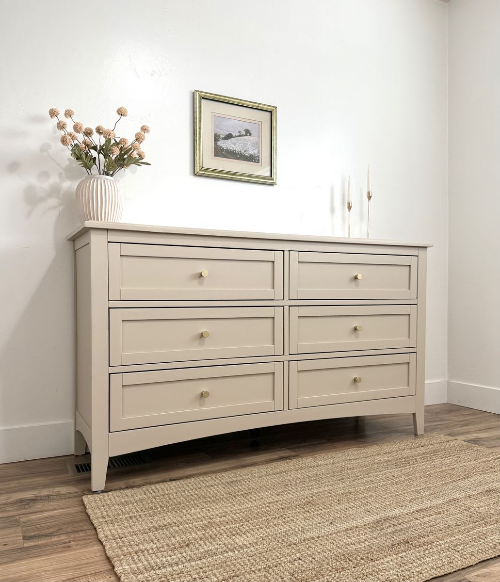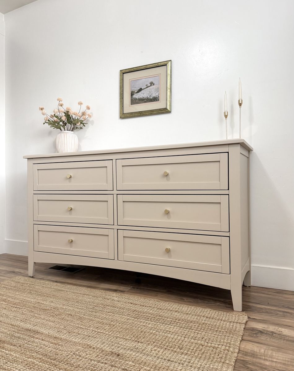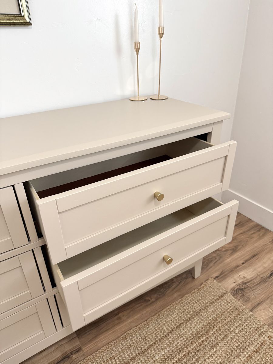VenmoPrice is for set. Beautiful dresser and single nightstand. In a neutral beige to match any space. Paired with minimalist golden knobs. Top drawers are felt lined. All drawers have dovetail backs. Not solid wood. Delivery available for a fee.