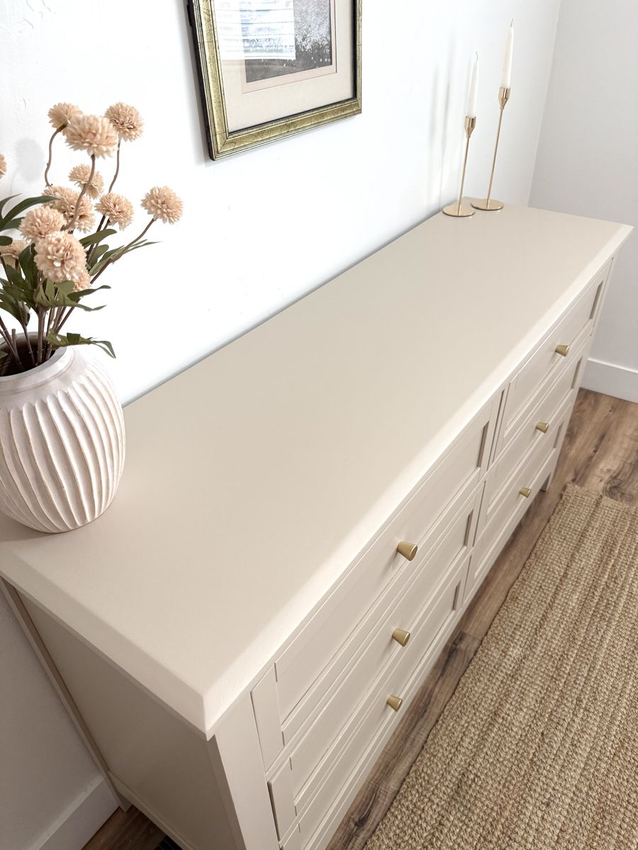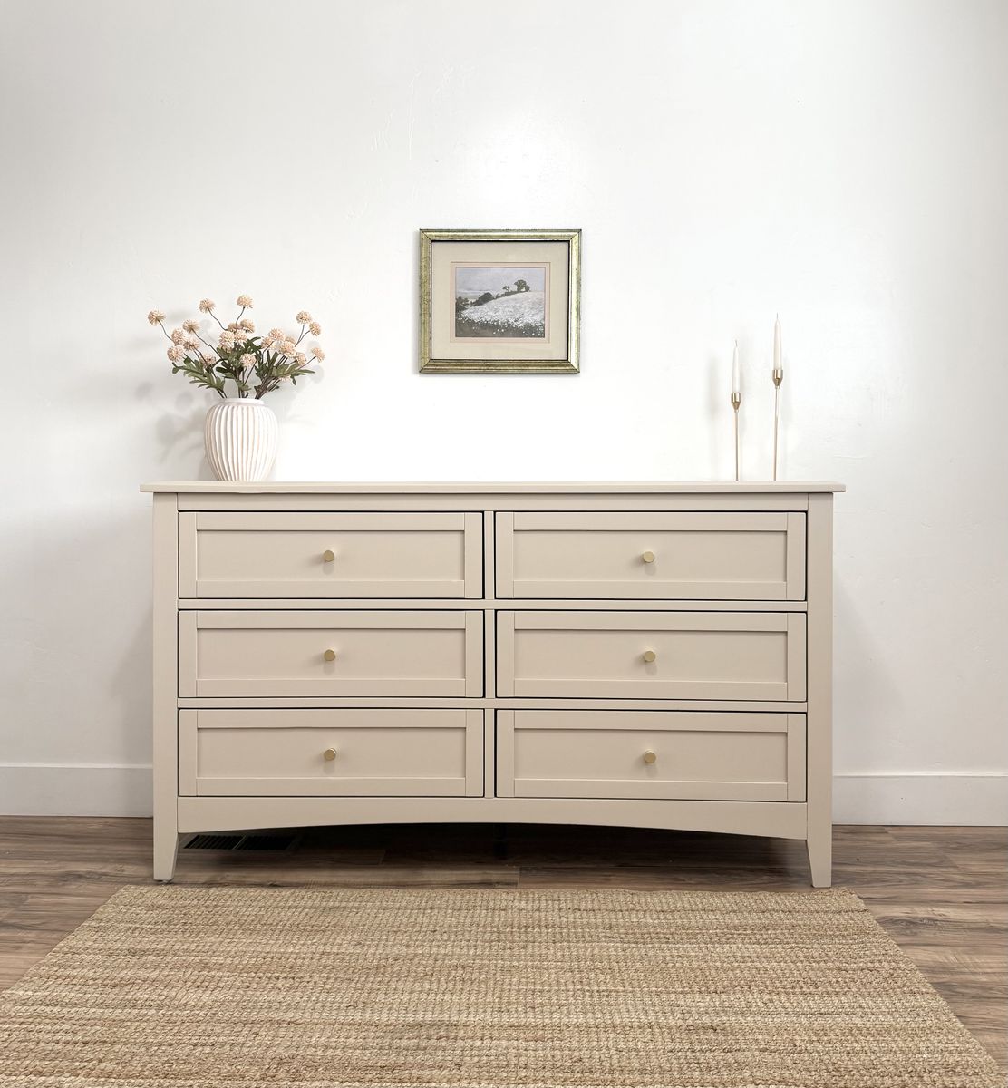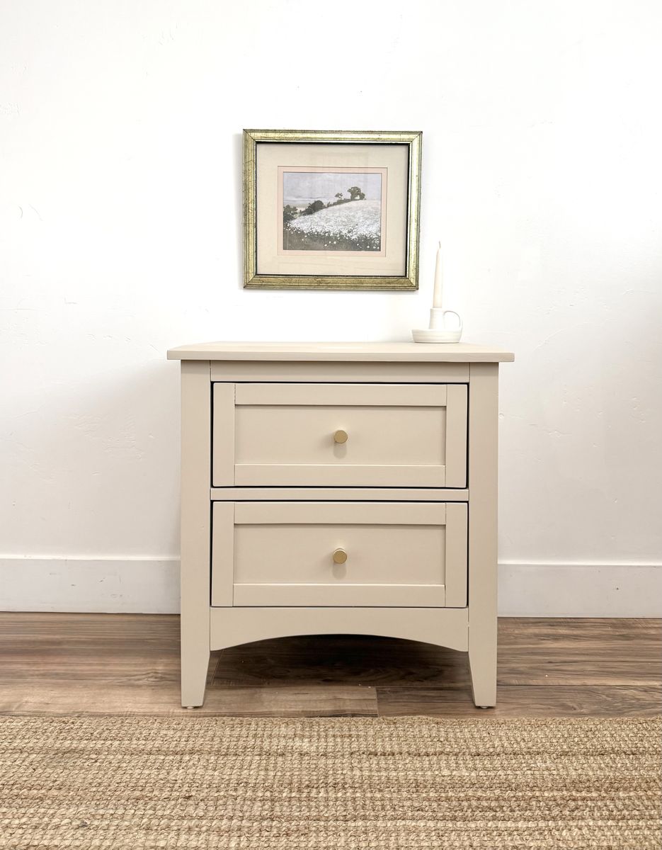 VenmoPrice is for set. Beautiful dresser and single nightstand. In a neutral beige to match any space. Paired with minimalist golden knobs. Top drawers are felt lined. All drawers have dovetail backs. Not solid wood. Delivery available for a fee.