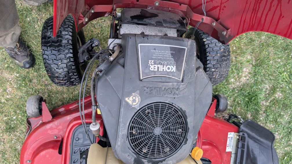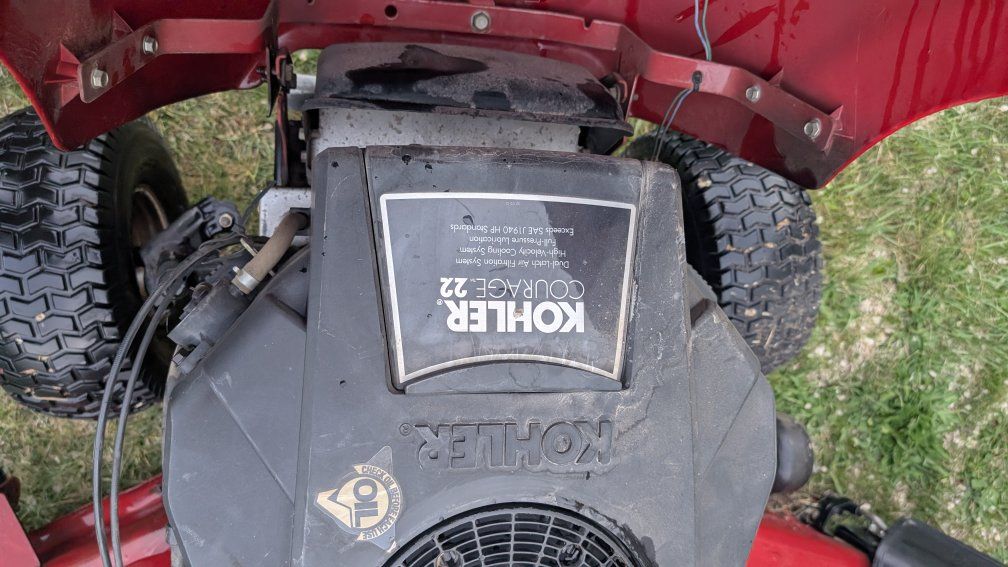 Starts easily (louder/clunkier starter gear than others) and runs great. 22hp Kohler Courage engine. twin cylinder. 50 in deck. 3 chamber grass catcher.