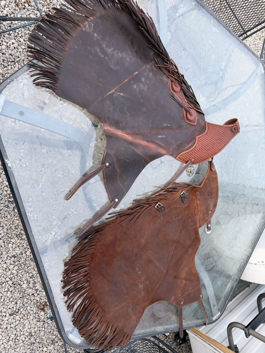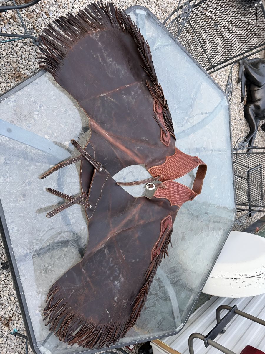 Lightly used Chink chaps. Dark brown leather with basket stamped belt. Double leg straps. Belt size will fit 32”-36”. Length from top of belt to fringe ends is 32”. $150 Located in Bluffdale. Text 801-631-6085